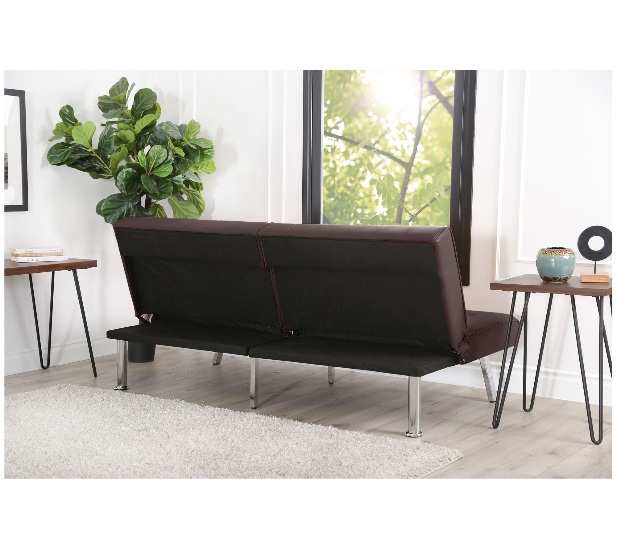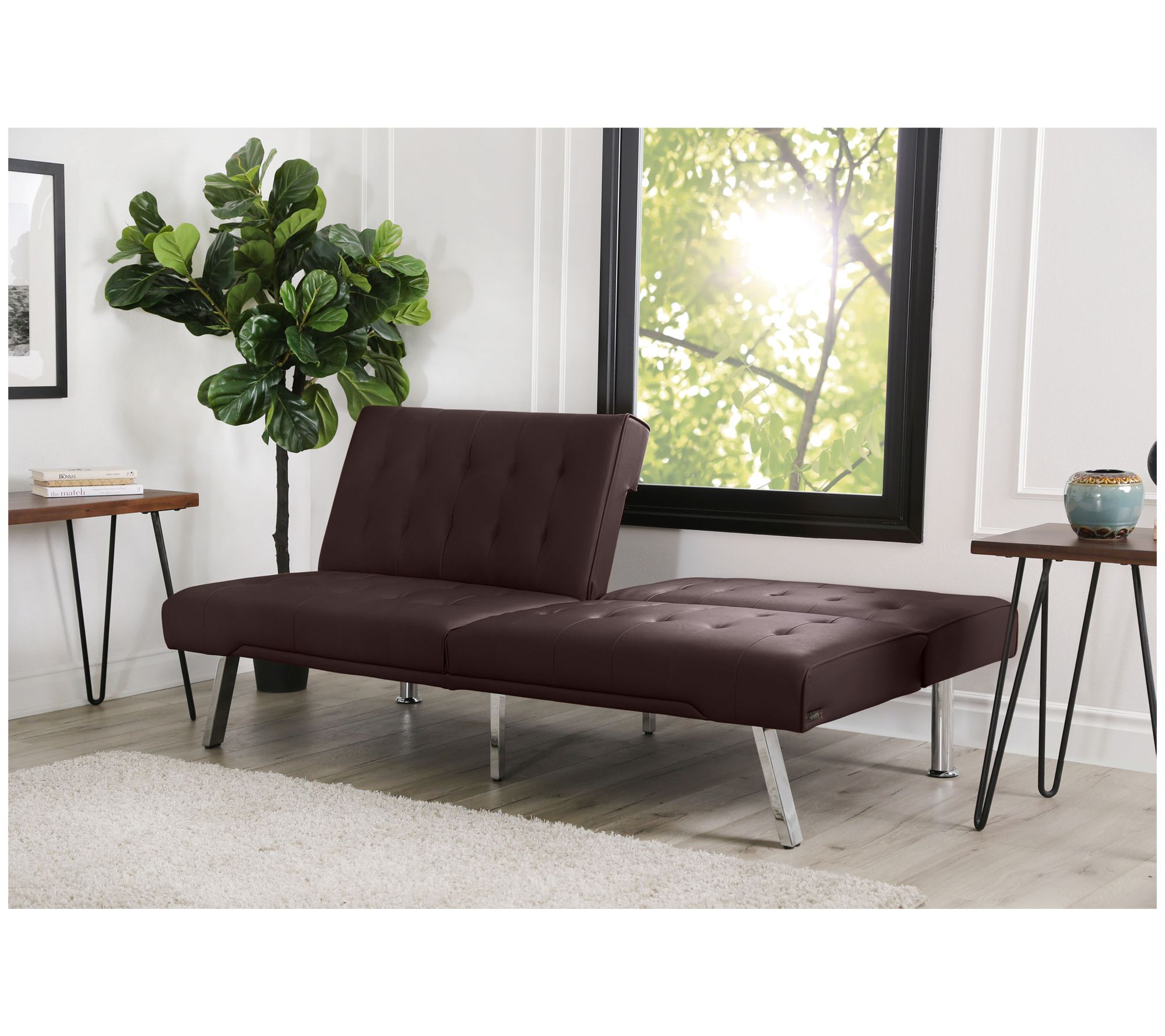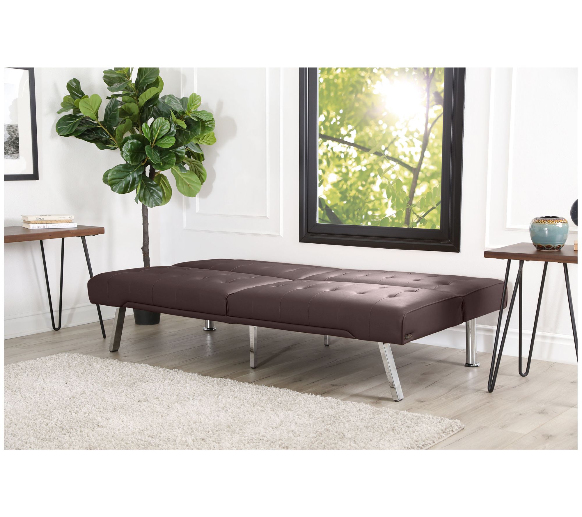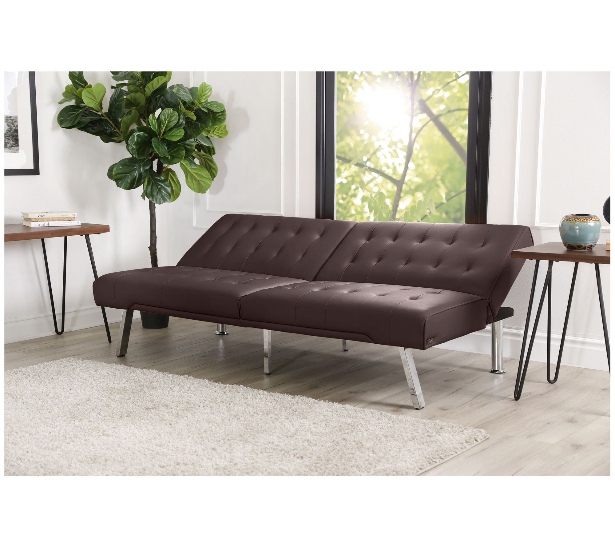 Perfect for your home or office, this versatile futon is both a sofa and a bed, maximizing your space. The refined faux leather upholstery is complemented with tufting, while the high-density foam and convoluted foam cushions offer an exquisite level of relaxation. From Abbyson Living.