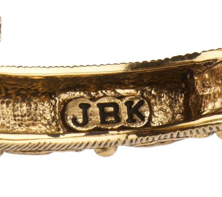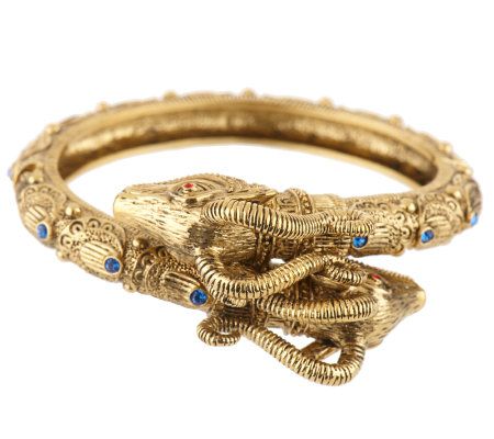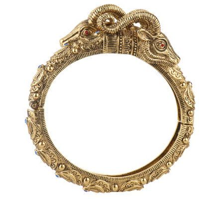 Exotic style stands the test of time via elegant finishes and rich details. A ram's head accents each end of this cuff bracelet, accented with round bezel-set red crystals as the eyes. Ornate details like with round bezel-set blue crystals finish the alluring piece. From the Jacqueline Kennedy Collection.
