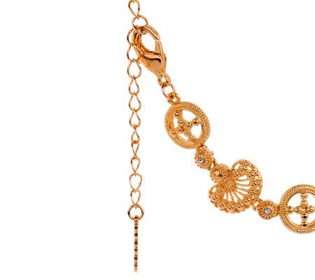 • Openwork circular links with cross design alternate with seashells links and clear crystals along necklace; pin/pendant has oval, clear crystals on seashells, cushion-shaped pink crystal at center, bow and arrow in background; oval, pink crystal dangles below