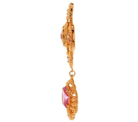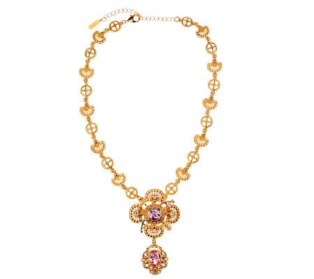 Resplendent and regal. Whether you wear it as a necklace, or remove the pendant to wear as a pin, this magnificent piece adds incomparable beauty to your look. The intricately designed pin/pendant radiates with a cushion-shaped pink crystal at the center, and an oval pink crystal dangling below. From the Jacqueline Kennedy Collection.