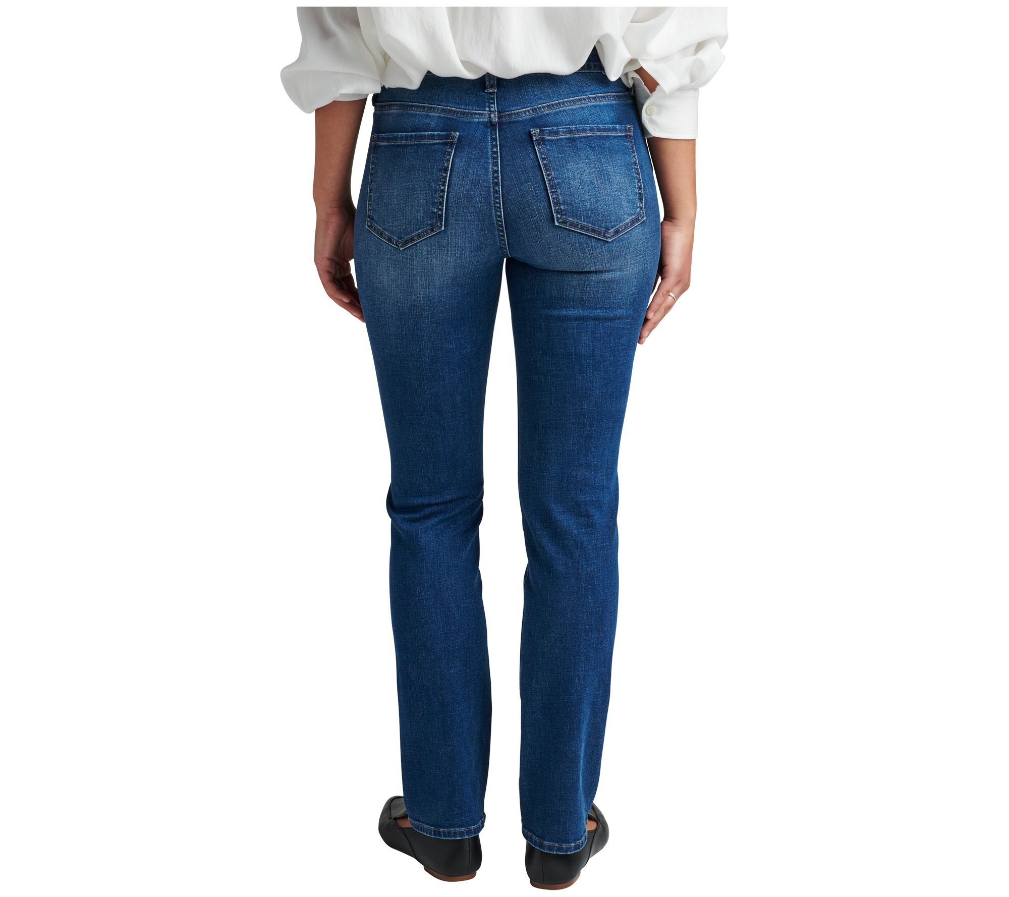 Features: mid rise, interior elastic, straight leg