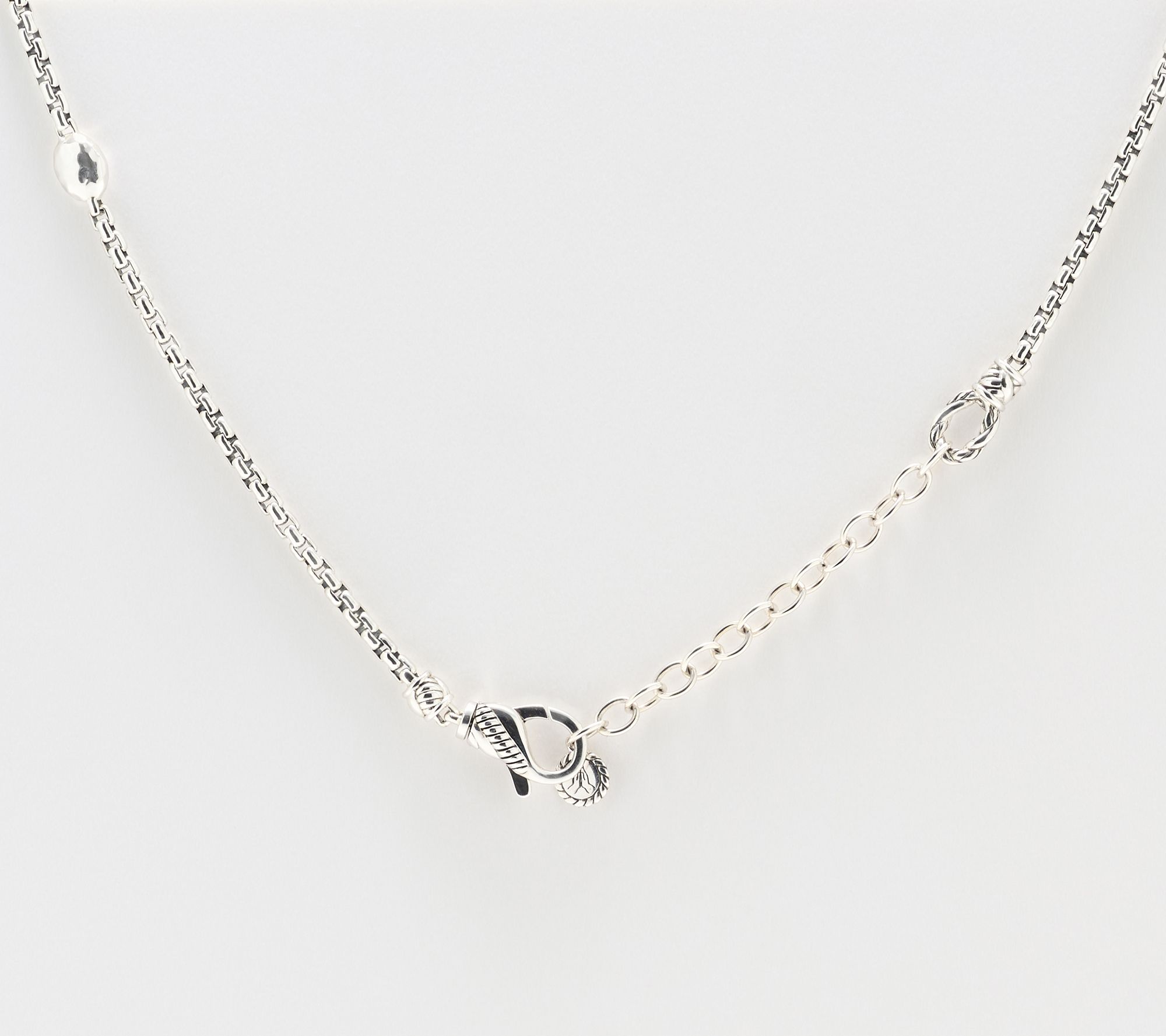 Inspired by the landscapes of Ireland, this sterling silver box chain necklace features hammered cobblestone stations that add dimension and charm. The polished and fantastically oxidized finish highlights every detail, making it a standout piece whether layered, worn solo, or paired with everyday looks. From JAI.