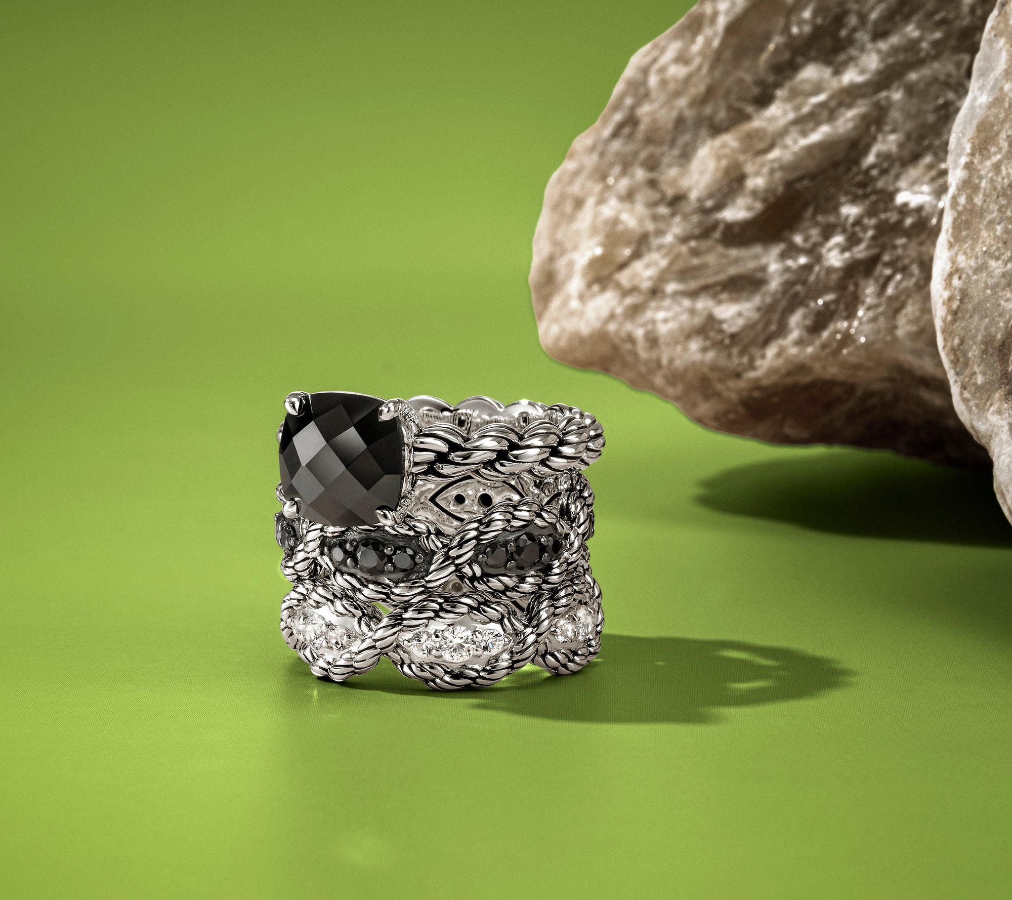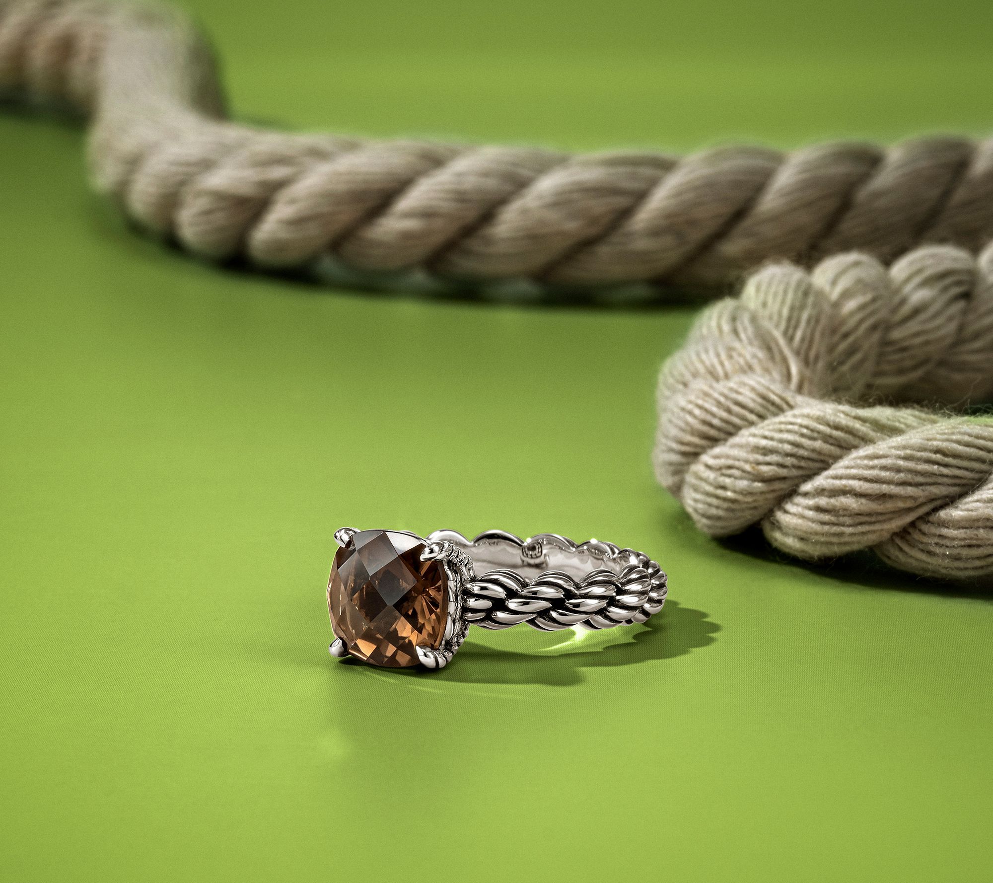 Cara rope band and basket-weave texture; cushion-cut, prong-set 9mm gemstone; polished, oxidized finish
