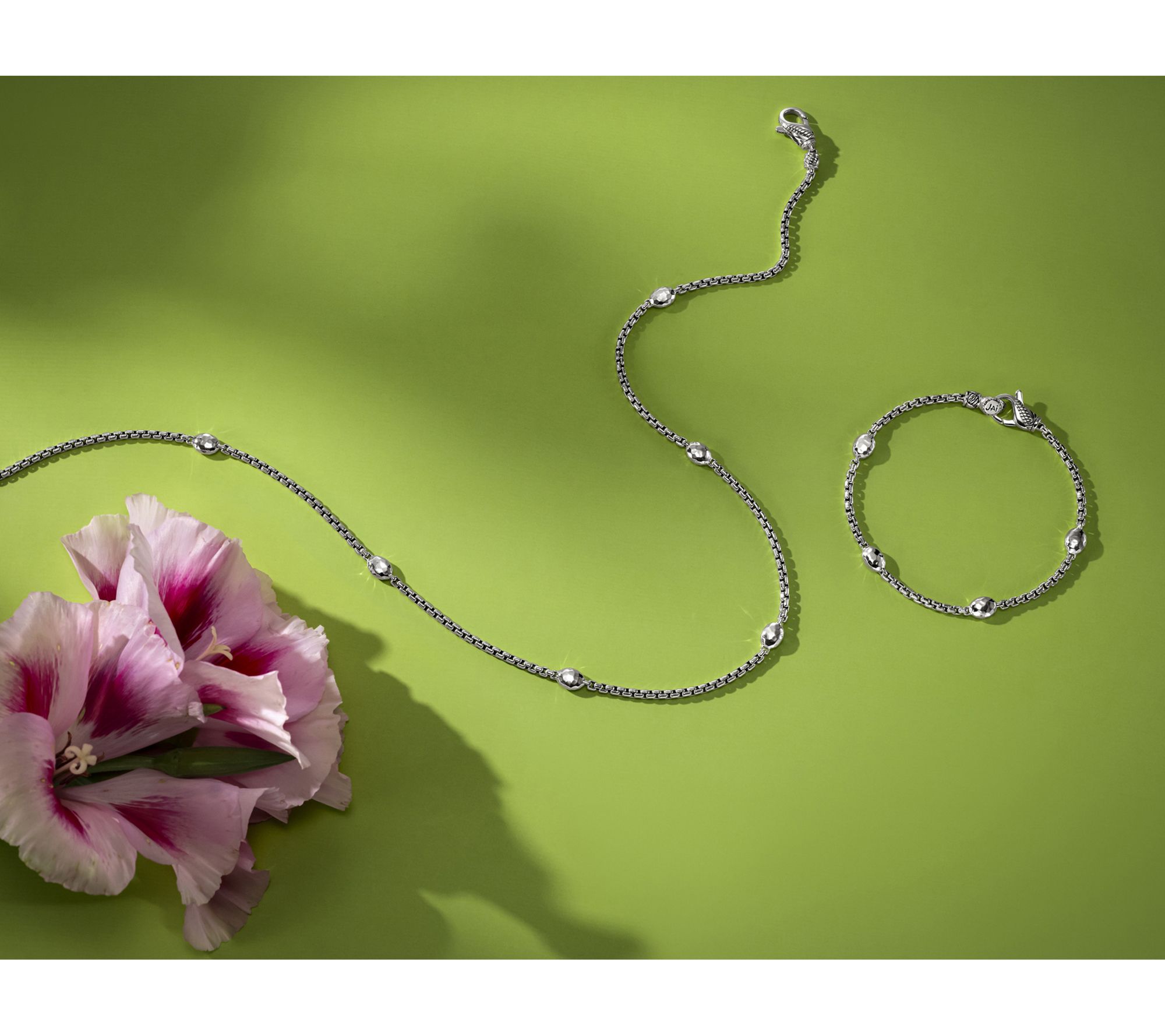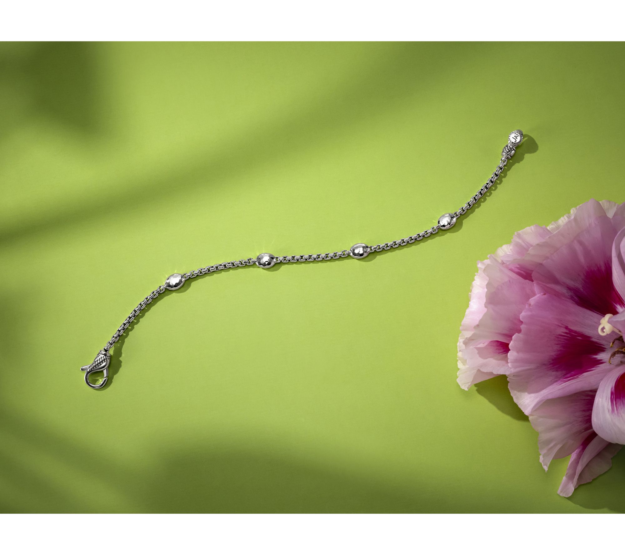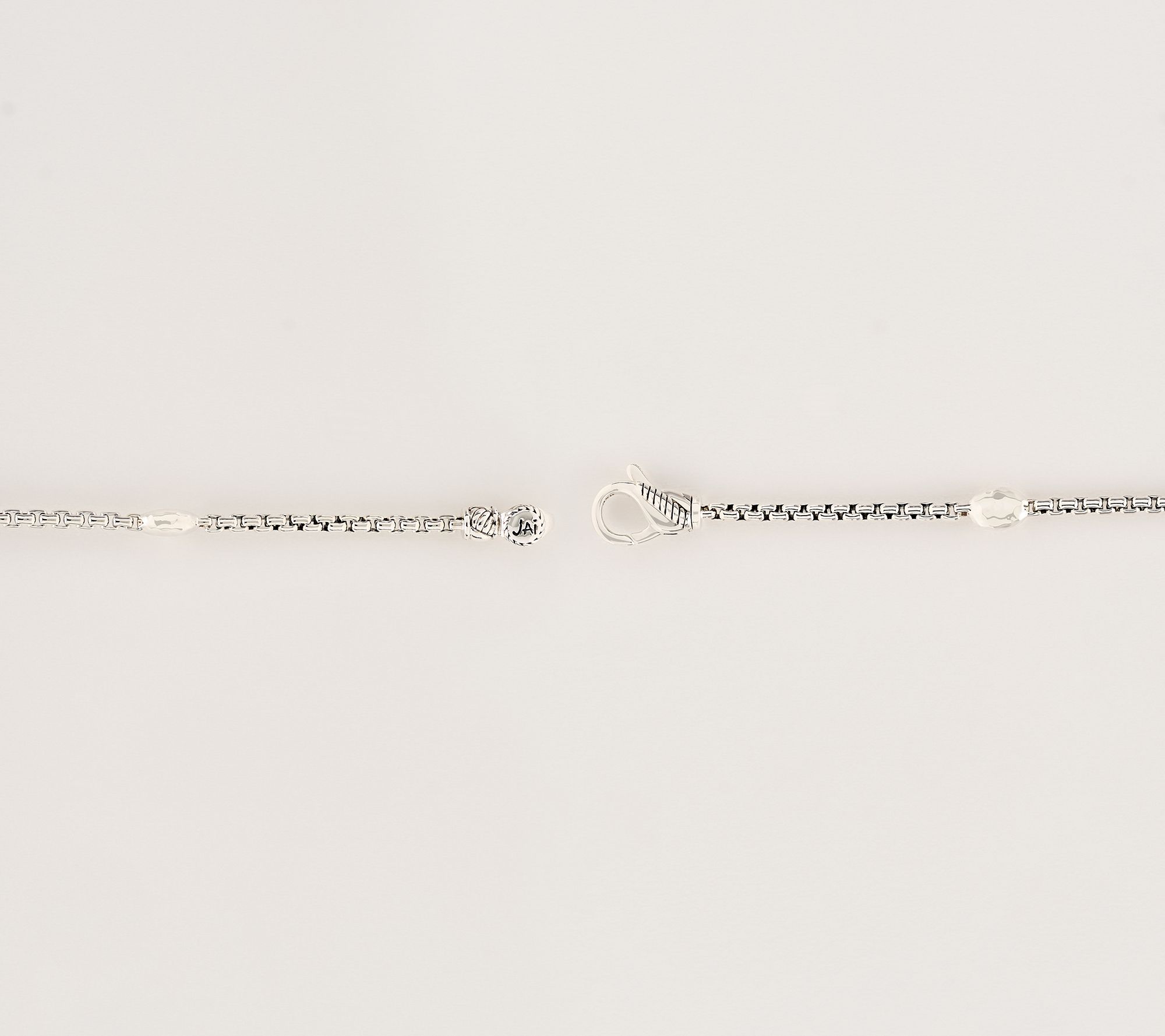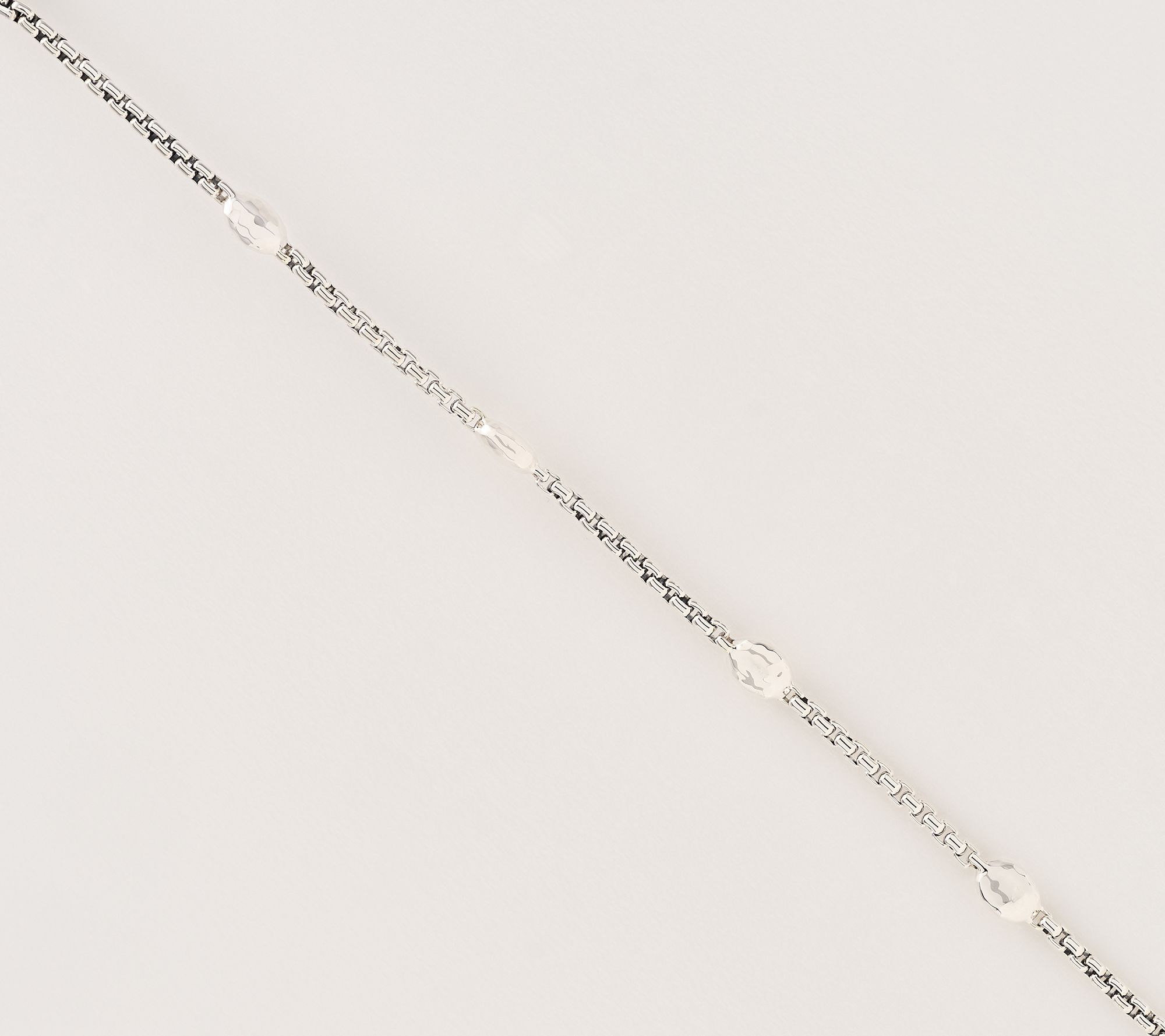 Inspired by Ireland's rich textures, this sterling silver box chain bracelet adds dimension to your everyday stack or solo style. The hammered Cobblestone station and Sukhothai texture clasp bring extra detail, while its polished and oxidized finish delivers a modern, easy-to-wear accent for casual outings or special occasions. From JAI.