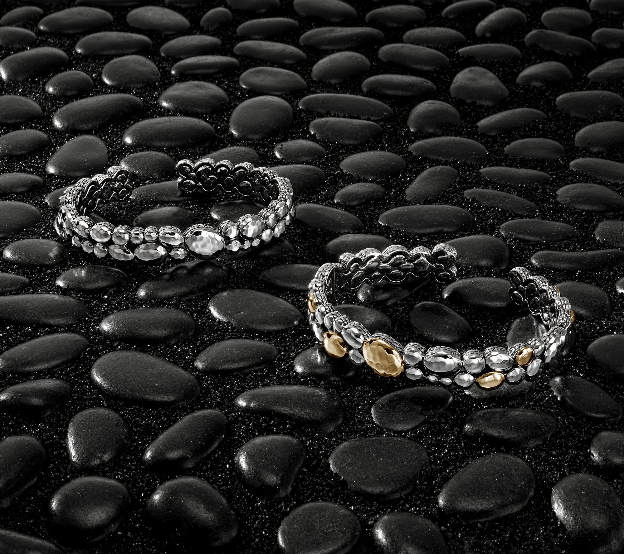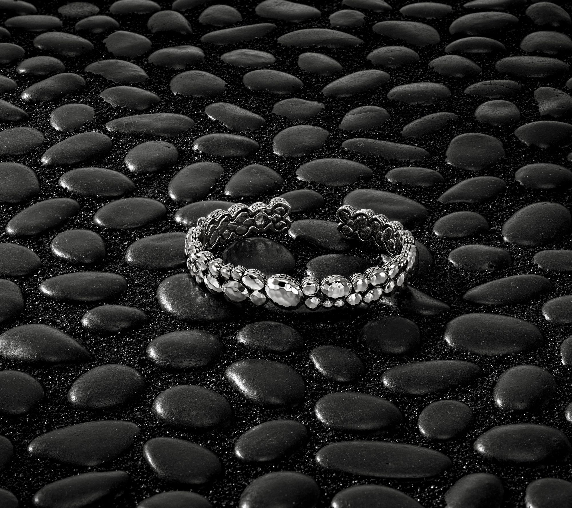 A bold style statement, this sterling silver cuff bracelet from the Ireland Collection features hammered and basketweave textures for striking dimension and character. The slightly oxidized and polished finish brings depth to the cobblestone design, while the hinged opening makes it easy to slip on. From JAI.