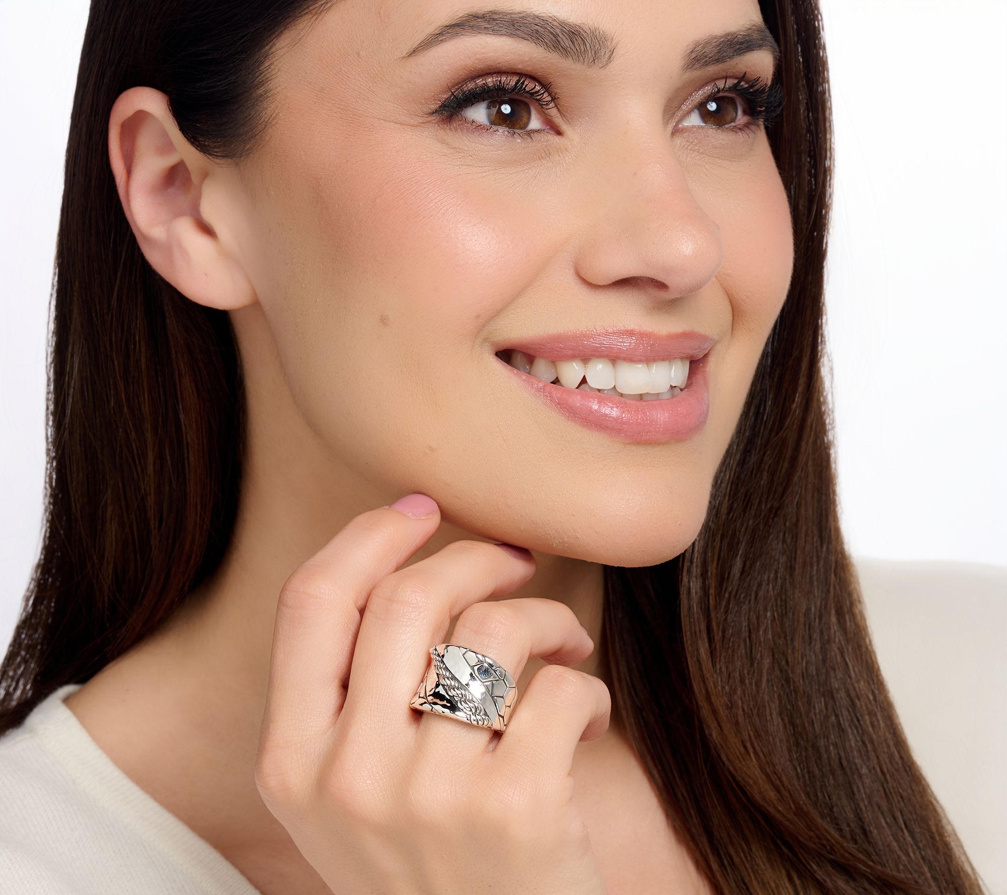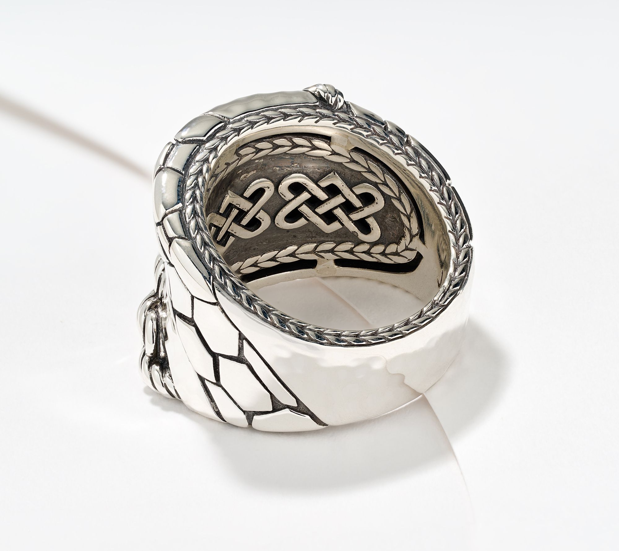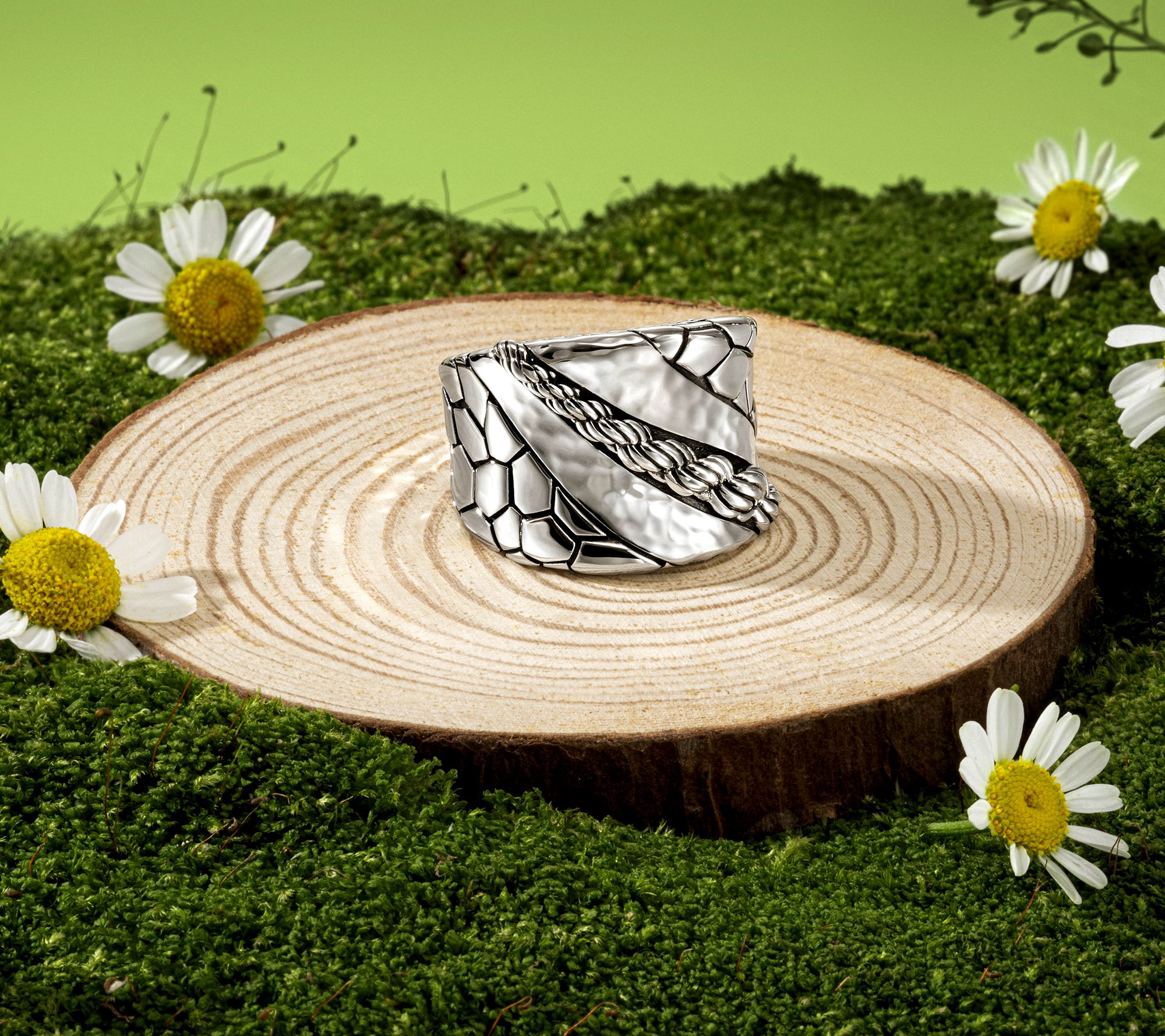 The spirit of Northern Ireland's rugged coastline inspires this sterling silver saddle ring from JAI, where bold textures echo the legend of Giant's Causeway and woven rope motifs speak to Celtic heritage. Whether paired with your favorite cable knit sweater or worn to a casual dinner, its polished and oxidized finish brings memorable artistry to everyday style. From JAI.