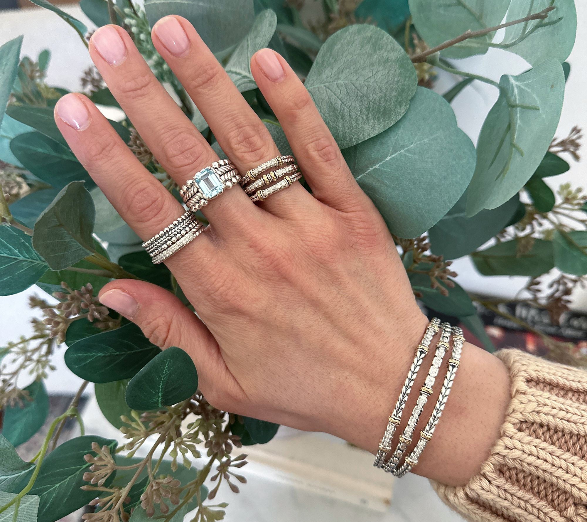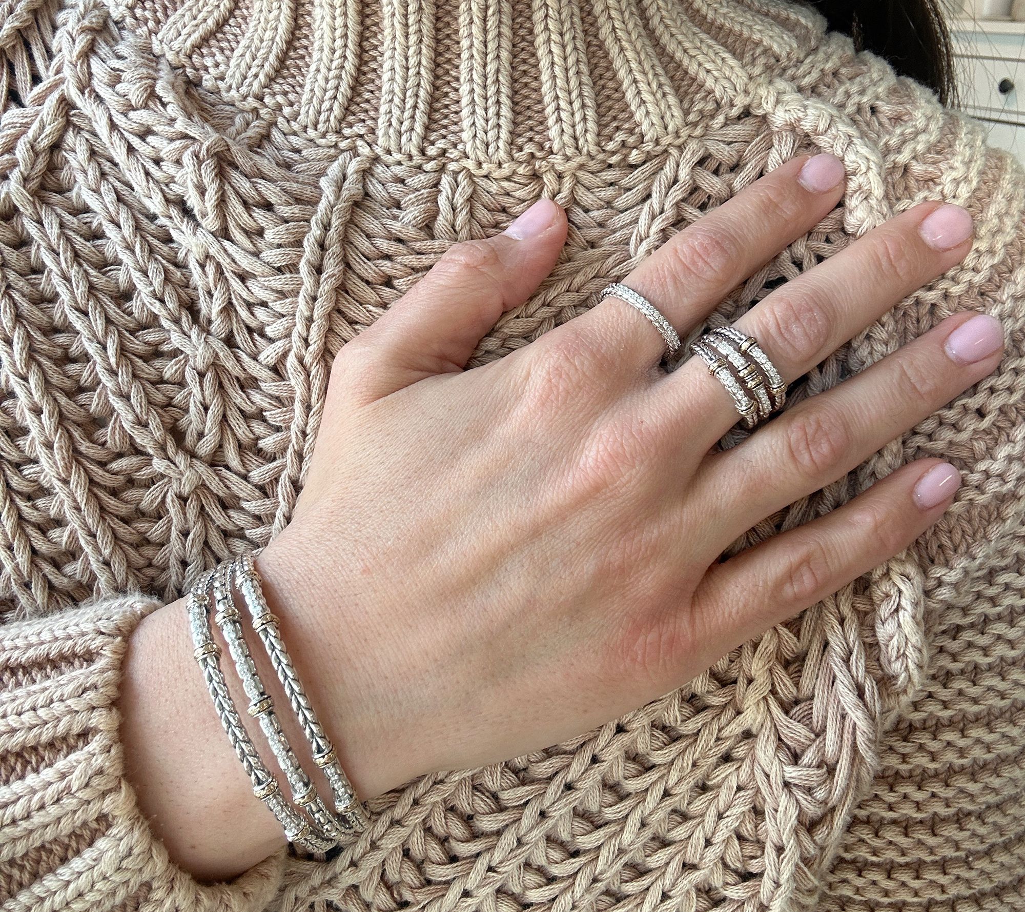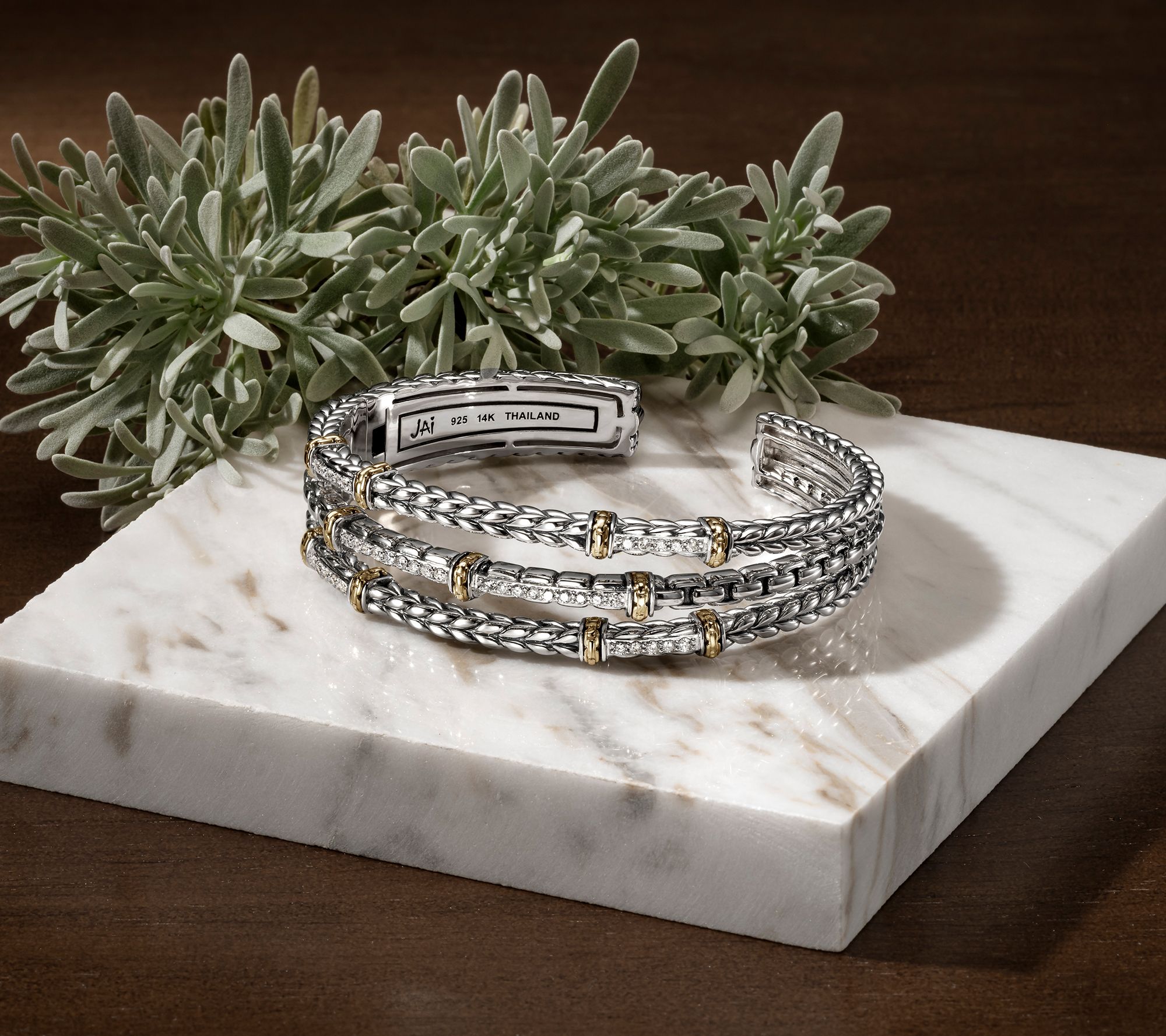 Intricate textures, diamond accents, and a standout two-tone design take this sterling silver and 14K yellow gold cuff from a basic accessory to a bold statement. From JAI.