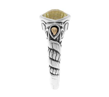 • Stack ring with bezel-set, cushion-cut, faceted gemstone at center, with pear-shaped 14K yellow gold accents on either side; alternating rows of highly polished and twisted-rope texture on shank and polished back; oxidized finish
