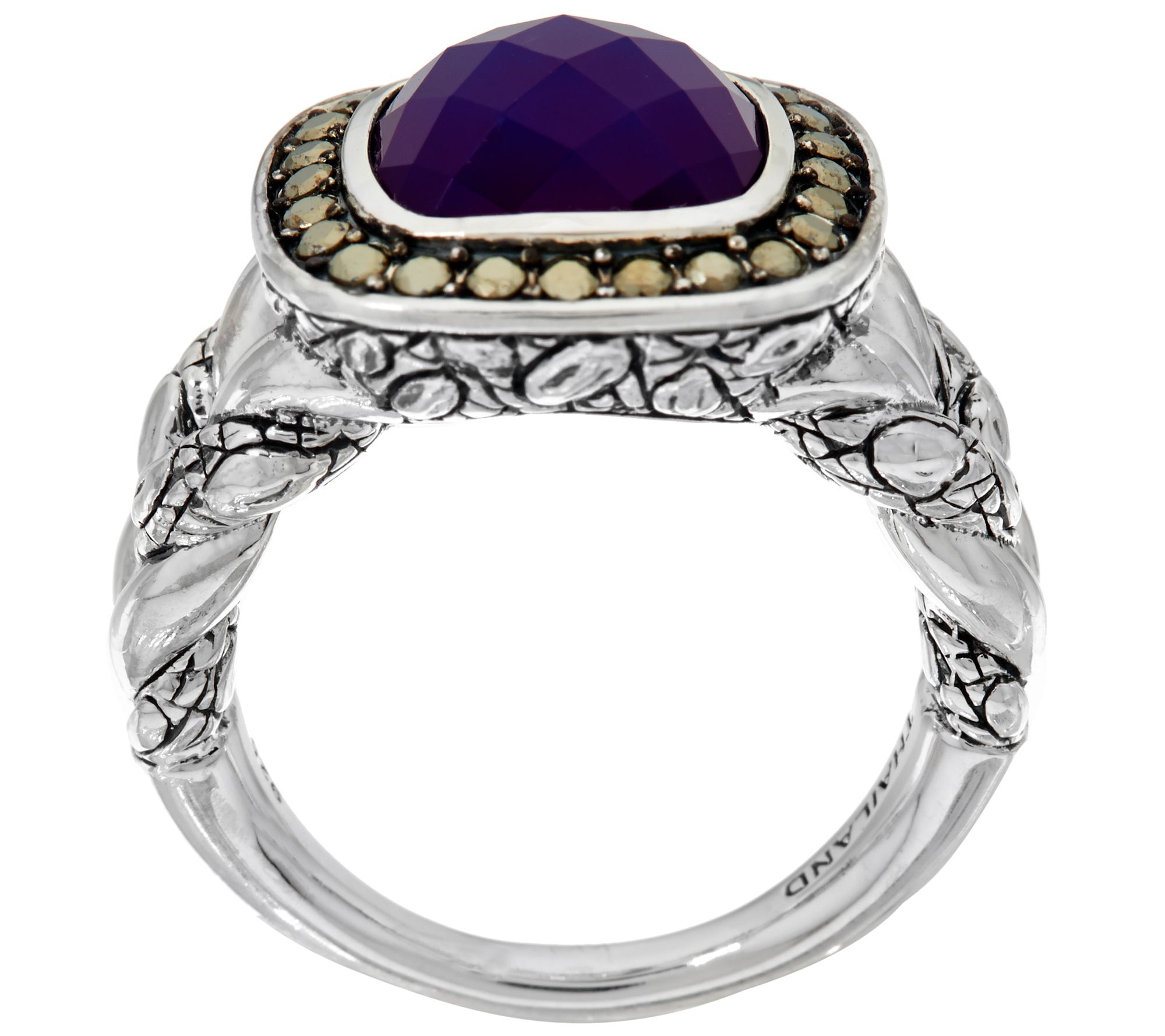 Transfixing texture. A cushion-shaped gemstone cabochon is the striking centerpiece of this sterling silver JAI ring--surrounded by a border of bead-style marcasite. The croco-designed gallery completes the intricate design. From JAI.