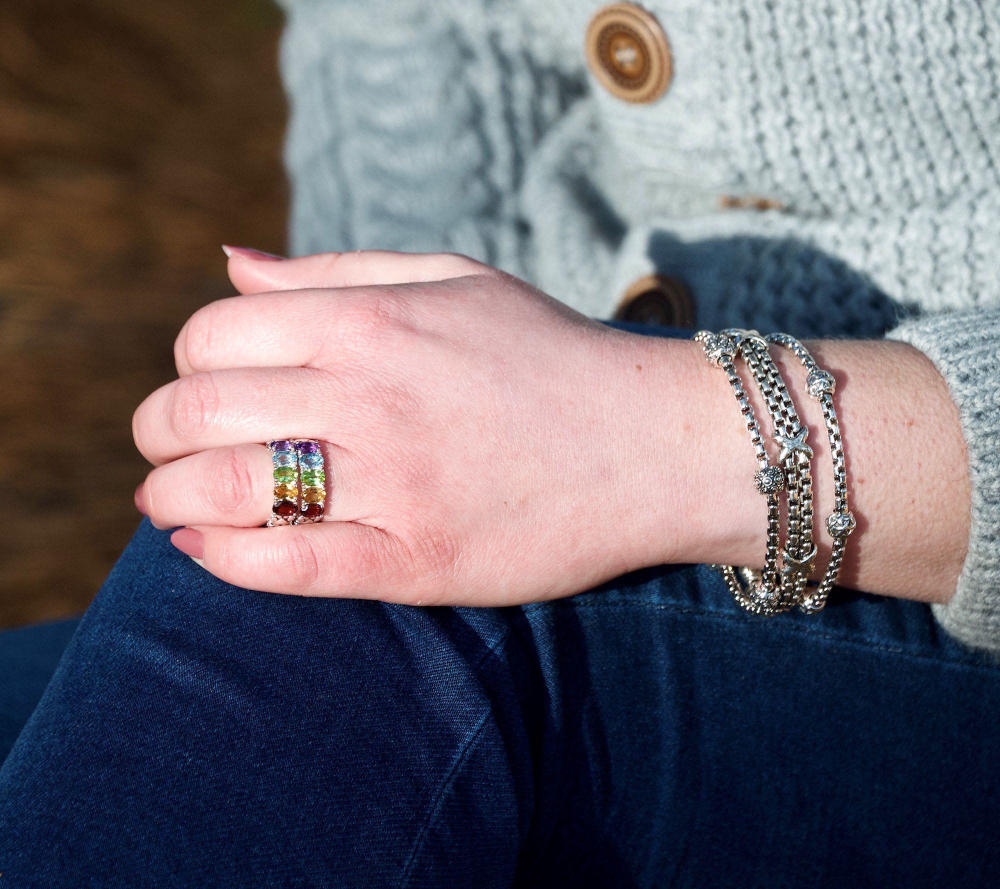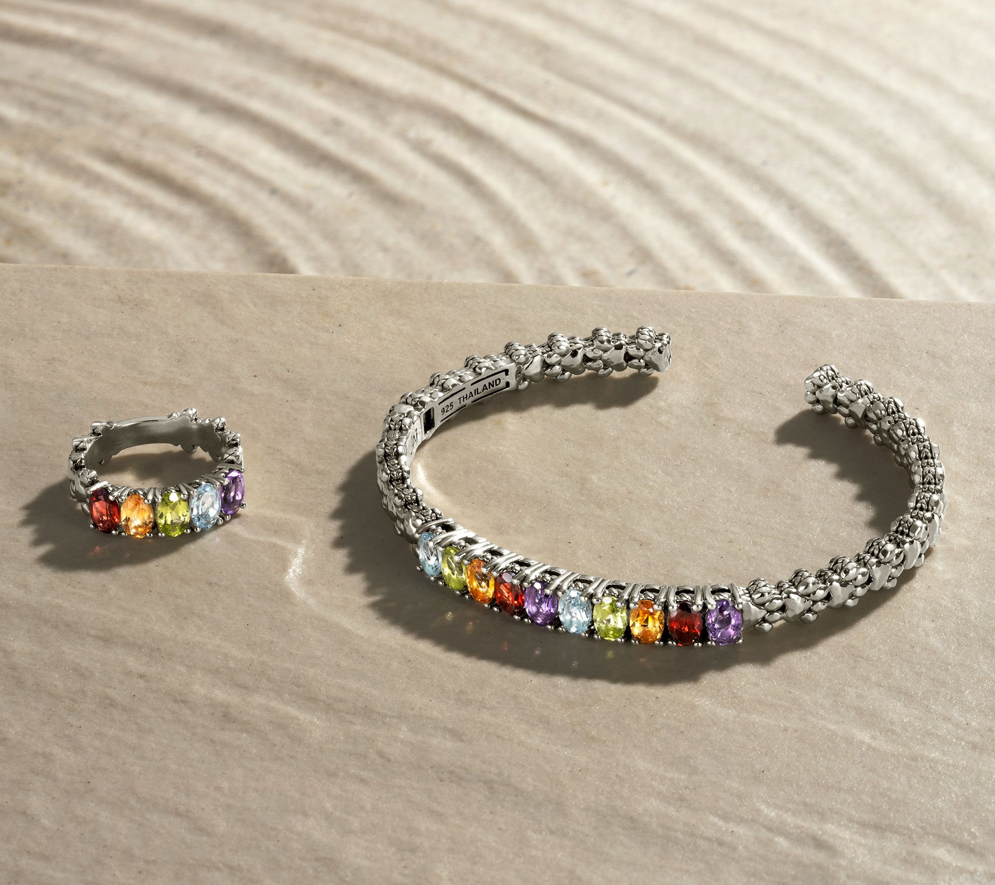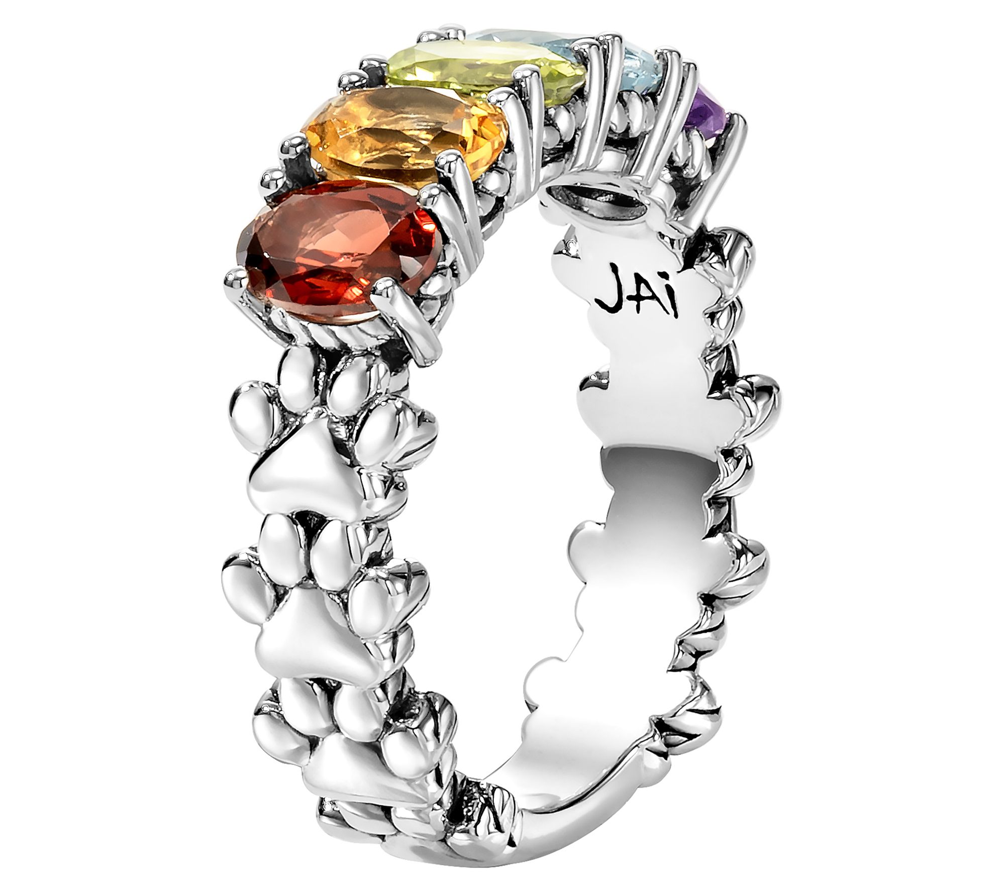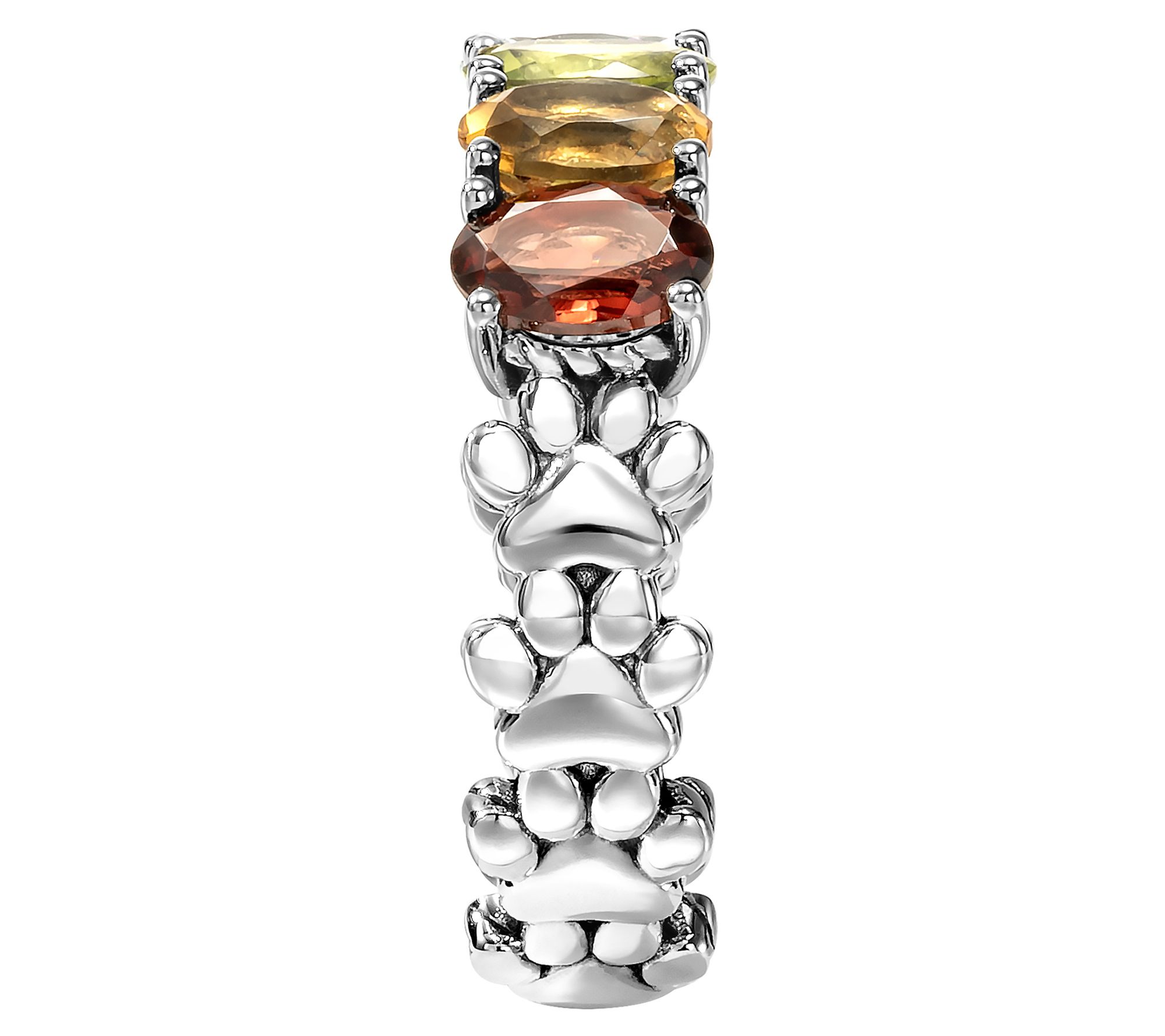 A constant companion. A beloved family member. One never to be forgotten. Honor your departed fur baby with this rainbow bridge ring. Each gemstone -- garnet, peridot, sky blue topaz, amethyst, and citrine -- is beautifully prong-set to create a vibrant, shimmering display alongside the paw-detailed shank. From JAI.