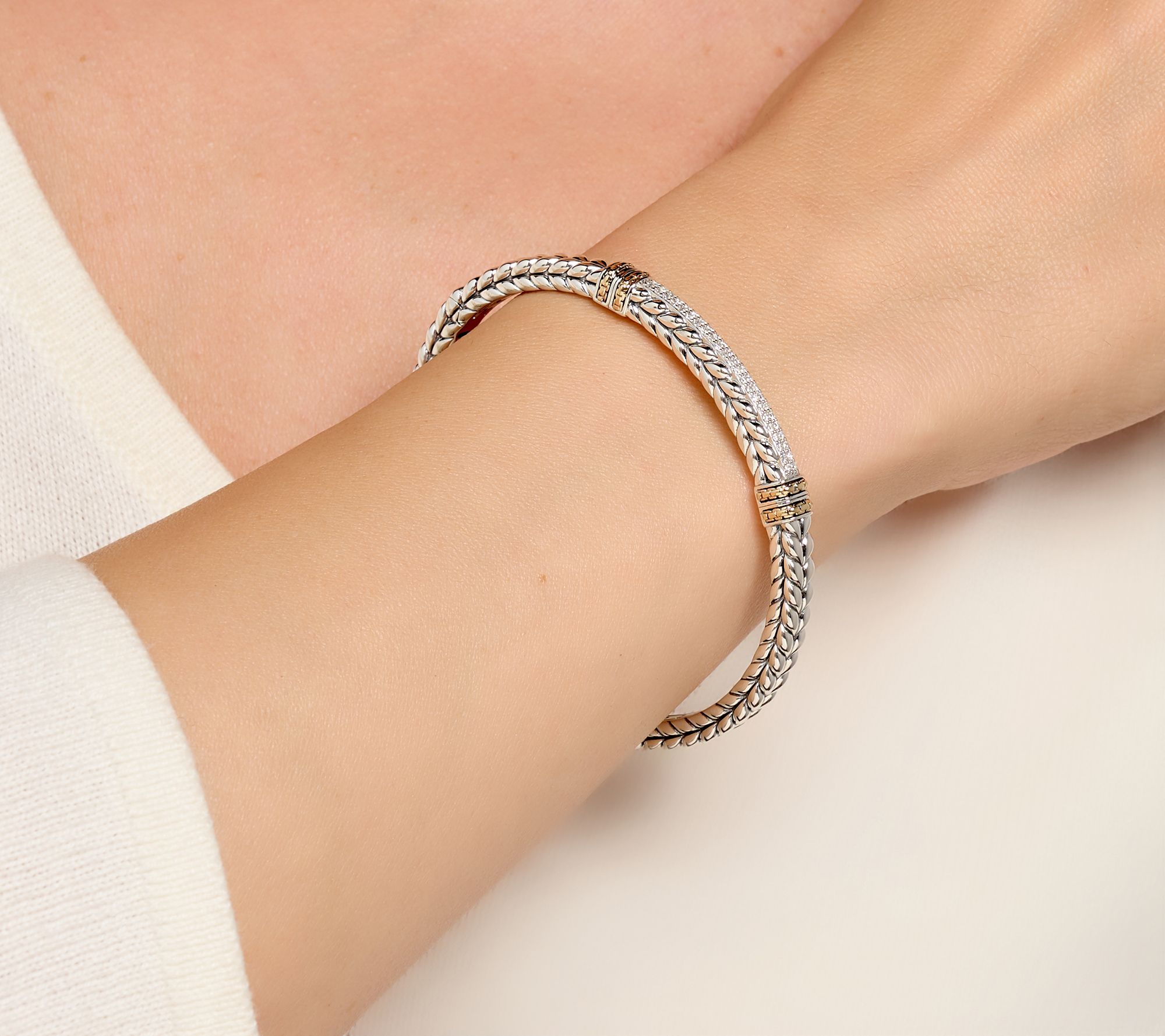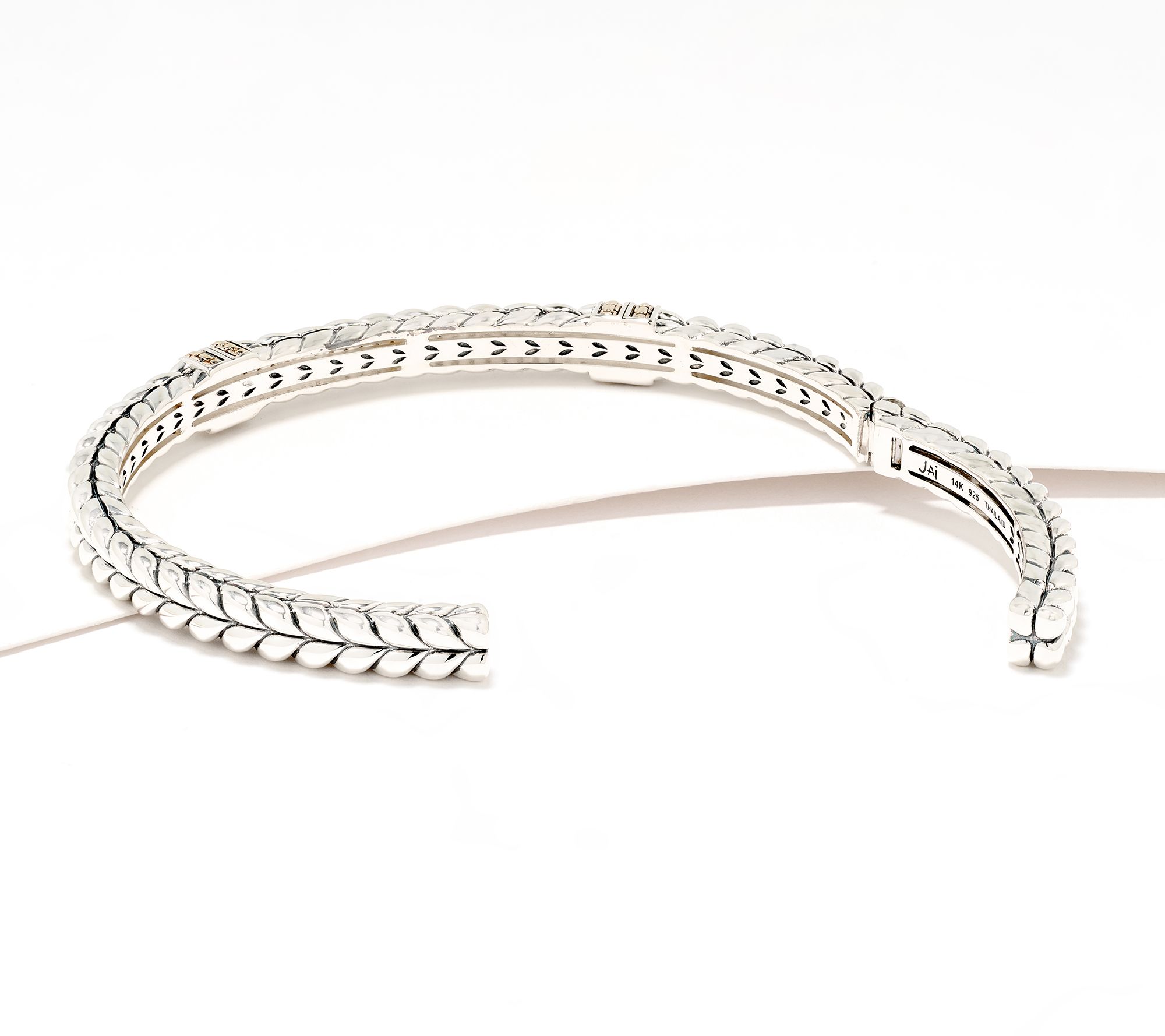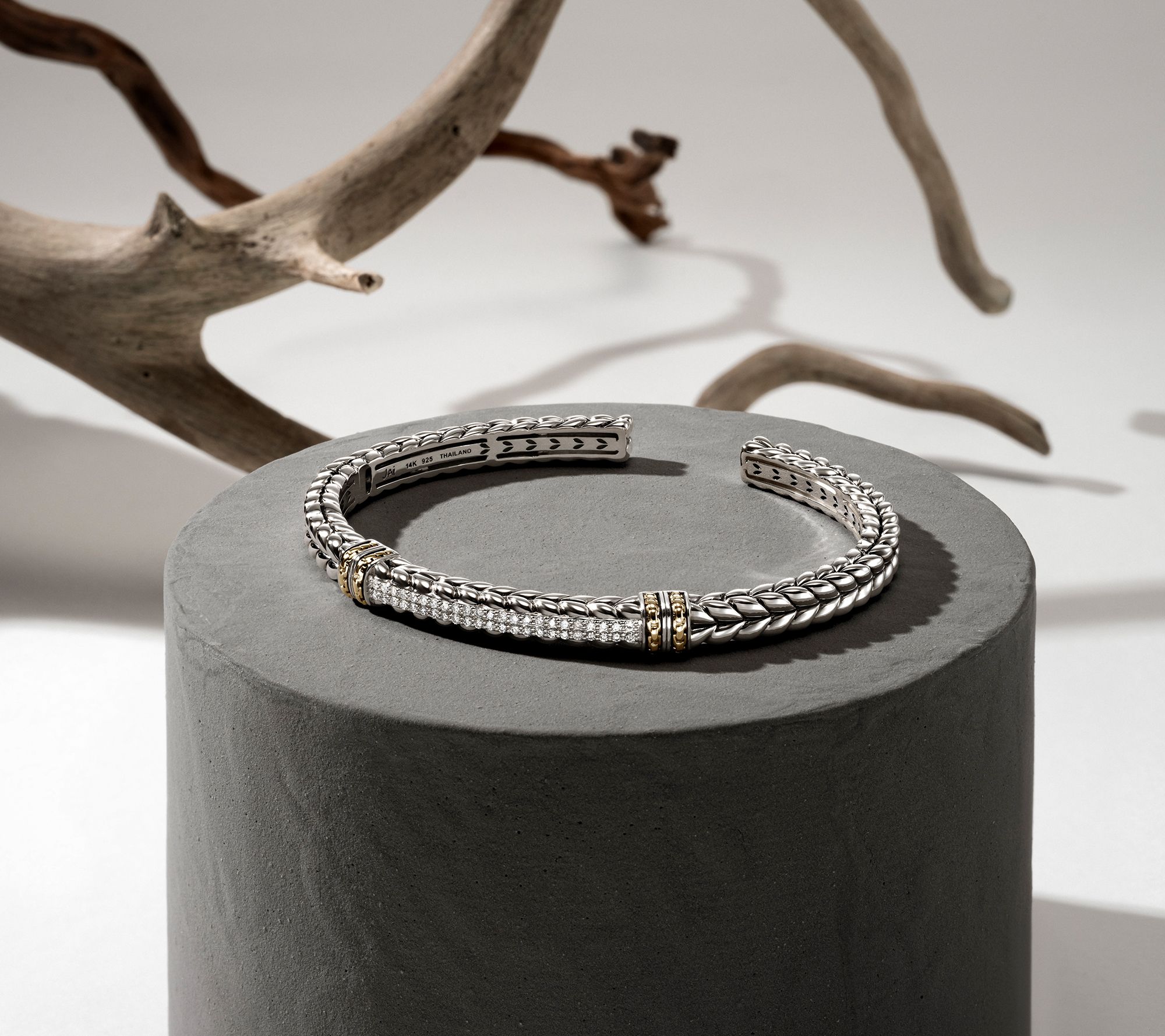 When signature JAI textures meet diamonds, beautiful things happen! Add this diamond-splashed basketweave cuff to your outfit (or stack) when you're going glam for an event or just want to spread positively sparkling vibes. From JAI.