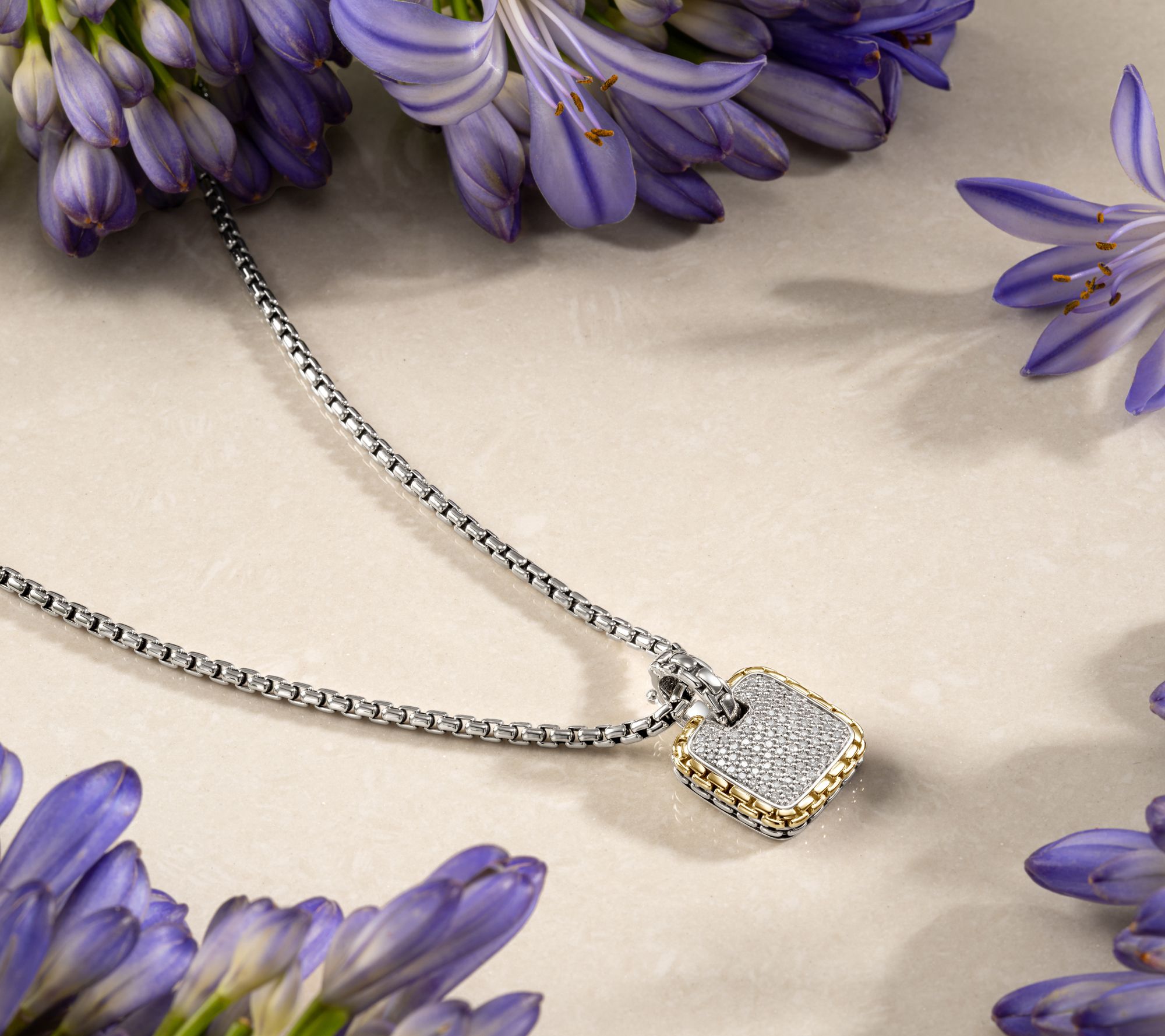 A carved box chain provides a spectacular setting for a dazzling pave diamond enhancer, elevating any ensemble from basic to brilliant. From JAI.