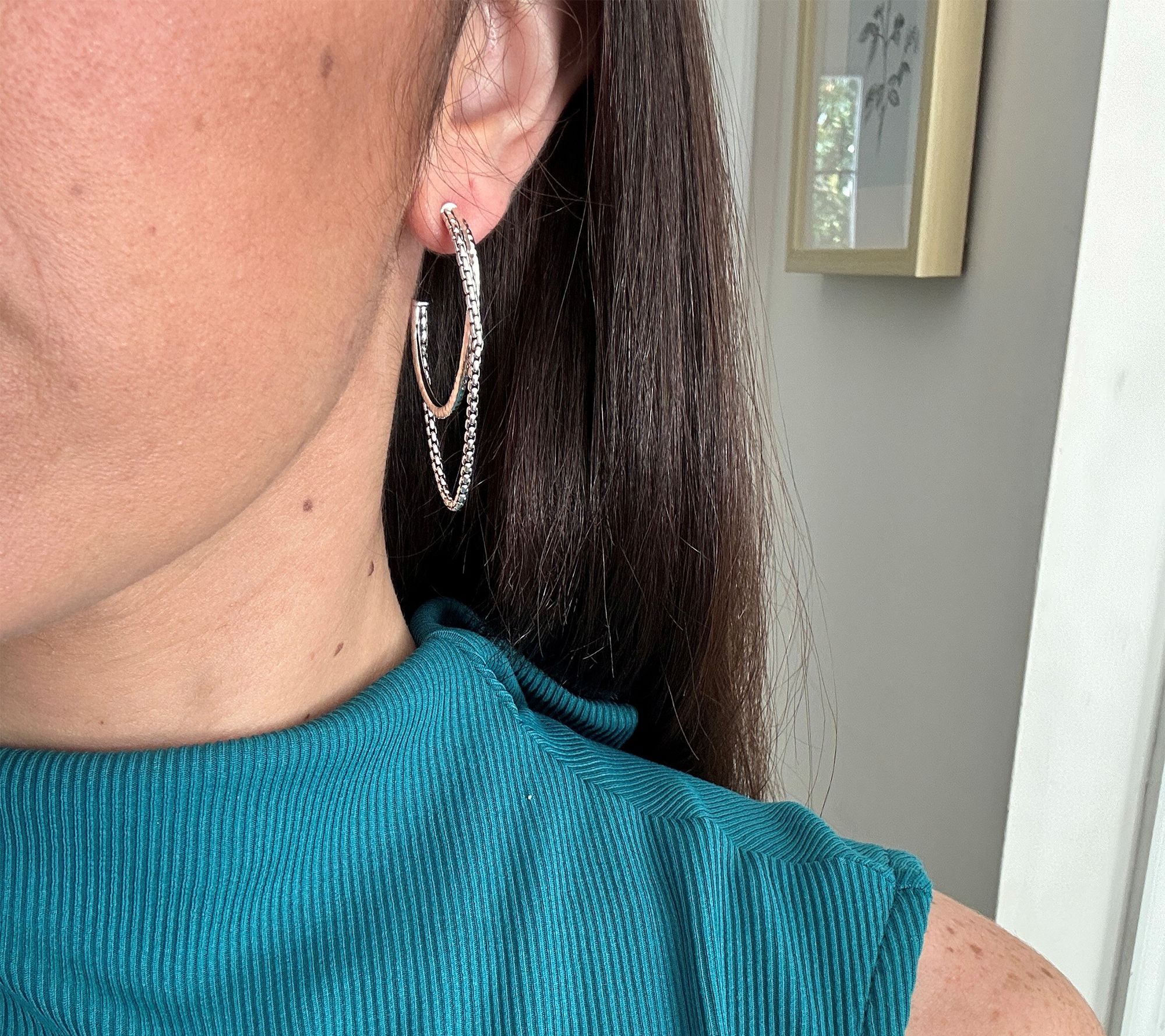Heading into brunch with friends or dressing up your work wardrobe, these sterling silver hoops set the stage for standout style. The solid hoop design is accented by a loose box chain, adding dynamic movement and a modern touch to every turn of your head. Pair them with a sleek updo or let your hair down for an effortlessly chic look. From JAI.