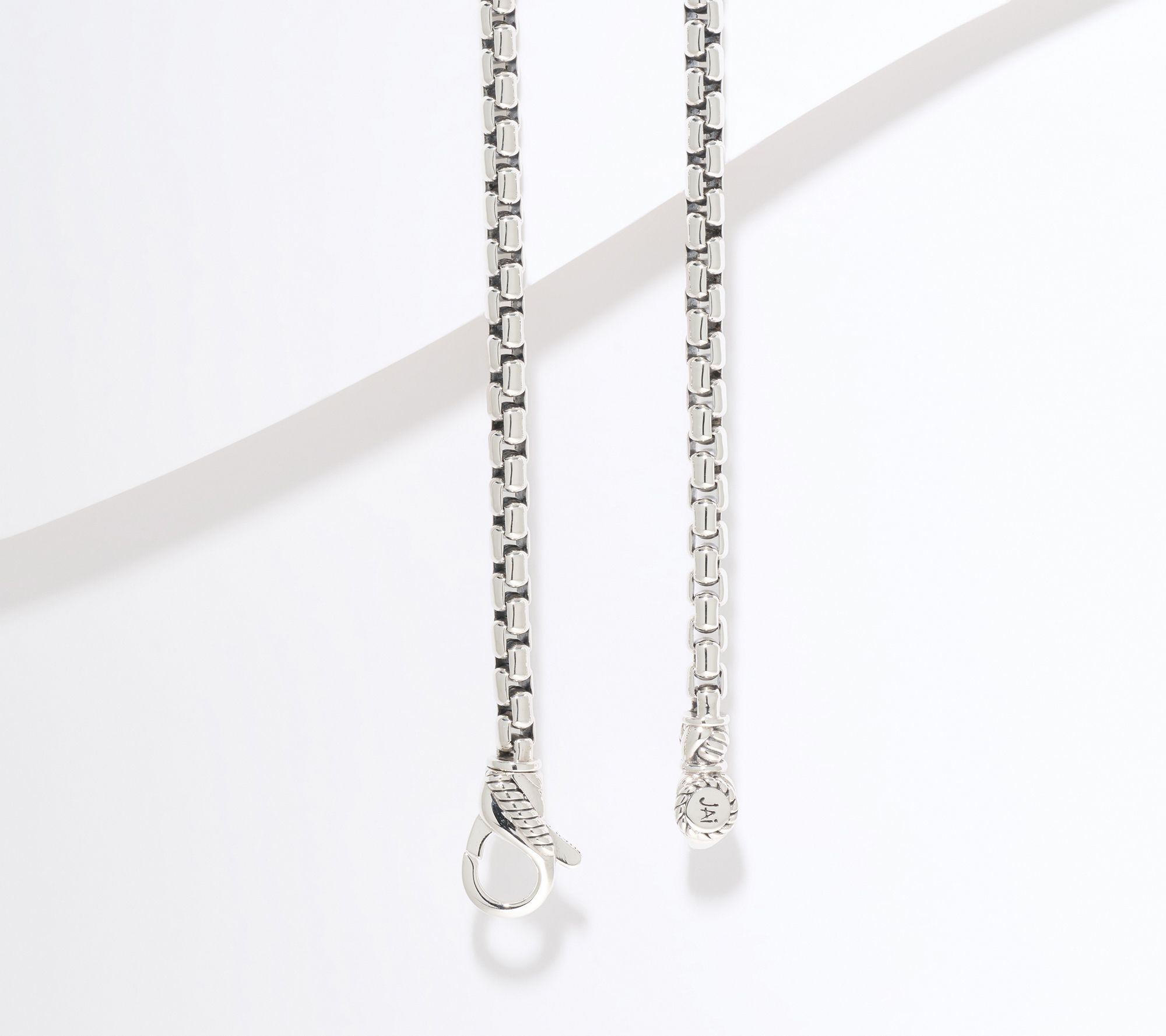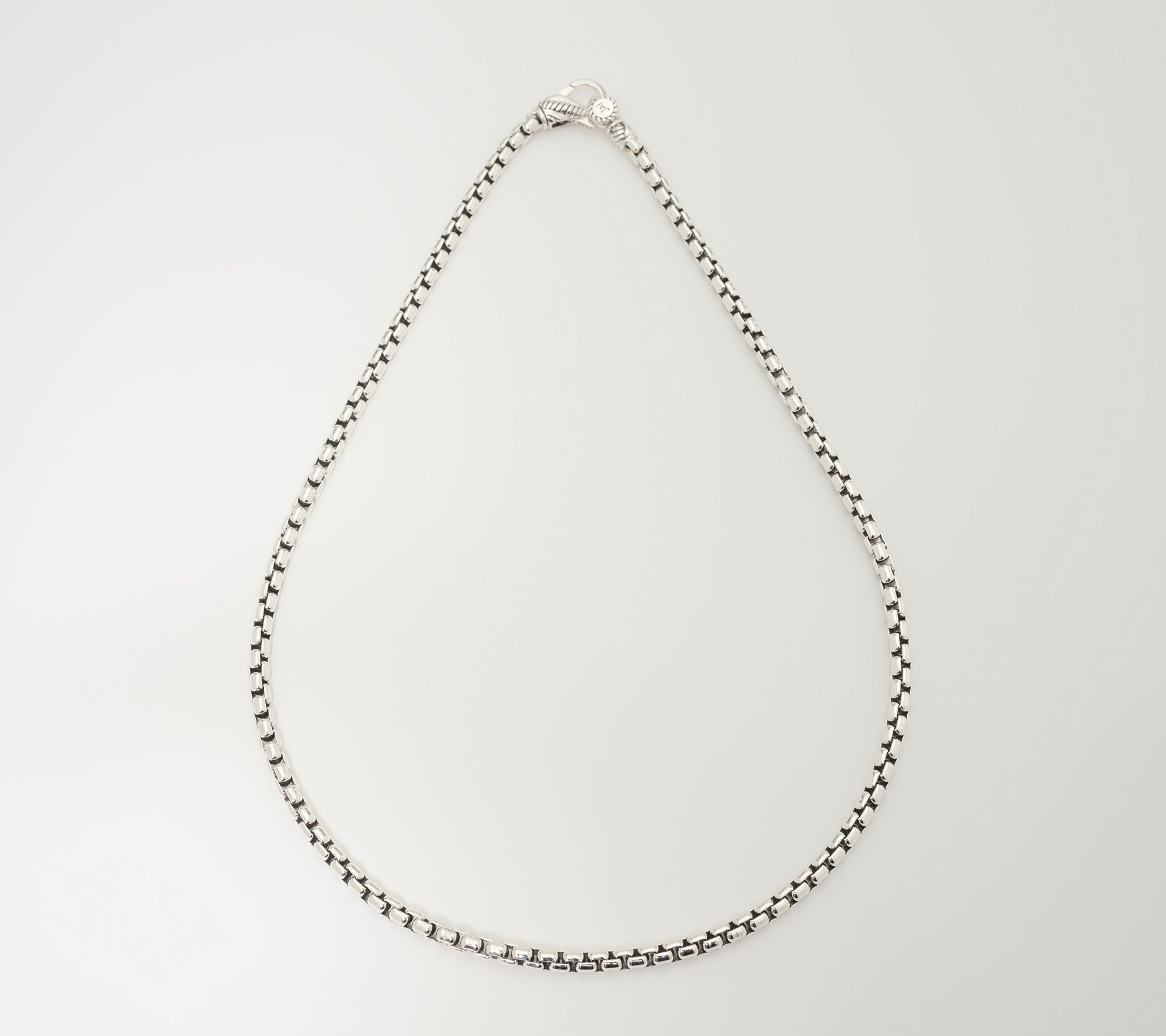 Showcase your chic side with this box chain necklace as your instantly elevating accessory. Crafted in sterling silver, it pairs polished and oxidized finishes to create rich depth and eye-catching texture. The 3.7mm width offers weight and presence, making it an ideal piece to wear solo or layered with others for added impact on any occasion. Sukhothai-inspired details and a swivel lobster claw clasp ensure it fastens as beautifully as it looks. From JAI.