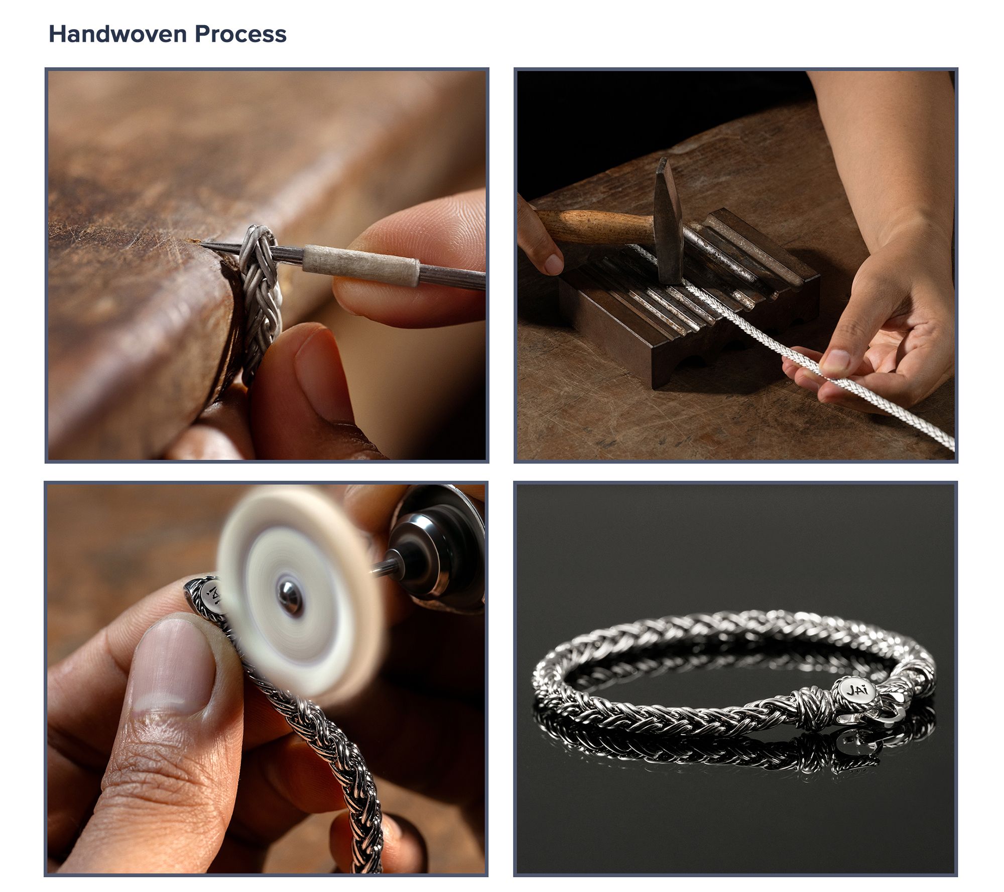 Each bracelet is handcrafted by five different artisans/weavers and takes approximately five hours to create; the chain on each bracelet is handwoven