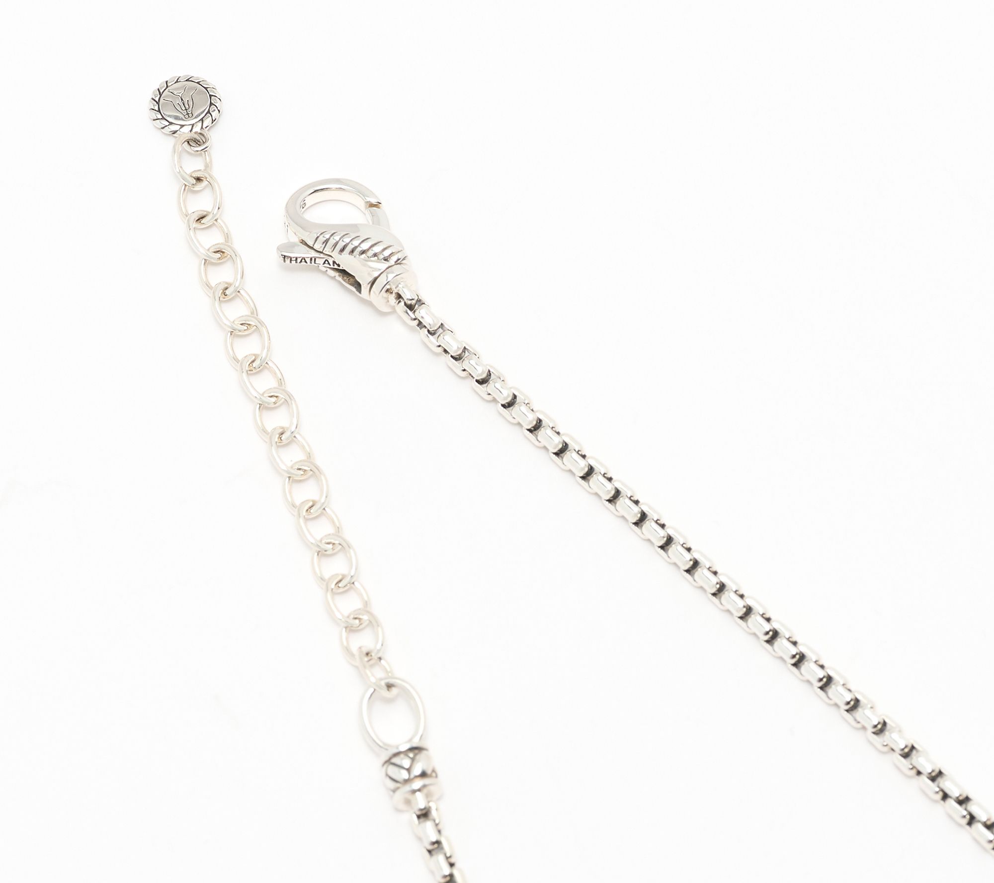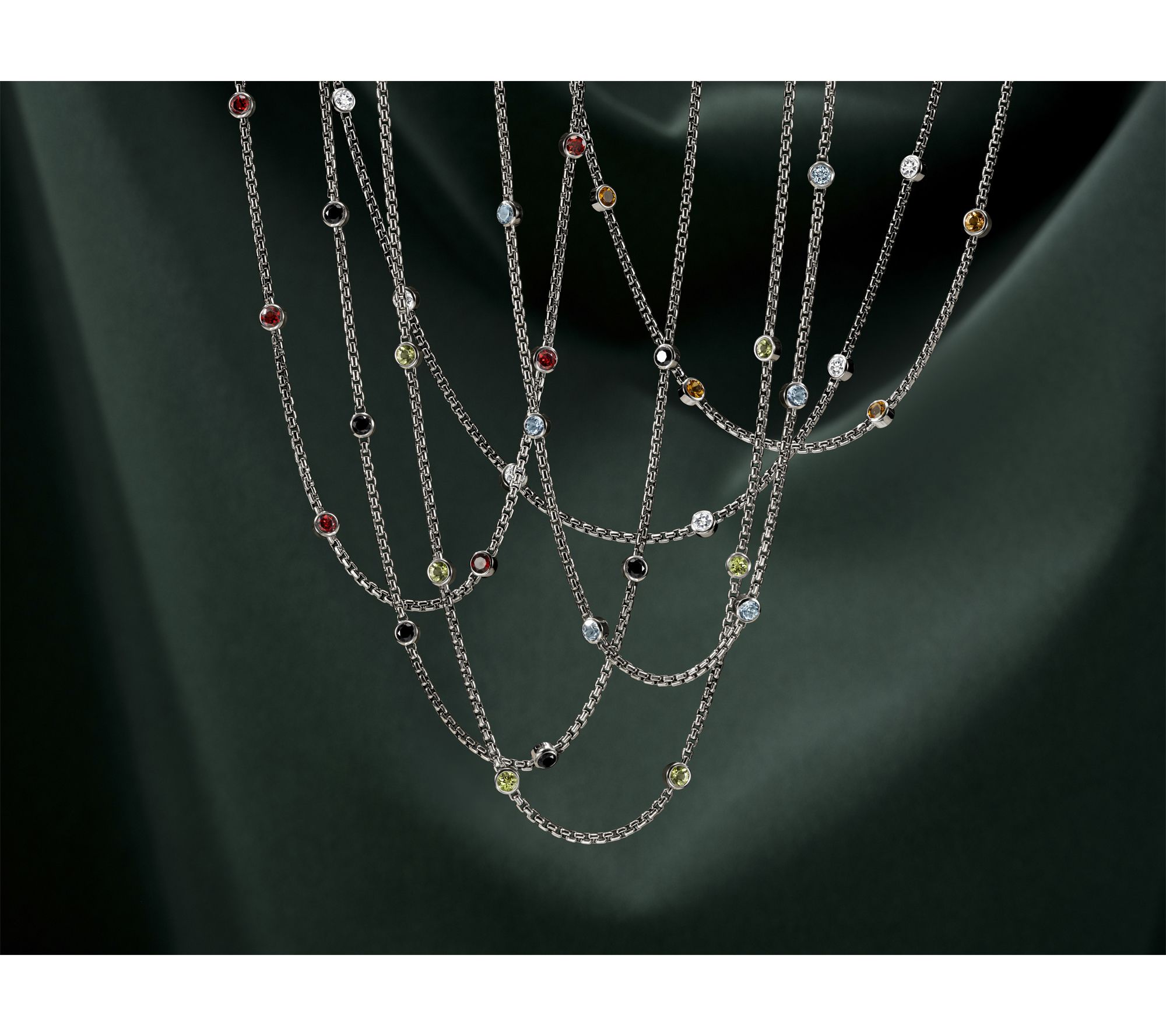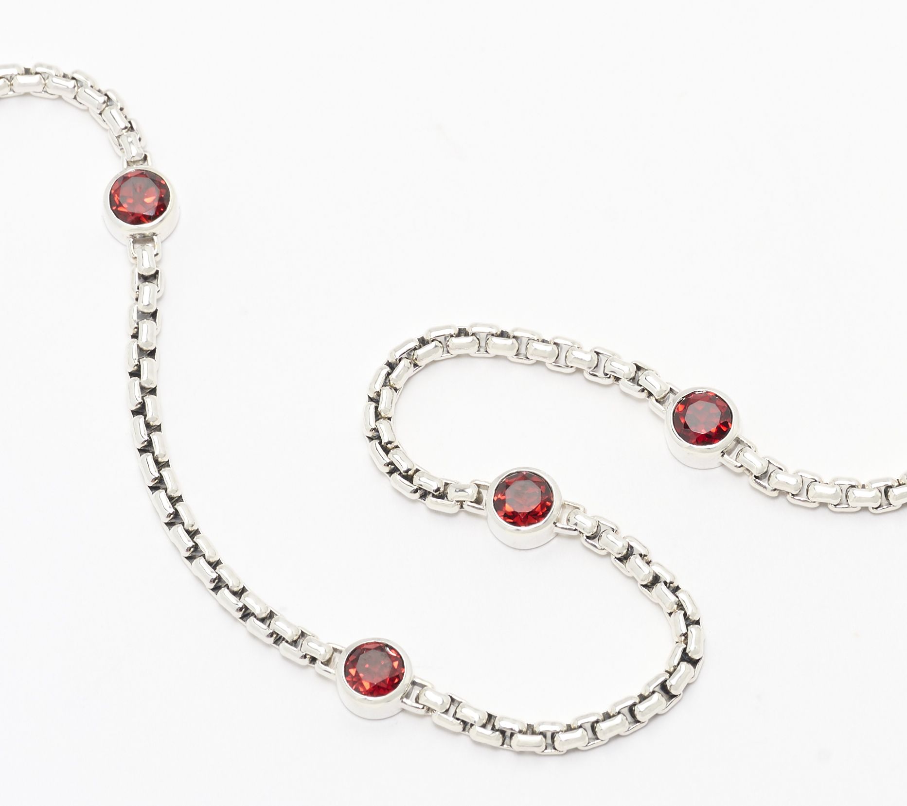 Stunning from every angle, this JAI sterling silver box chain necklace embraces both artistic beauty and undeniable versatility. Six bezel-set, round gemstone stations provide a pop of just-right sparkle -- making it the ideal accessory to wear either on its own or paired with other pieces (imagine a special pendant necklace partnered with this beauty!). But the tell-tale sign that this necklace is a top-notch designer piece? Take a gander at that swivel lobster claw clasp with Sukhothai textured endcaps. It truly is extraordinary from start to finish. From JAI.