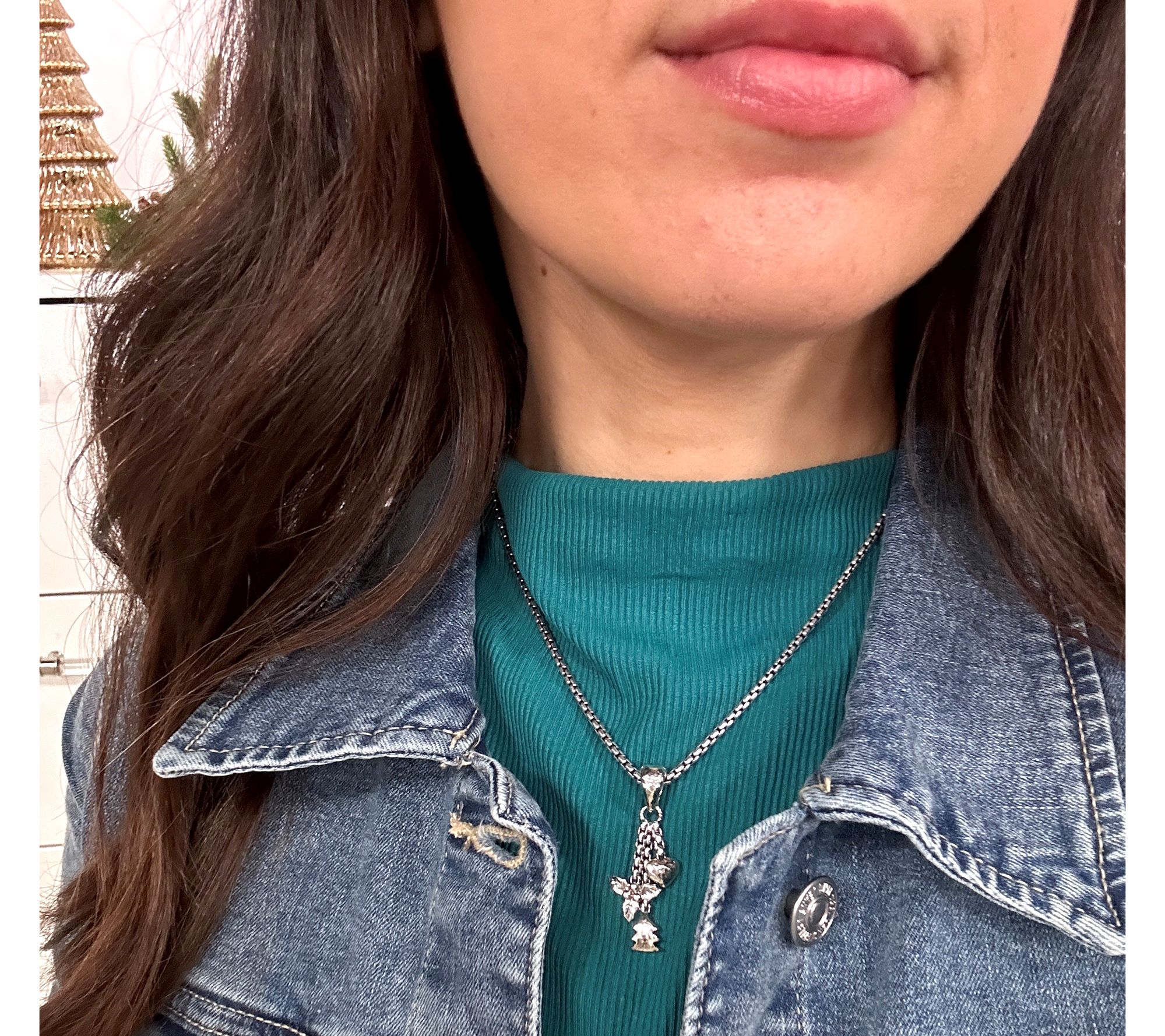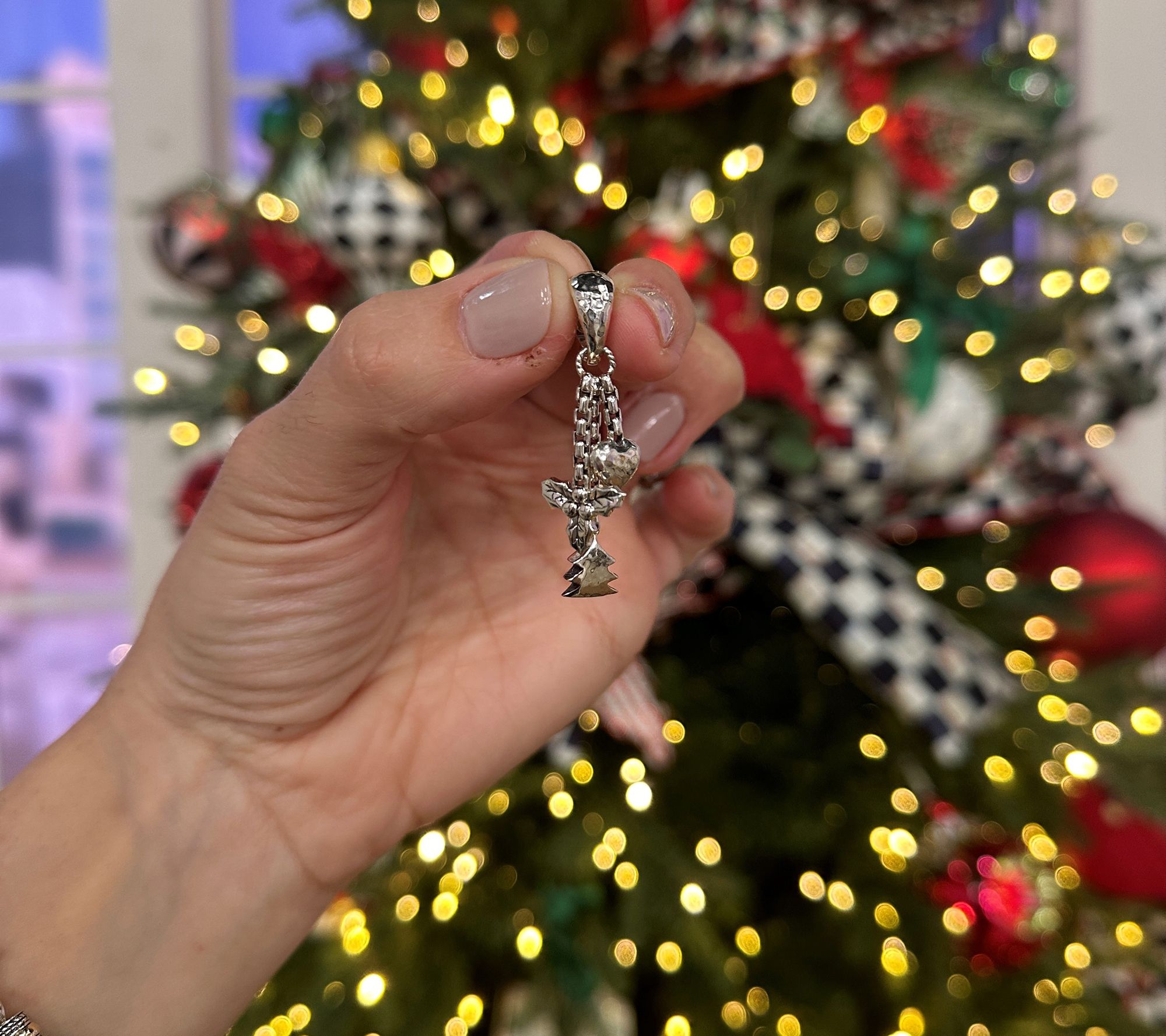 • Hammered bail with Christmas tree, heart, and holly charms hanging from box chain links