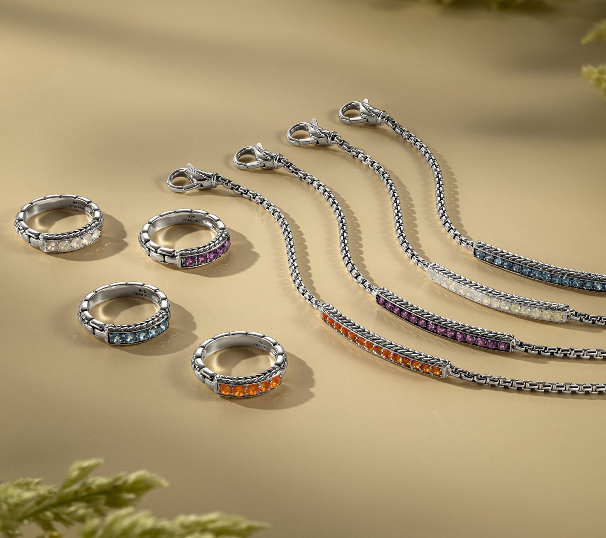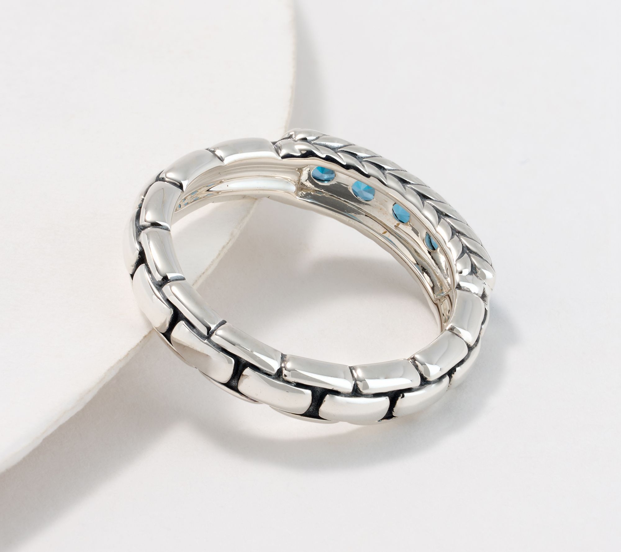 With its striking box chain texture and vibrant exotic gemstones, this sterling silver band ring adds rich color and shimmering detail to any look -- whether you're stacking your favorites for a playful mix or wearing it solo to showcase your gemstone of choice. The polished and oxidized finish creates depth for a touch of character you can wear from work to weekend. From JAI.