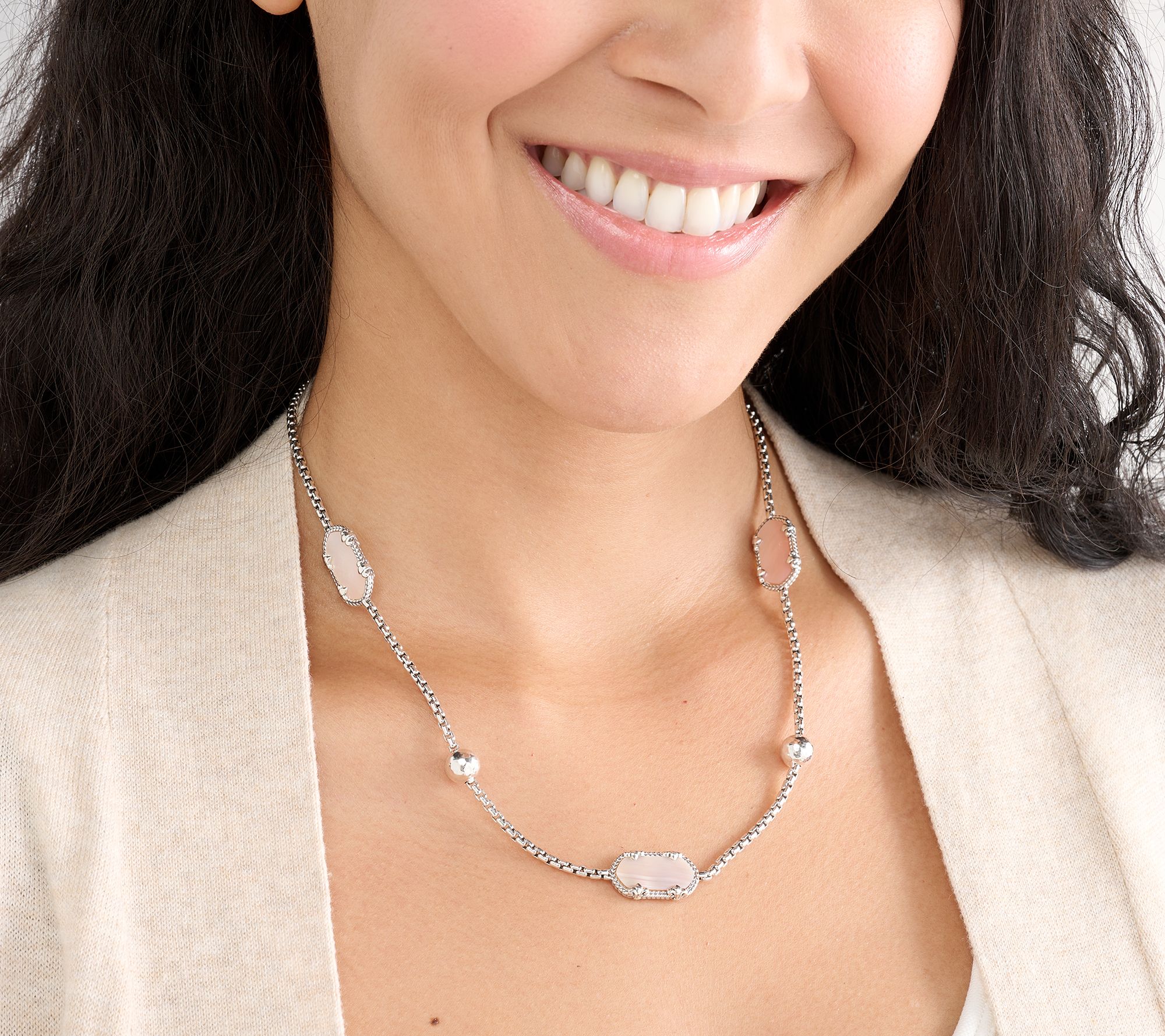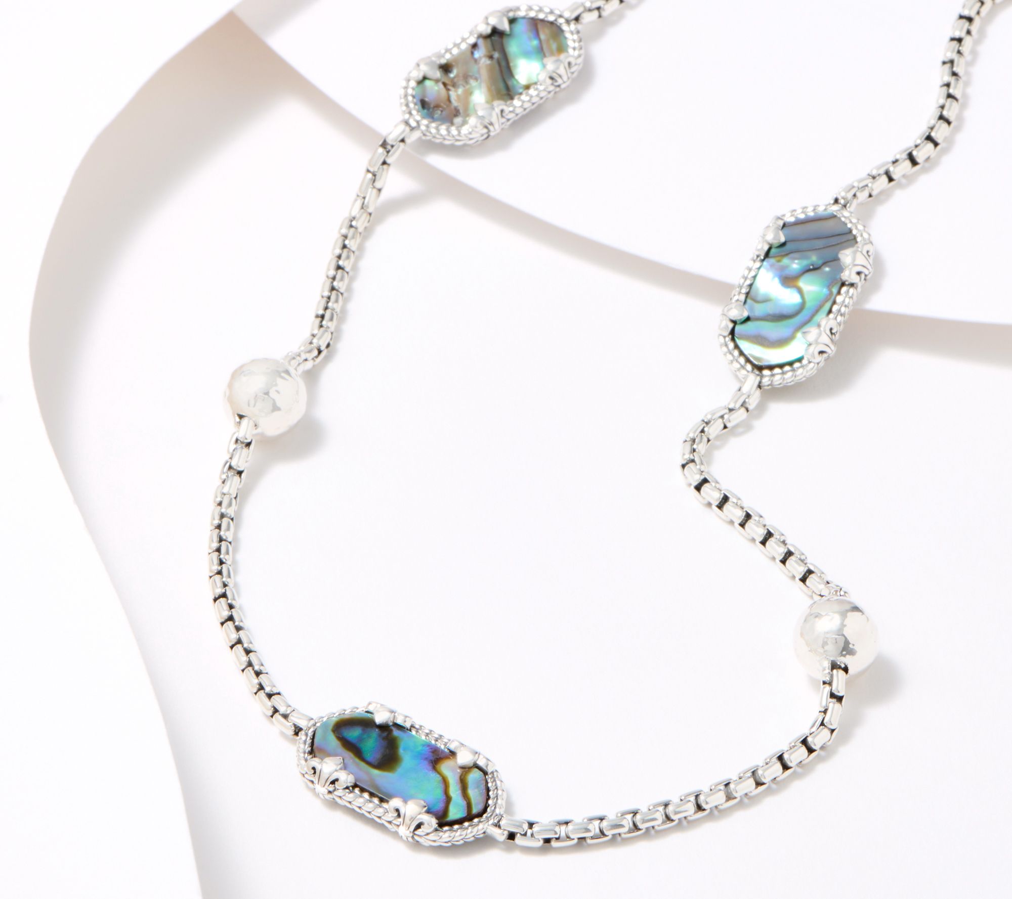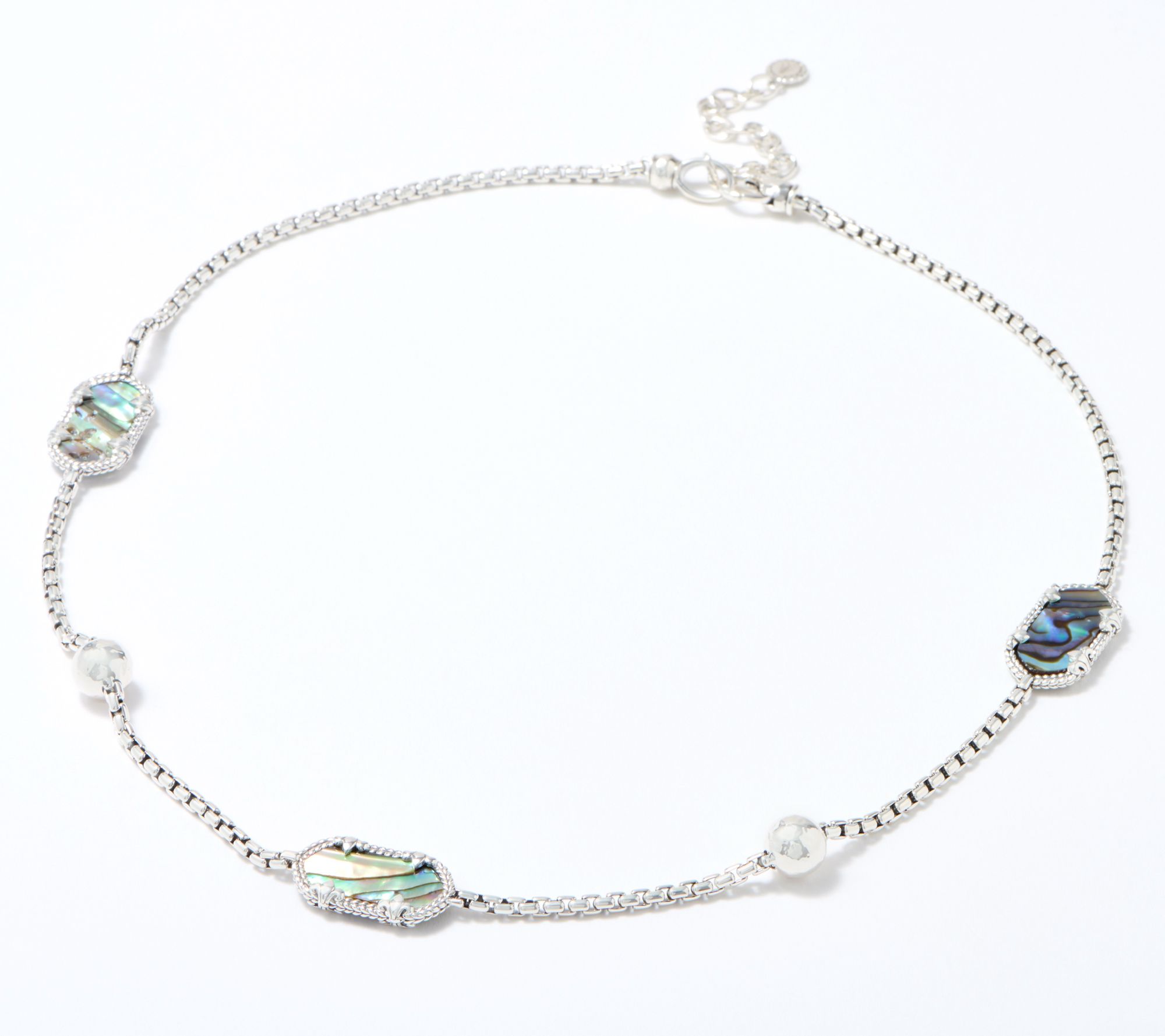 Fleur-de-lis prongs add a fancy flourish to the hexagon-shaped gemstones dotting this box chain necklace. From JAI.
