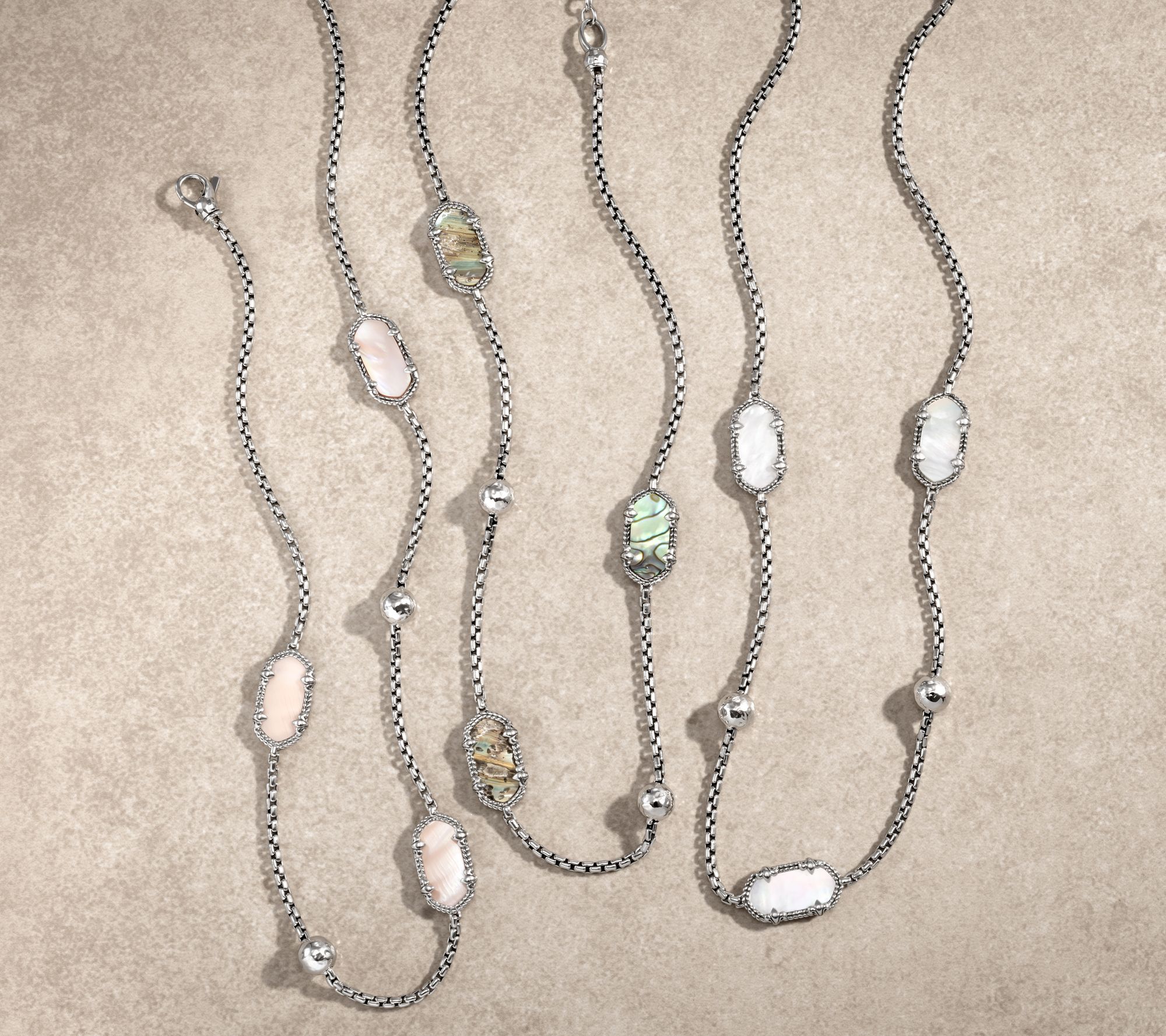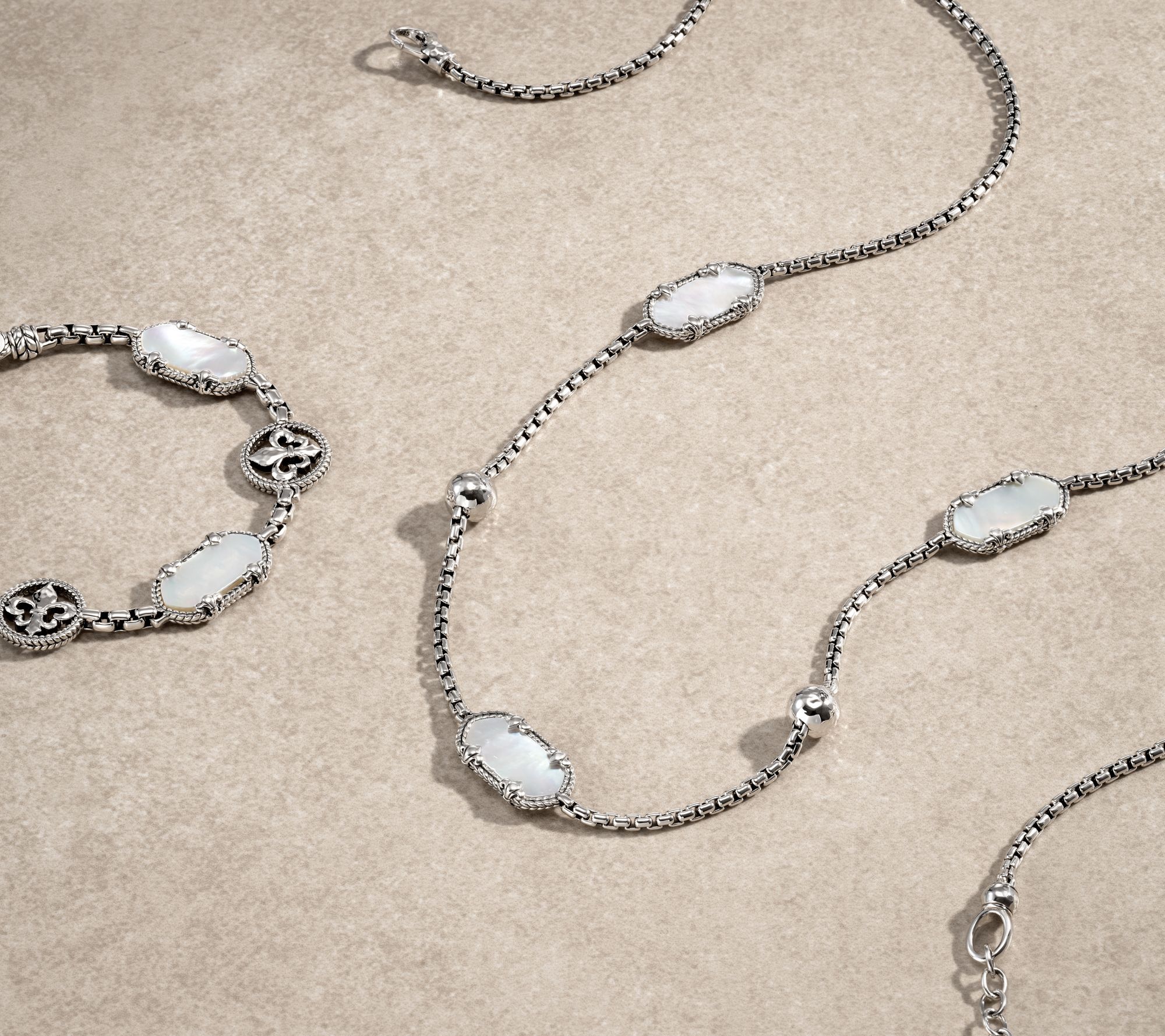 • 2.7mm box chain; hexagon-shaped gemstones with fleur-de-lis prongs and basketweave texture; two hammered beads; polished finish; oxidized