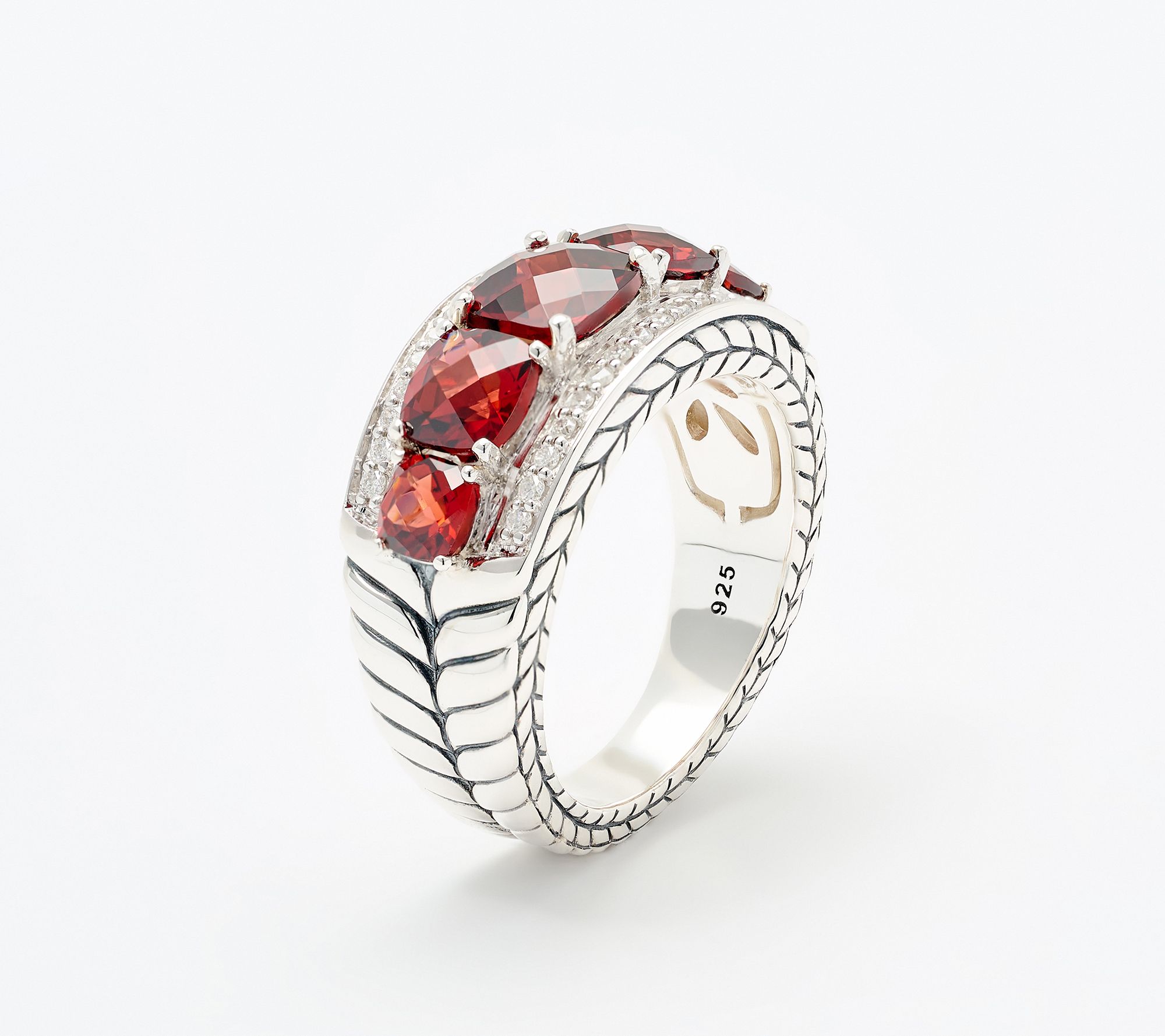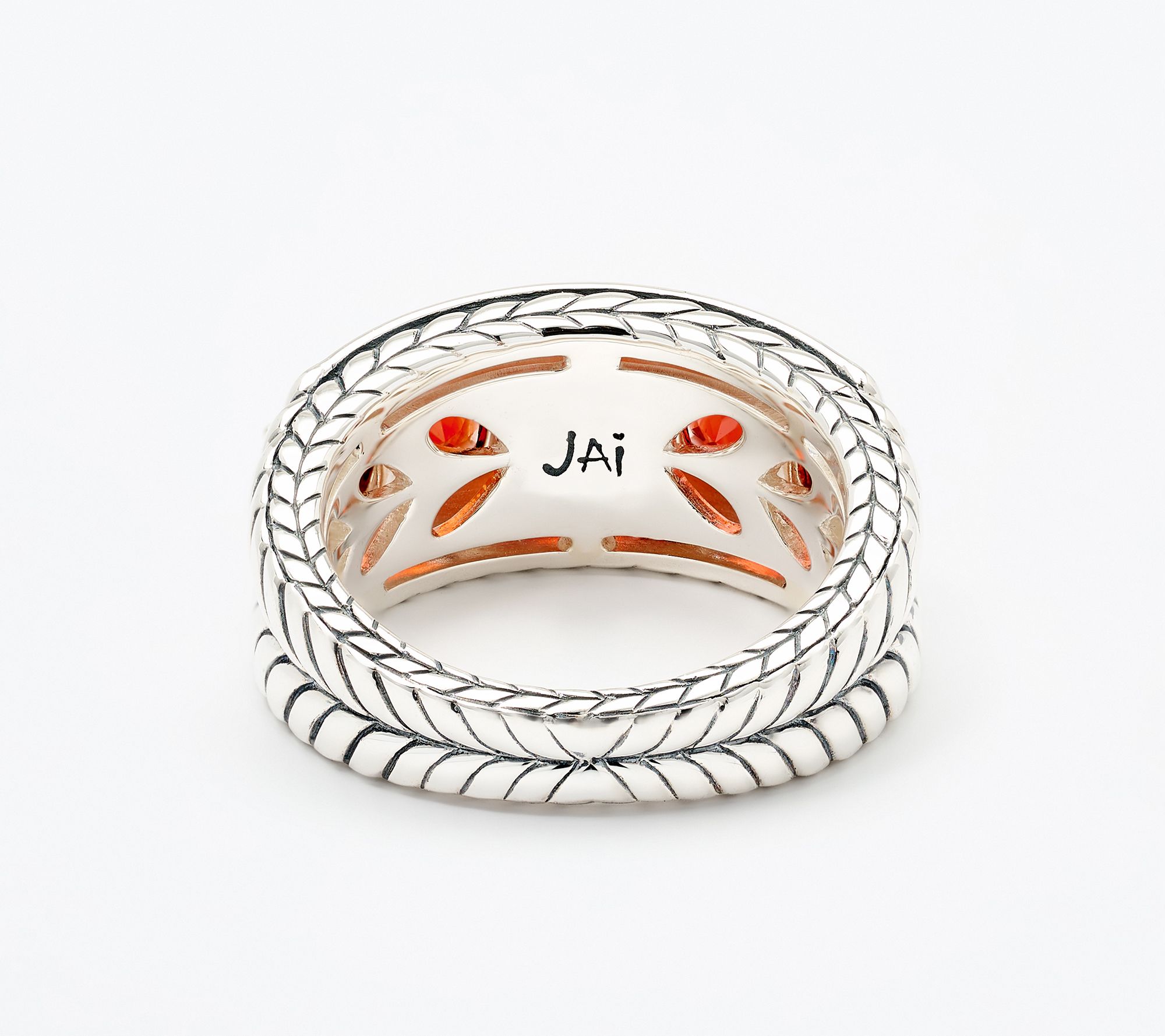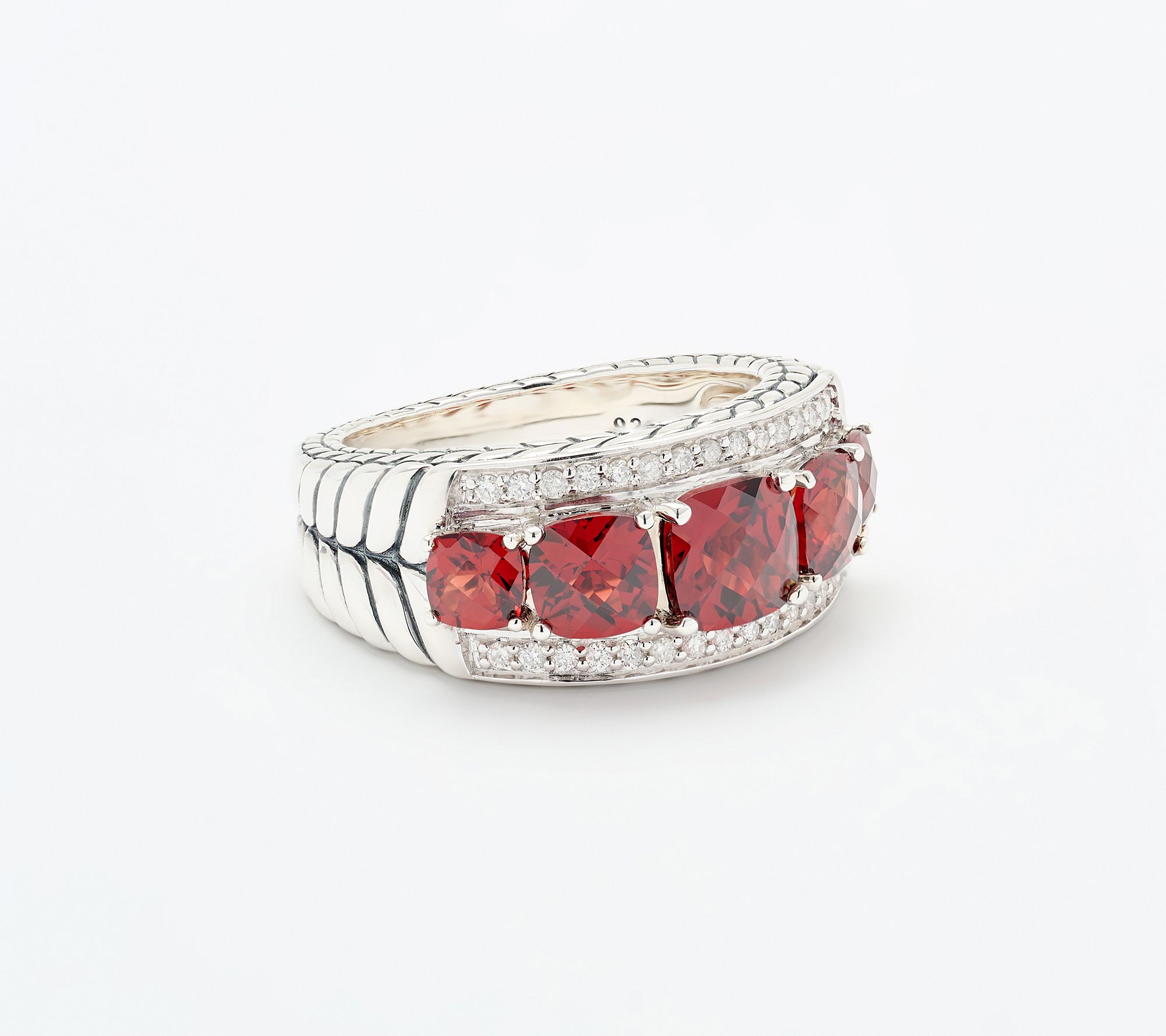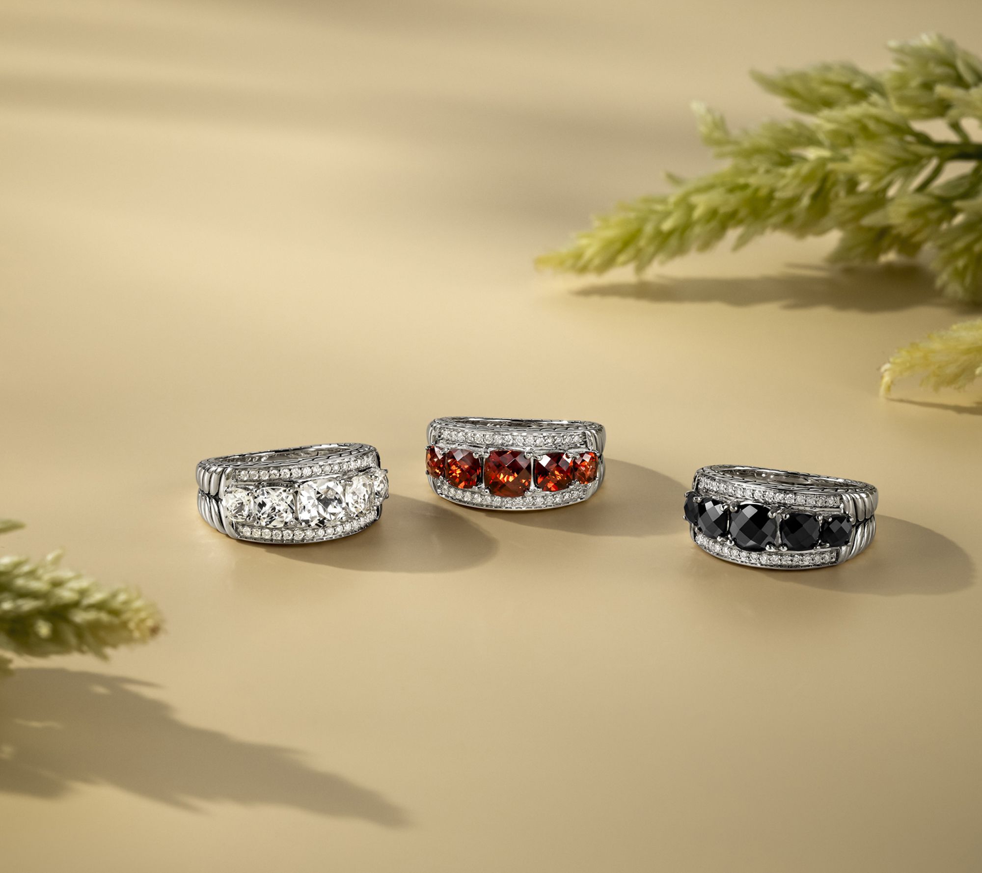 Rich color and sparkle come together in this gemstone and diamond graduated ring, set in sterling silver with beautifully sculpted basketweave accents. Shimmering diamonds and your choice of gemstone create a striking look -- whether you're dressing up for a special dinner or adding polish to your daily favorites. From JAI.
