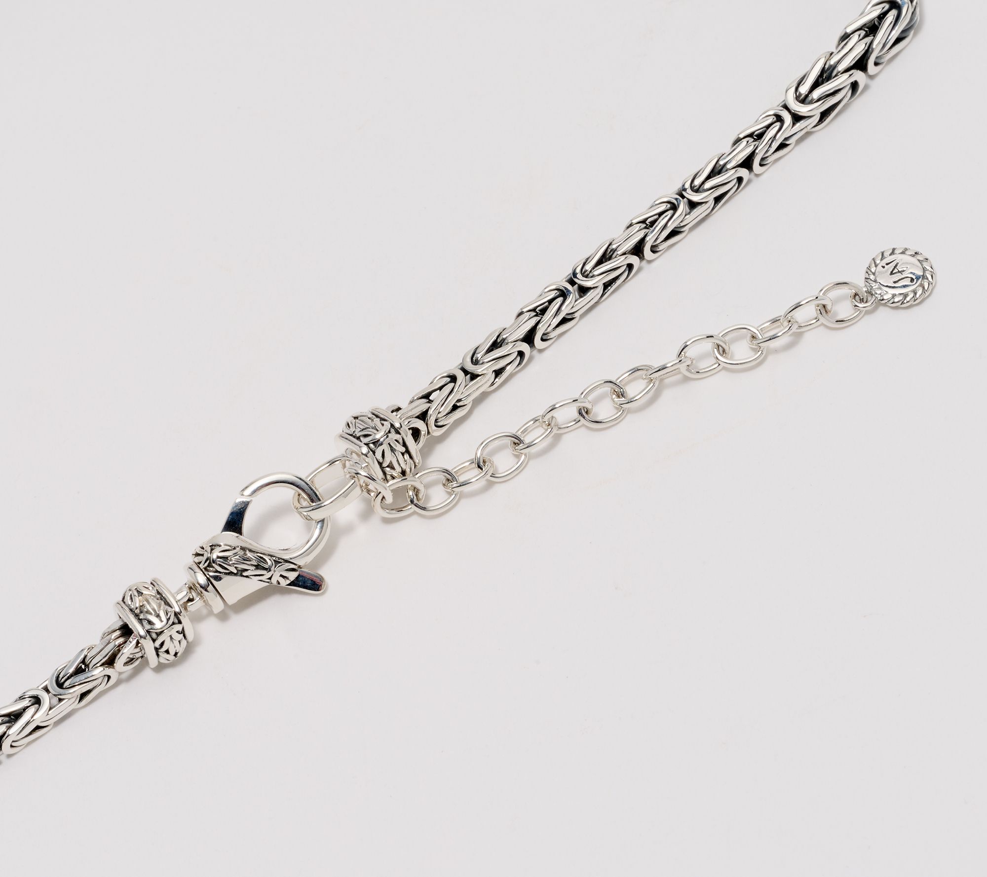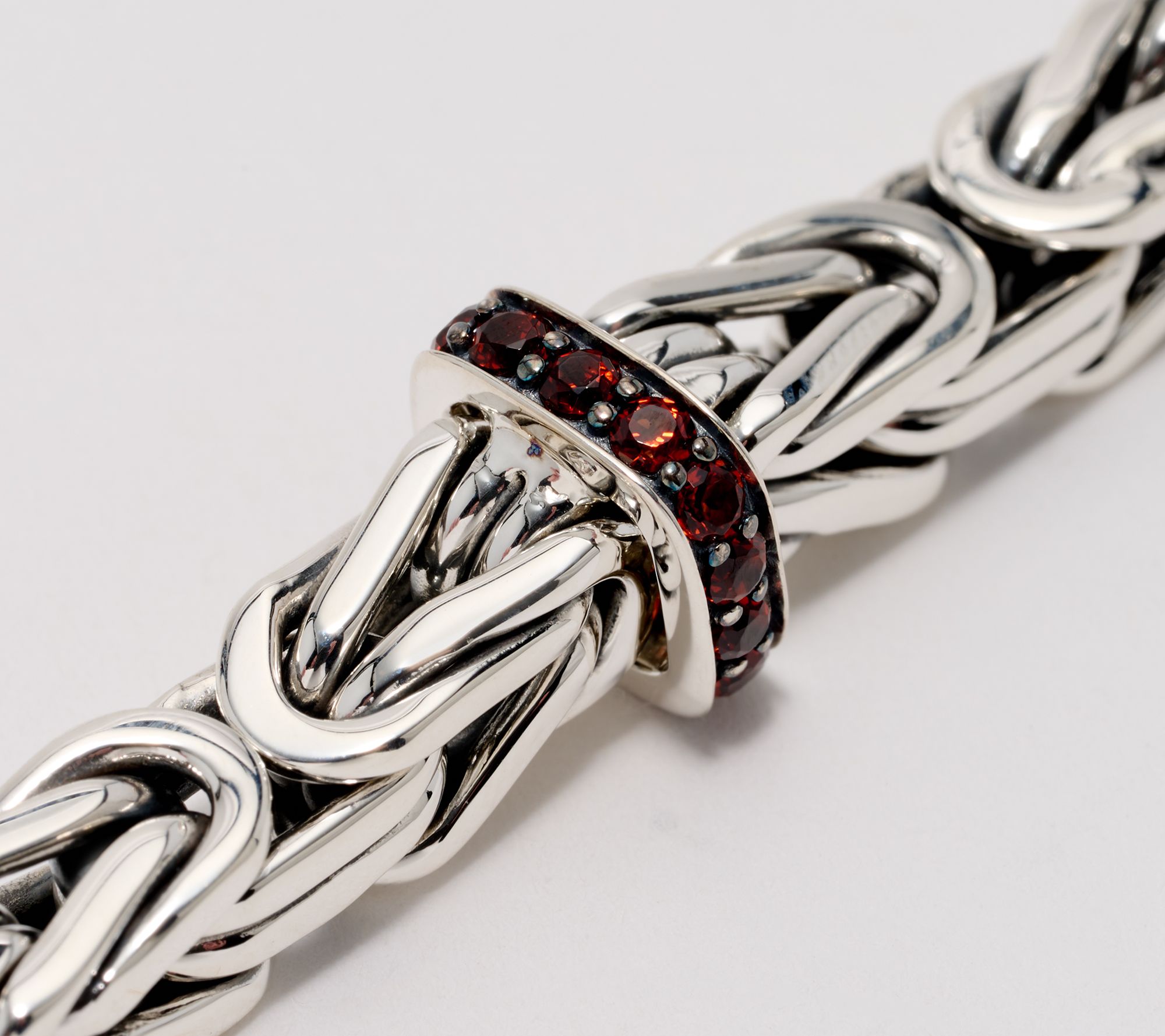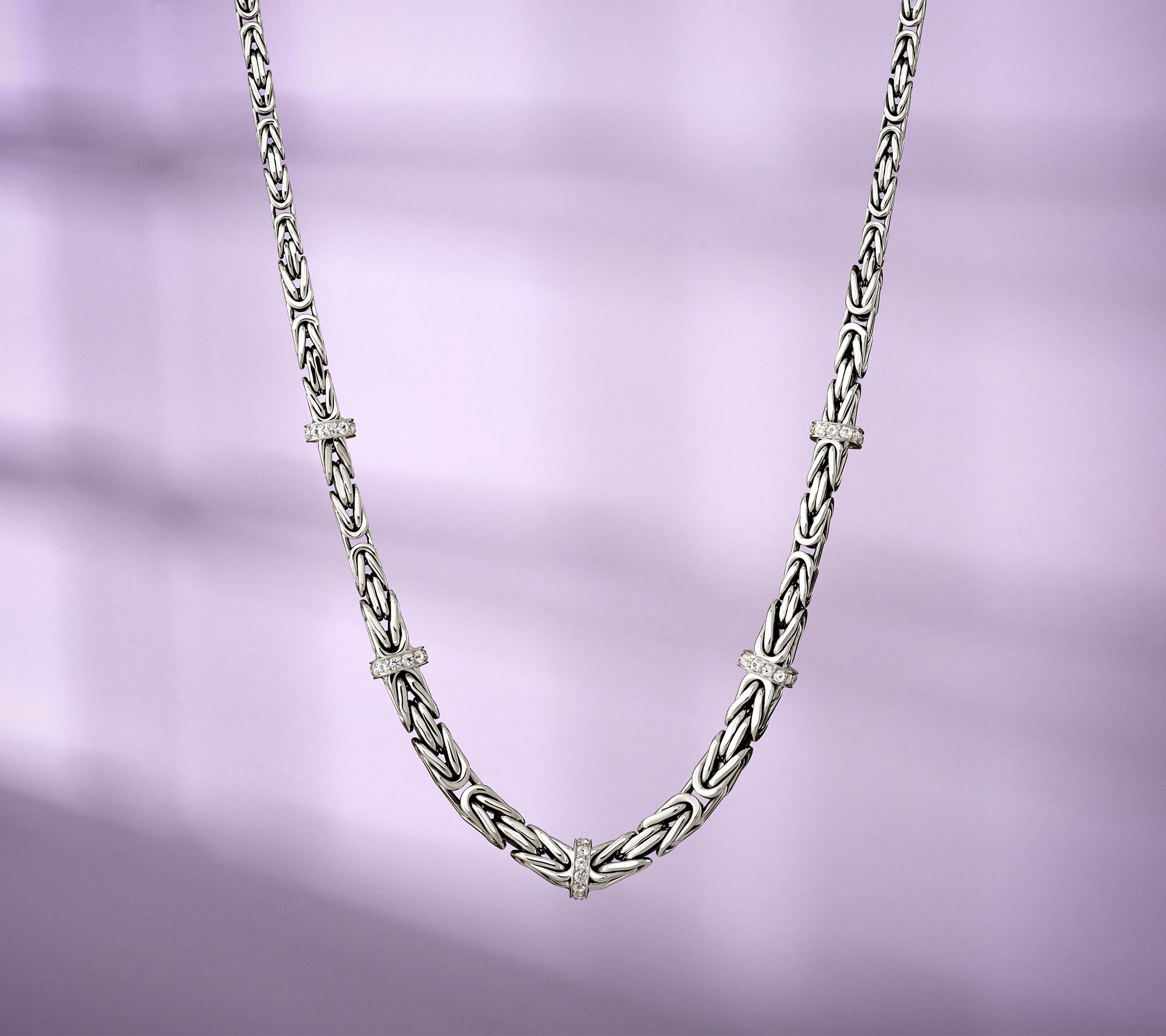 Five pave-set gemstone stations; graduated Byzantine chain in 3.5mm, 4.2mm, 5.1mm, and 6.2mm sizes; polished; oxidized
