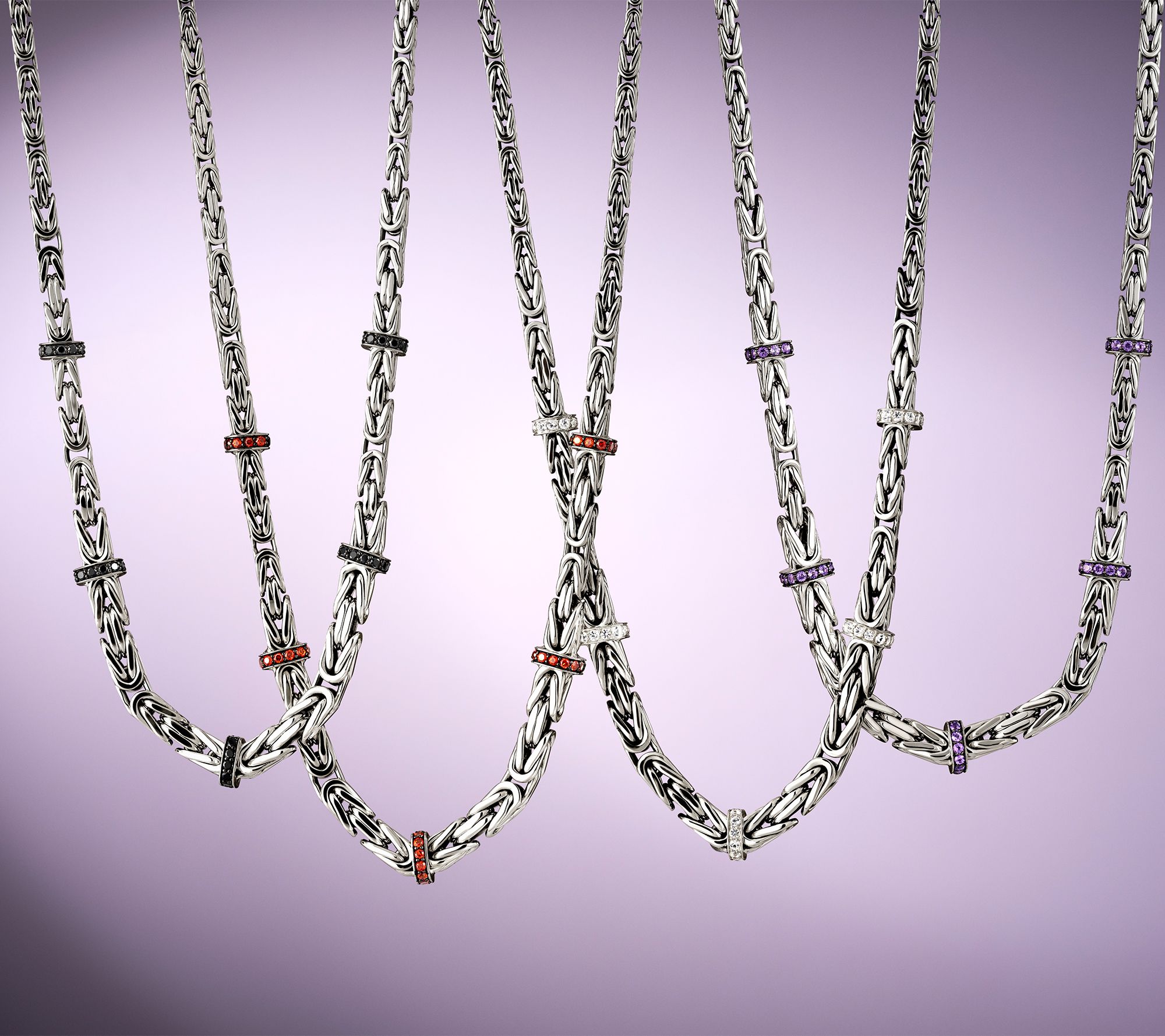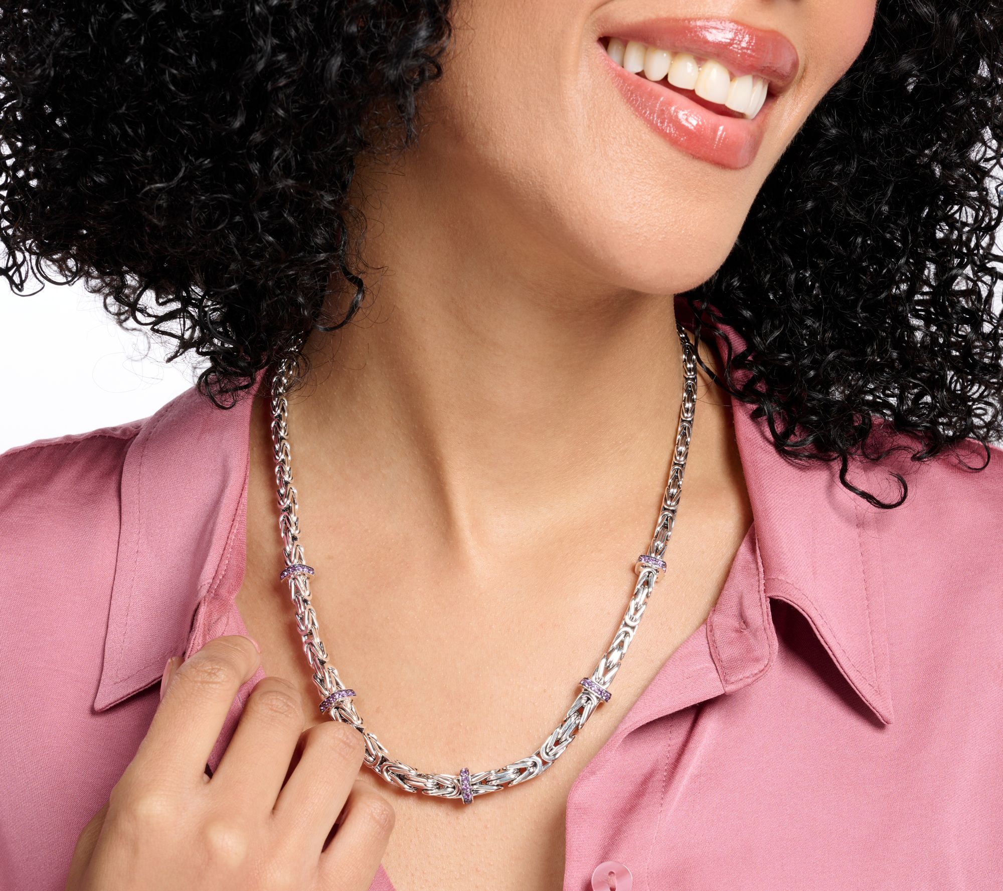 Next stop: gemstone stations! This graduated Byzantine necklace takes a turn for the dazzling with a fresh design of gemstone stations. Impactful and easy to lengthen, we love it paired with sweetheart necklines, V-necks, and turtlenecks of all stripes. From JAI.