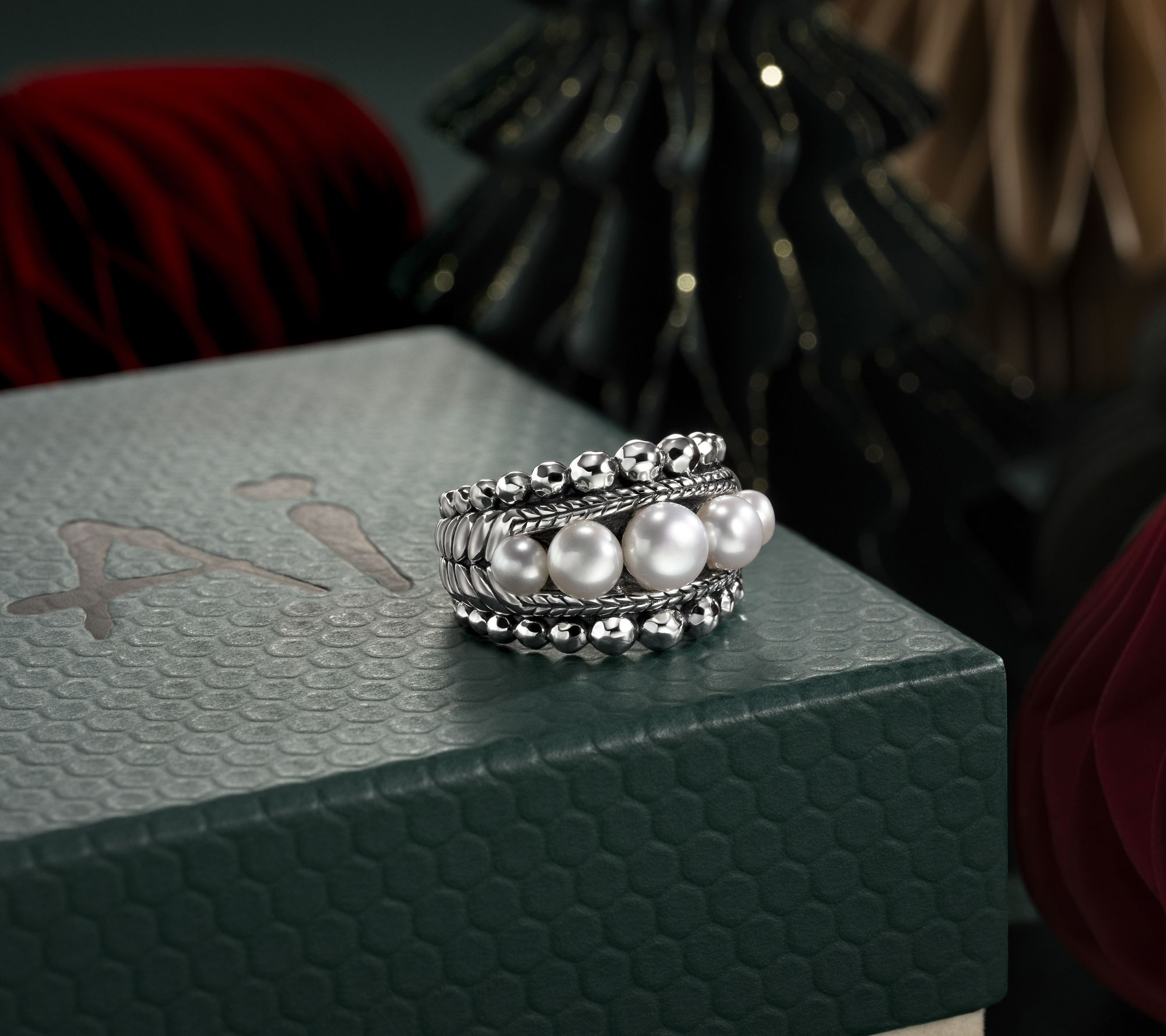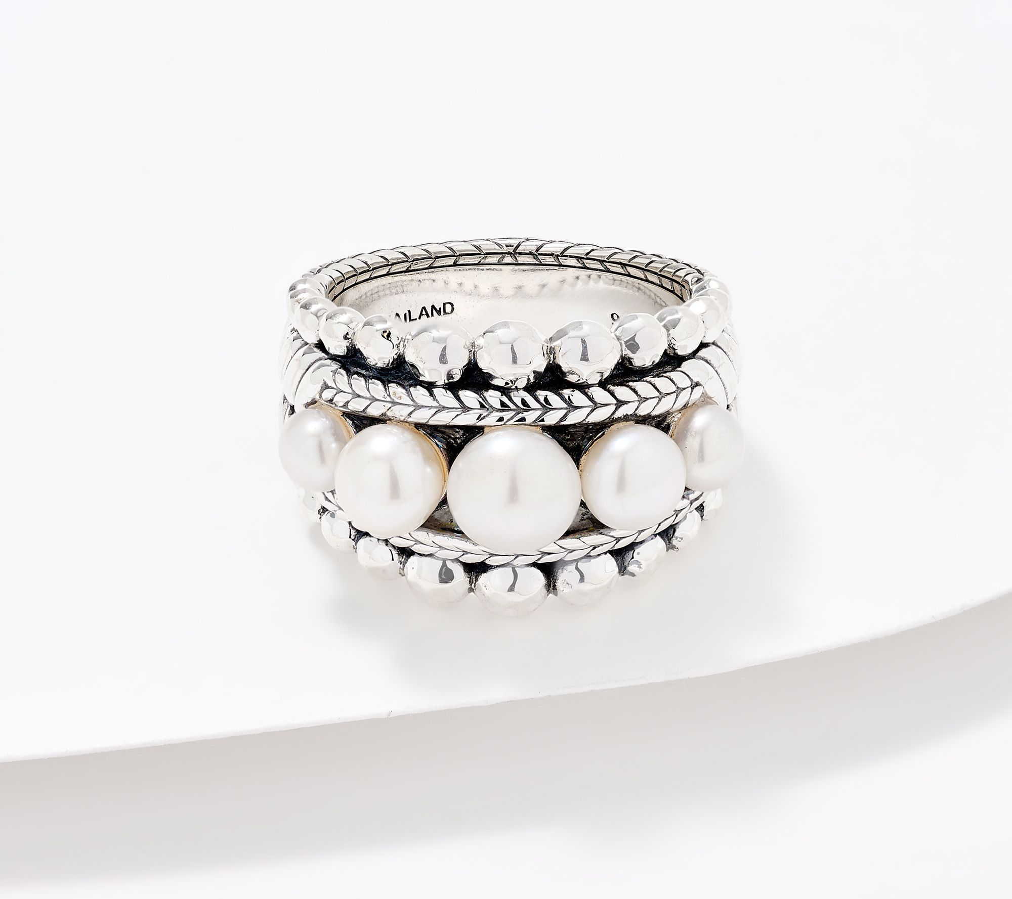 Cue the cultured pearls. An artful blend of classic elegance and modern styling, this cultured freshwater pearl band ring lends grace to everyday attire or special occasions. Graduated cultured freshwater pearls are beautifully set amidst basketweave textures and hammered bead accents, creating a stunning look that transitions seamlessly from day to evening. From JAI.