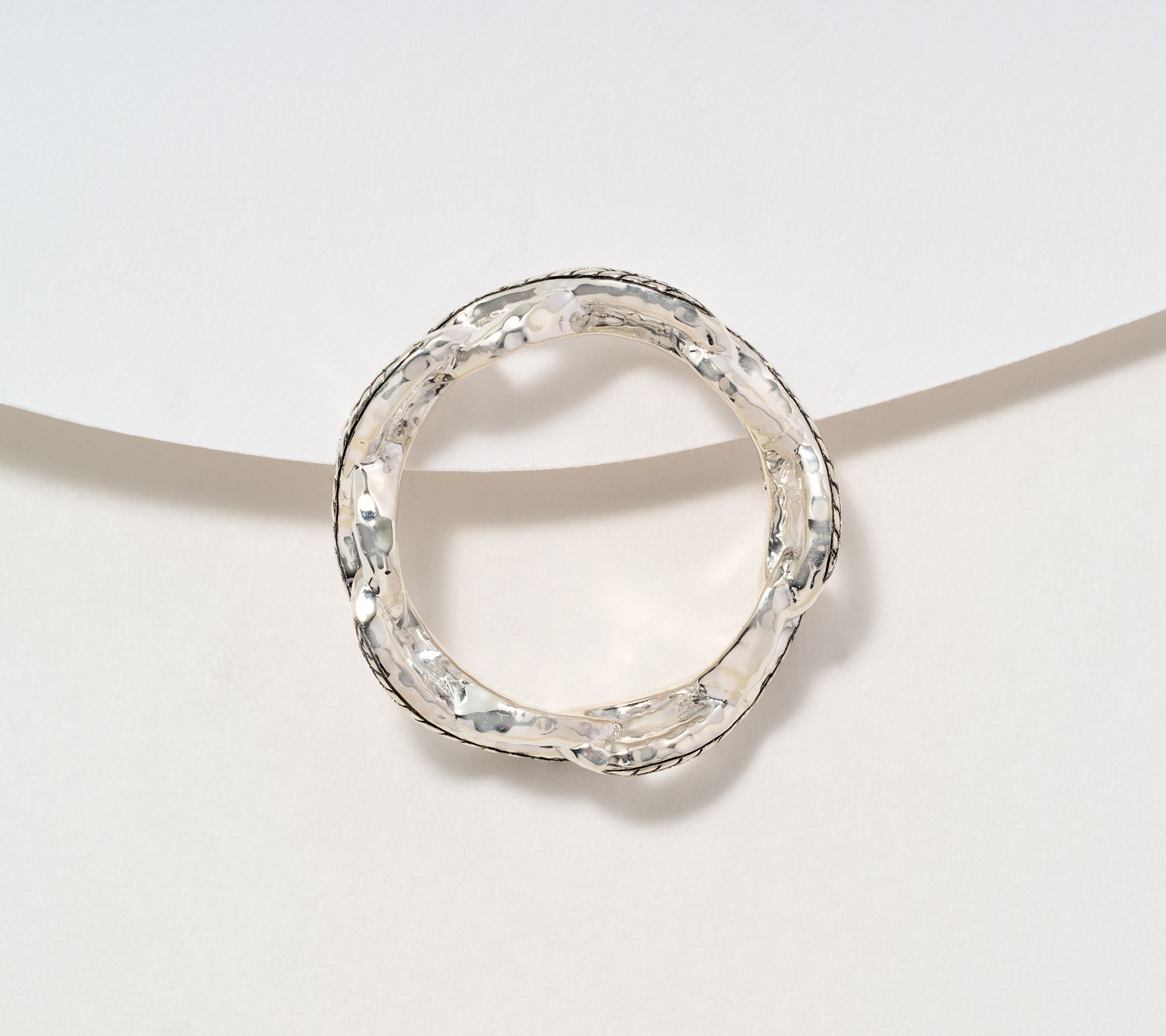 A symbolic representation of endless opportunities and limitless possibilities, this infinity band ring combines hammered and basketweave textures to create a memorable design. From JAI.
