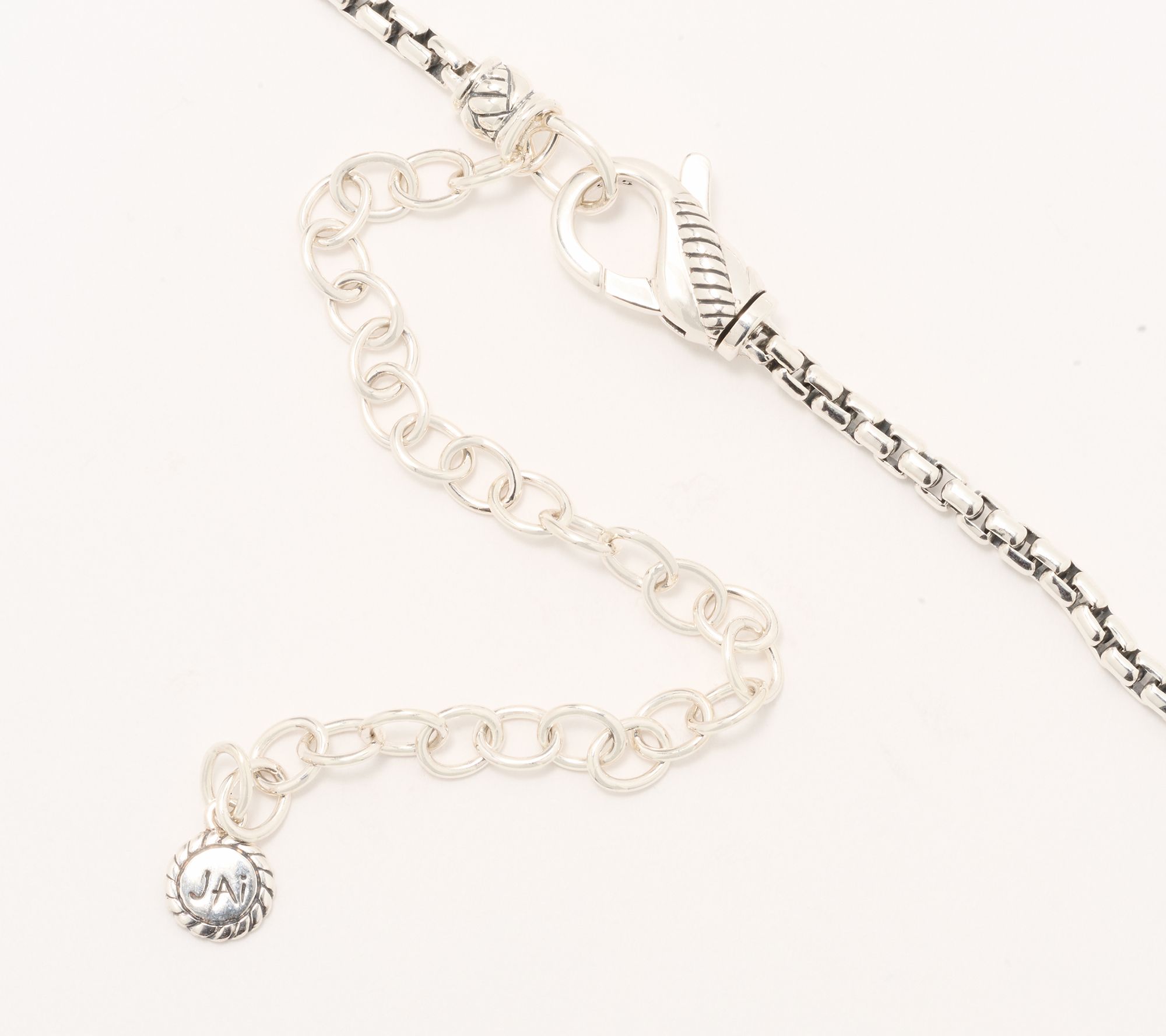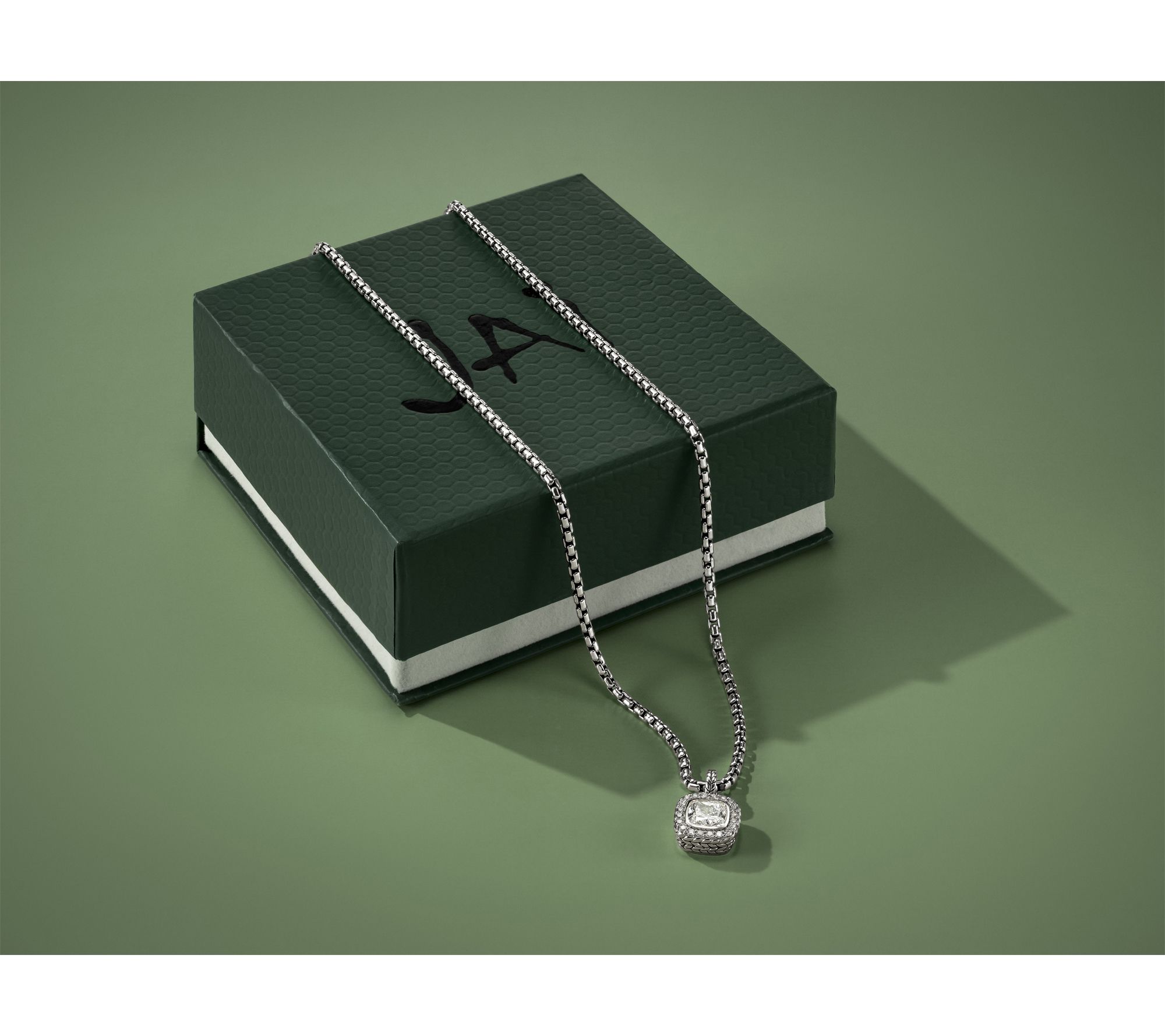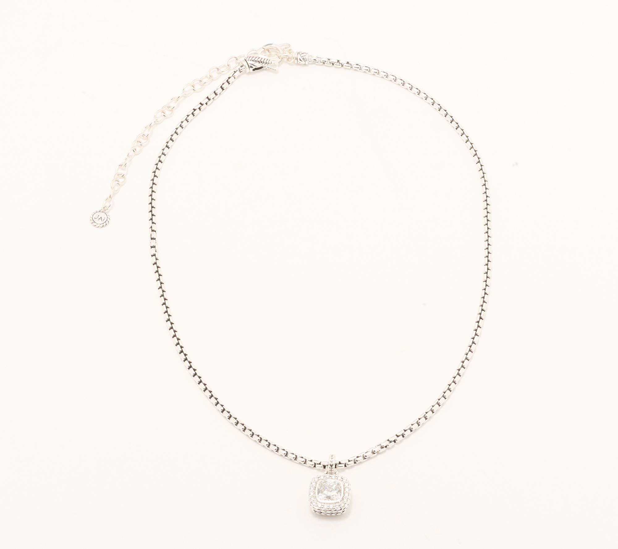 Give your look a modern upgrade with this gorgeous box chain necklace, showcasing a non-removable pendant with a cushion-cut lab-grown diamond at the center and a sparkling halo of round lab-grown diamonds. The basketweave textured sterling silver and sleek, polished finish let you go from day to night with style, while the Sukhothai lobster claw clasp keeps everything secure. From JAI.