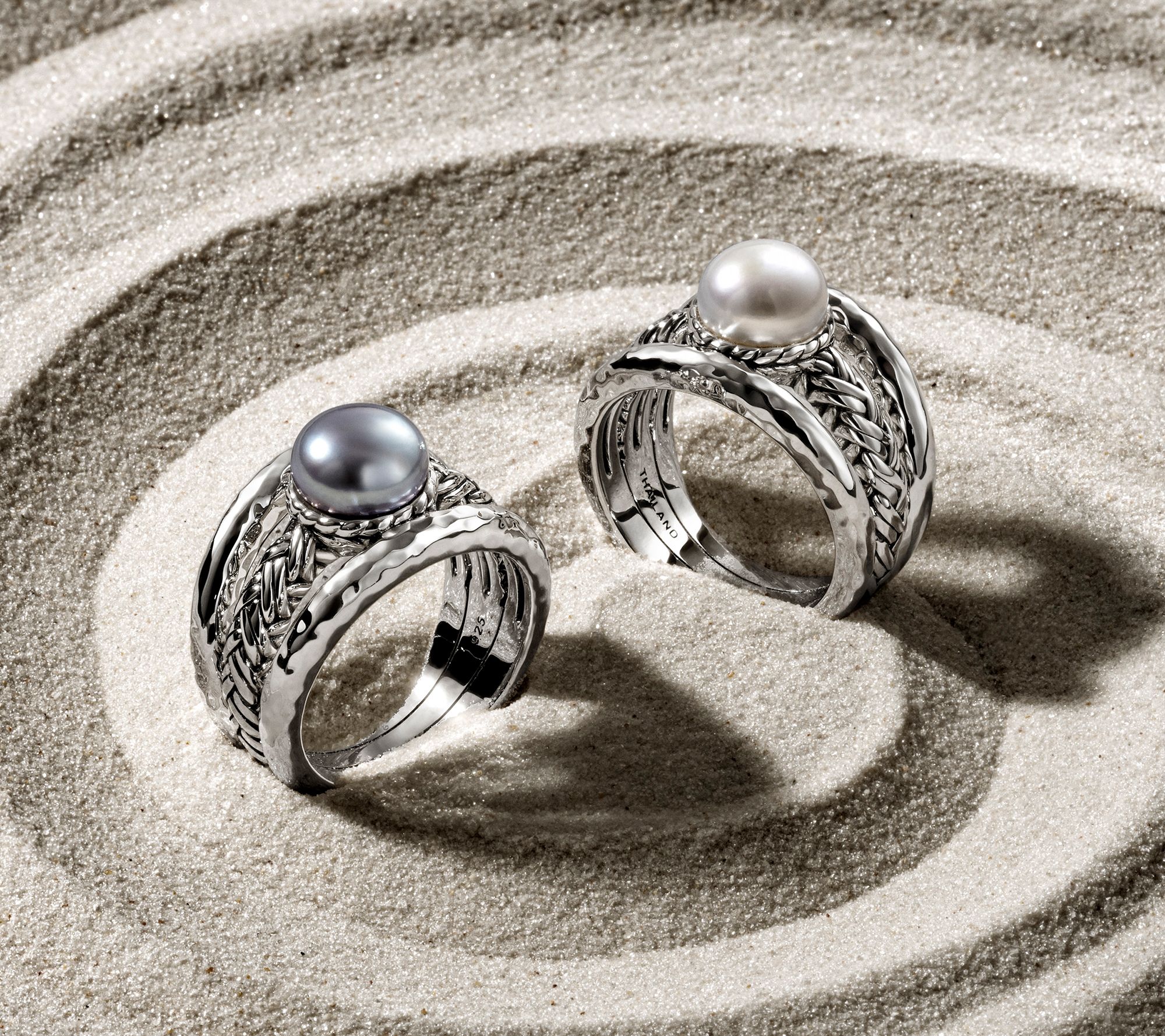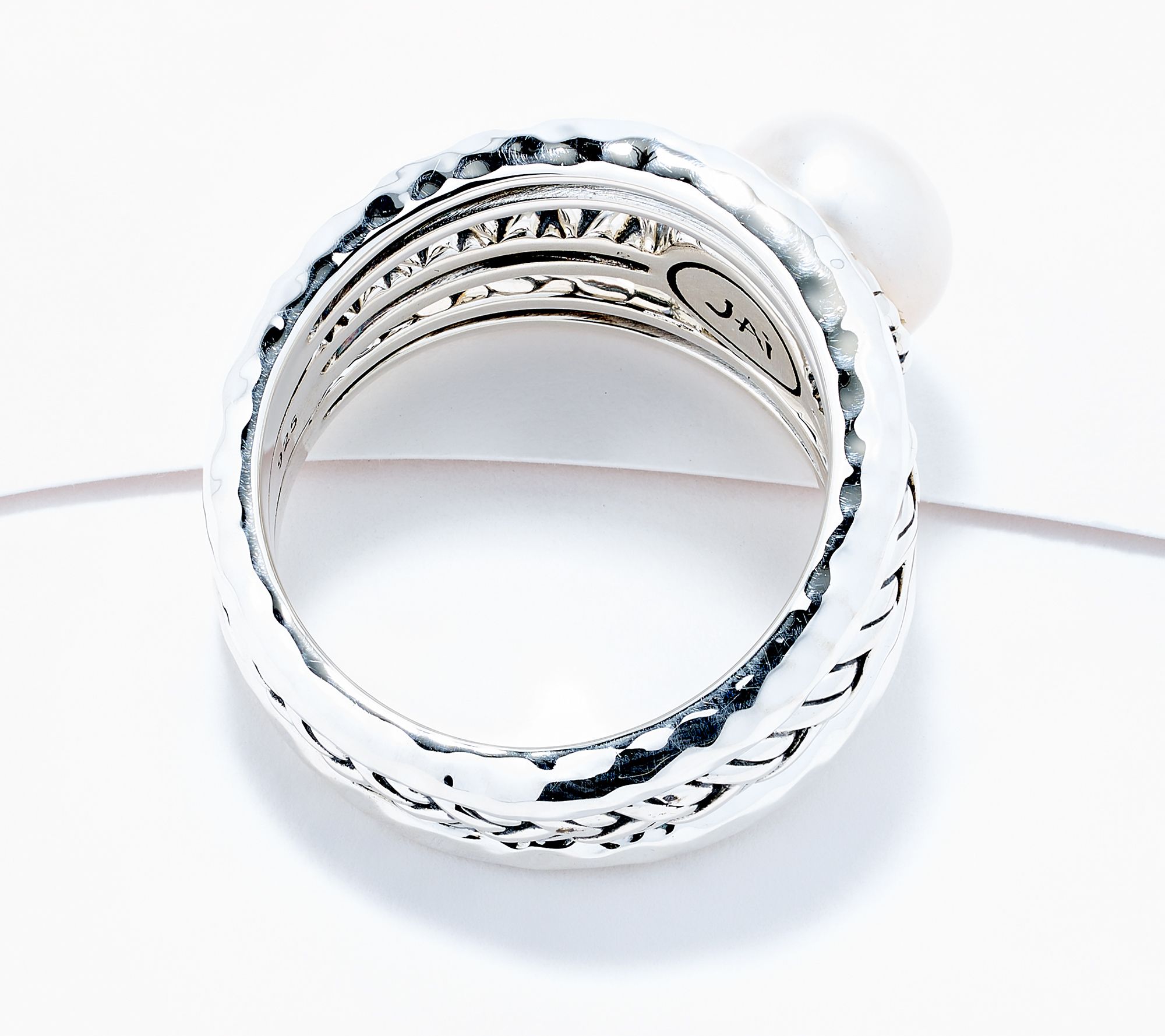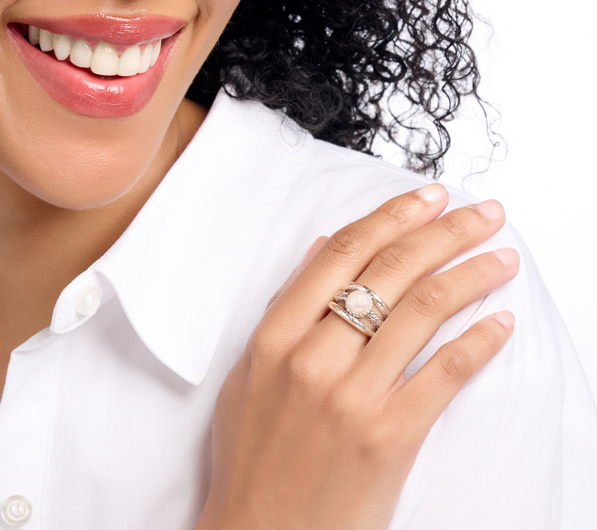Bringing texture and subtle shine to your everyday style, this sterling silver ring pairs an intricately woven legacy motif with a luminous cultured freshwater pearl in your choice of white or grey. The hammered accents add extra interest, making it easy to dress up for a dinner out or add flair to your favorite weekend outfit. From JAI.