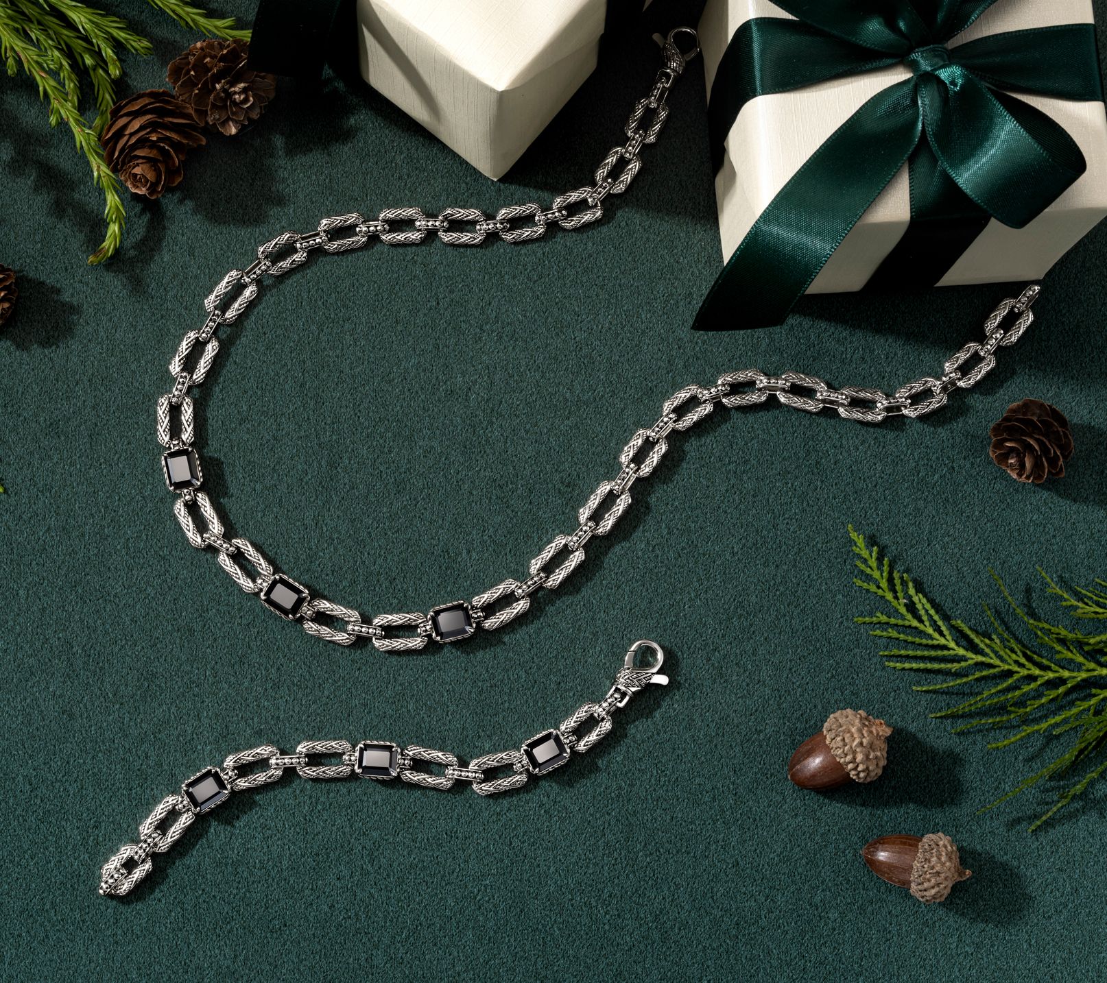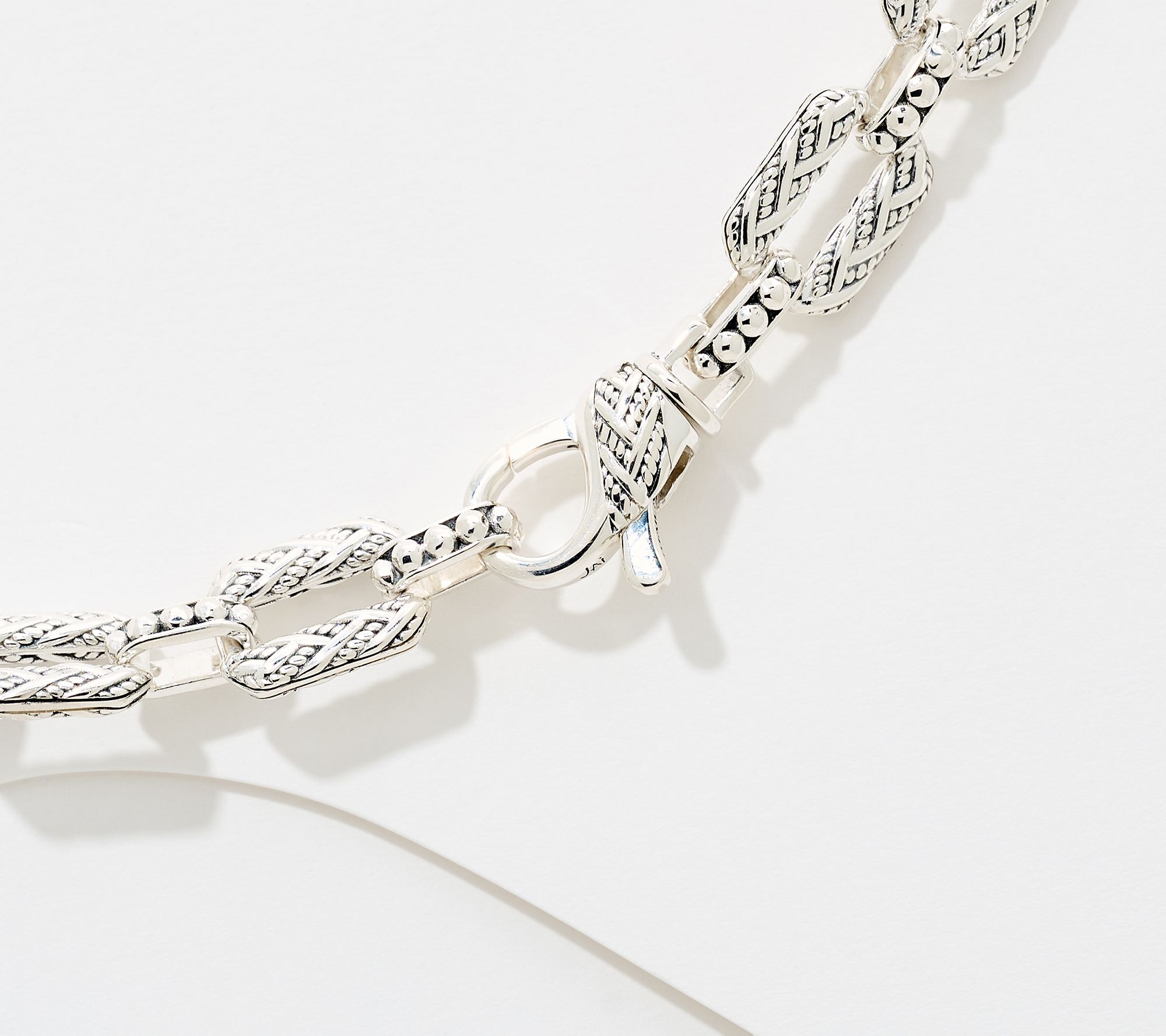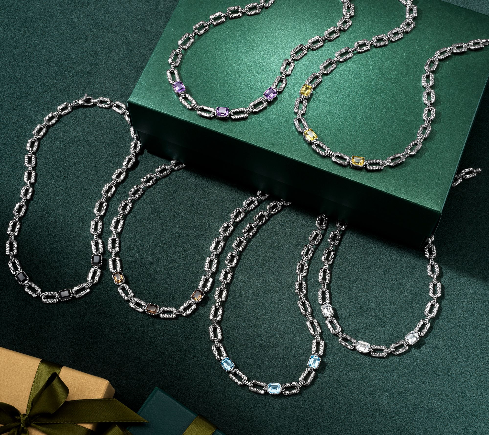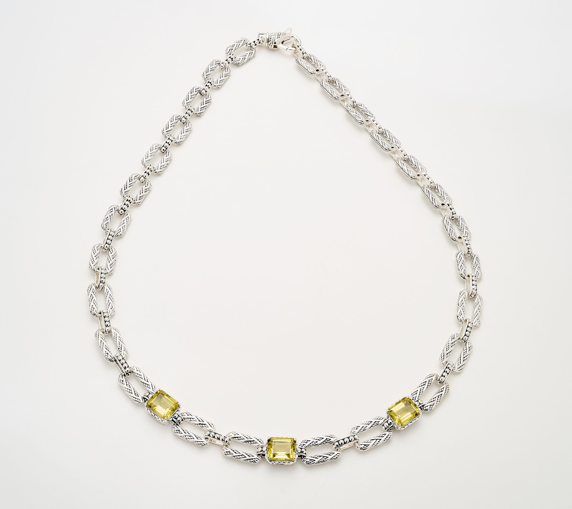 Reminiscent of cherished heirlooms, this sterling silver woven link necklace radiates sophistication for milestone celebrations or everyday style. Emerald-cut gemstones add a welcome pop of color, catching the light with every movement, while hammered bead accents and intricate links lend refined detail to your neckline. From JAI.