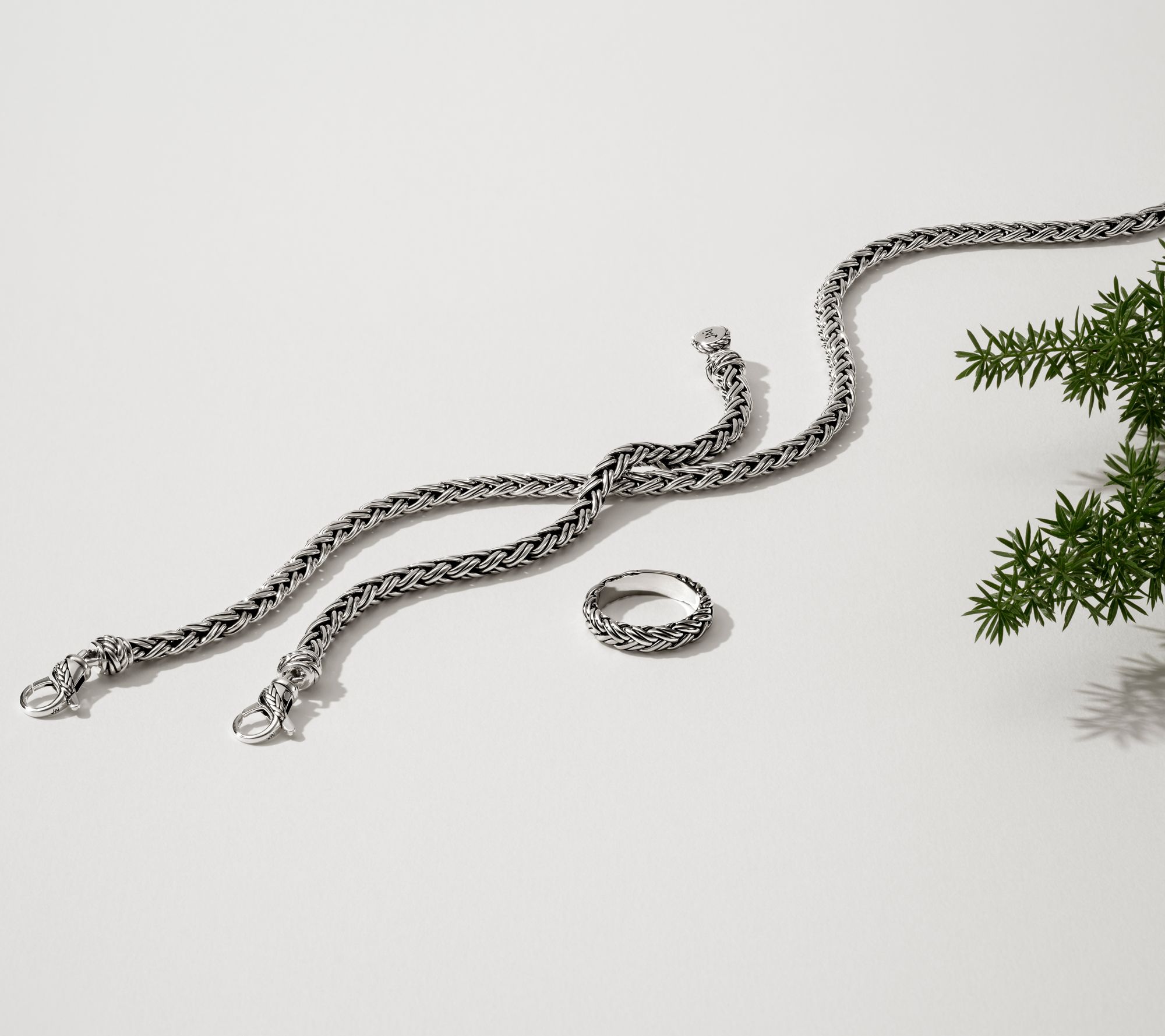 • Woven chain texture; polished finish; oxidized