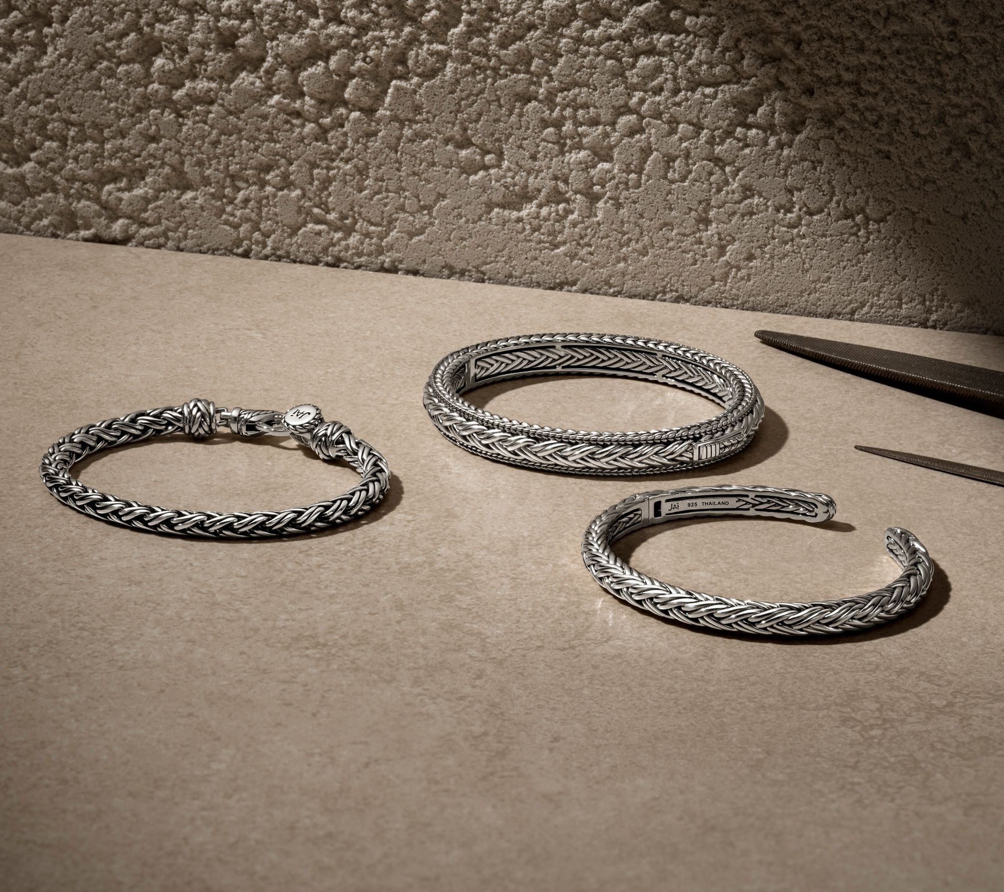 Imagine accessorizing your every moment with the effortless elegance of this artisan-crafted bangle. Its woven and basketweave textures create a captivating play of light on sterling silver, inviting admiration with every movement. From JAI.