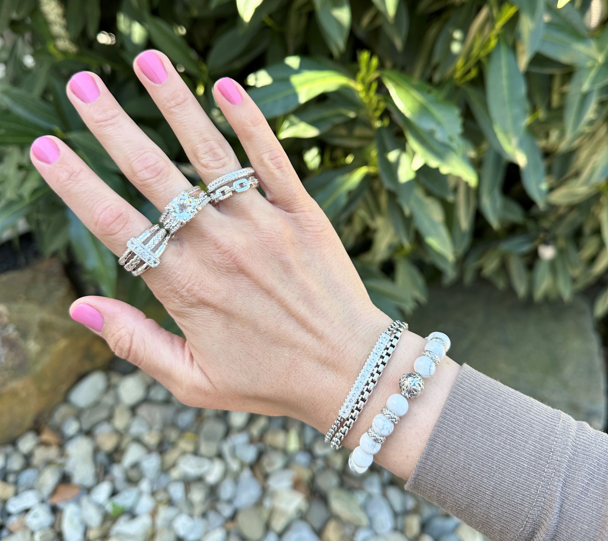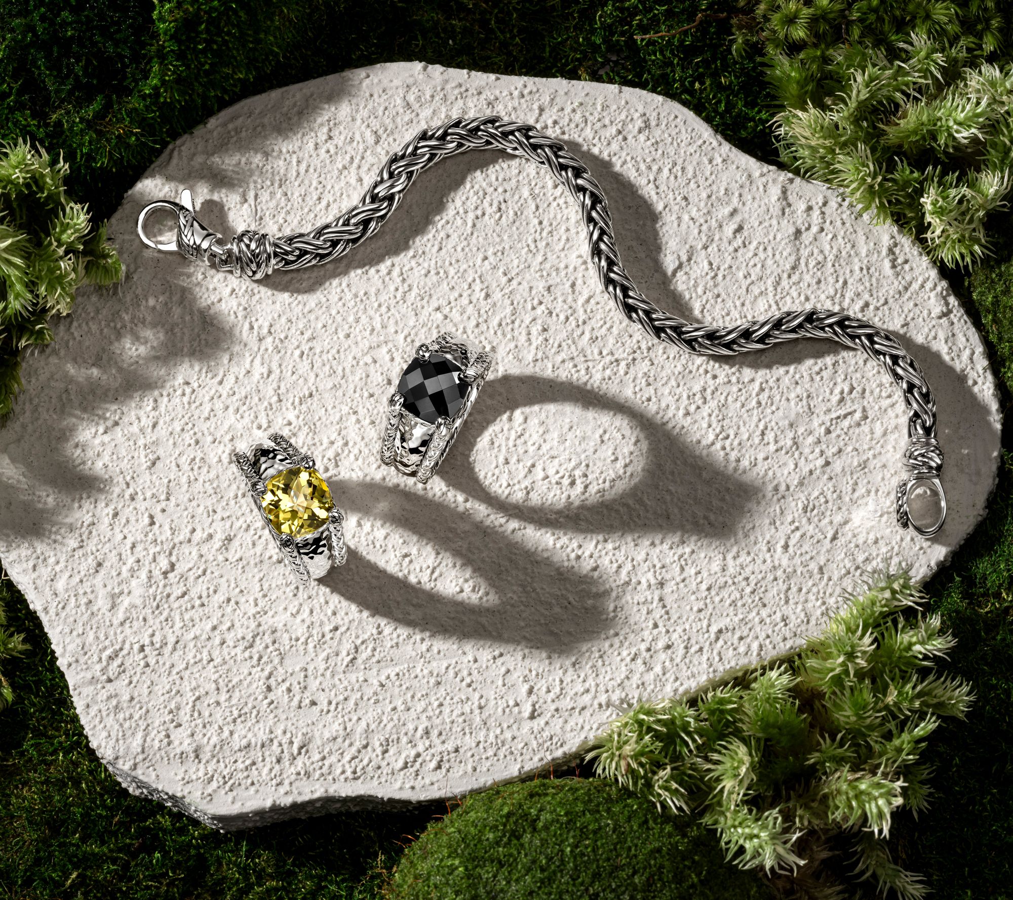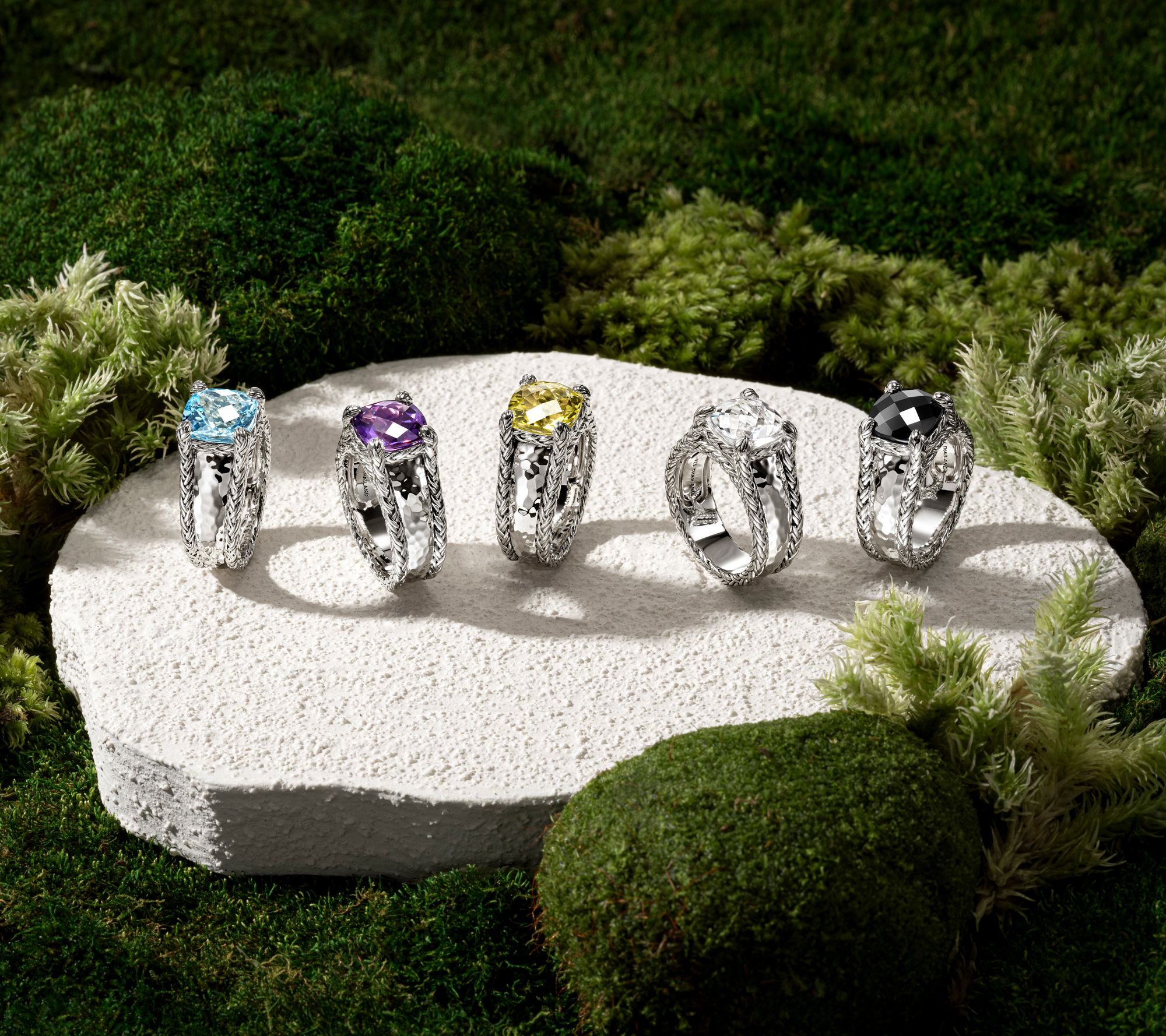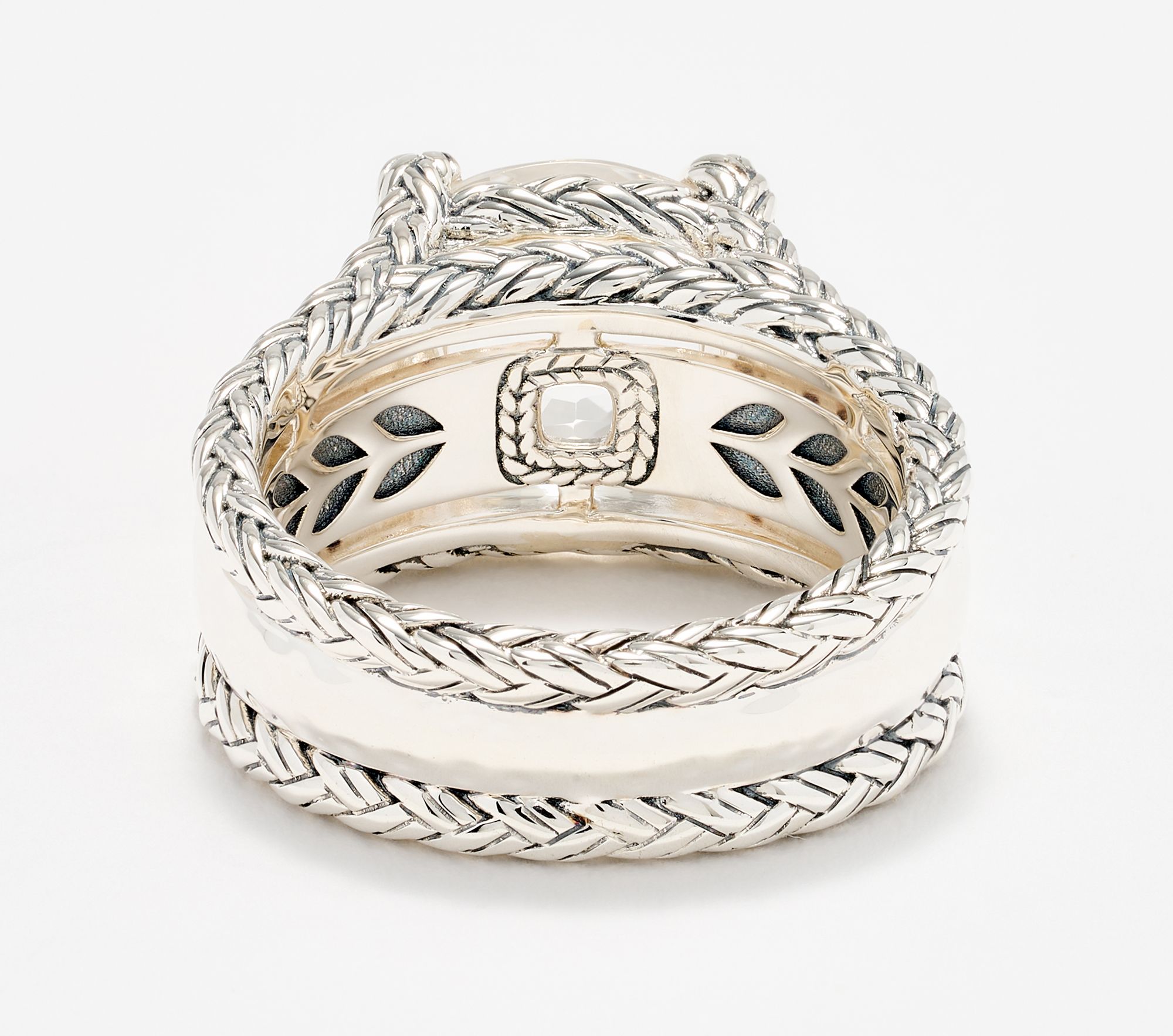 Prong-set, cushion-cut, faceted gemstone; woven and hammered textures