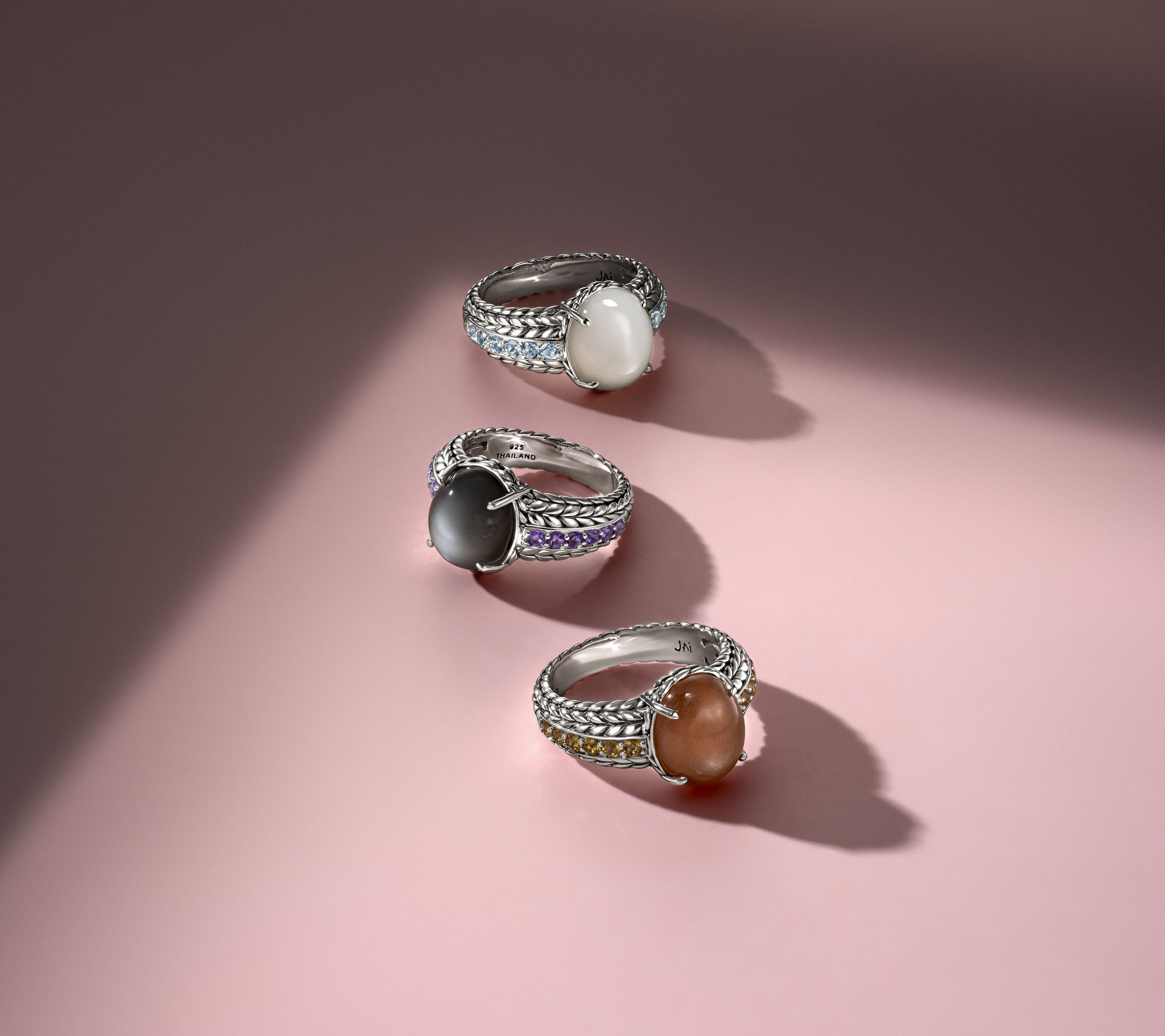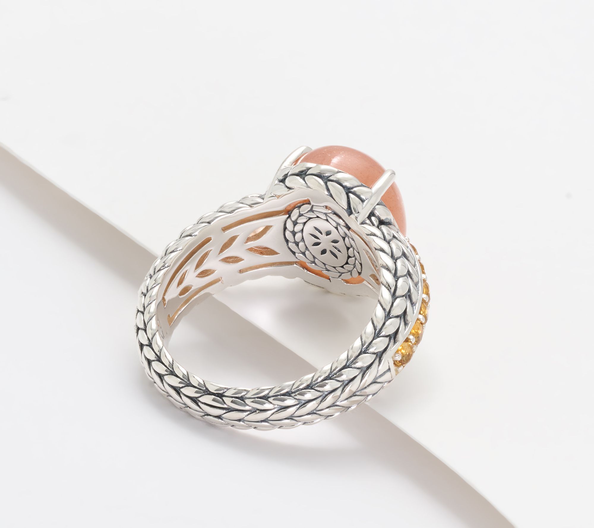 Give your everyday style an artisan twist with this JAI sterling silver ring, where textured basketweave, a luminous cabochon, and side gemstone accents create a can't -miss look. Pair it with your usual stack or let it shine solo for coffee catch-ups and special dinners alike. From JAI.