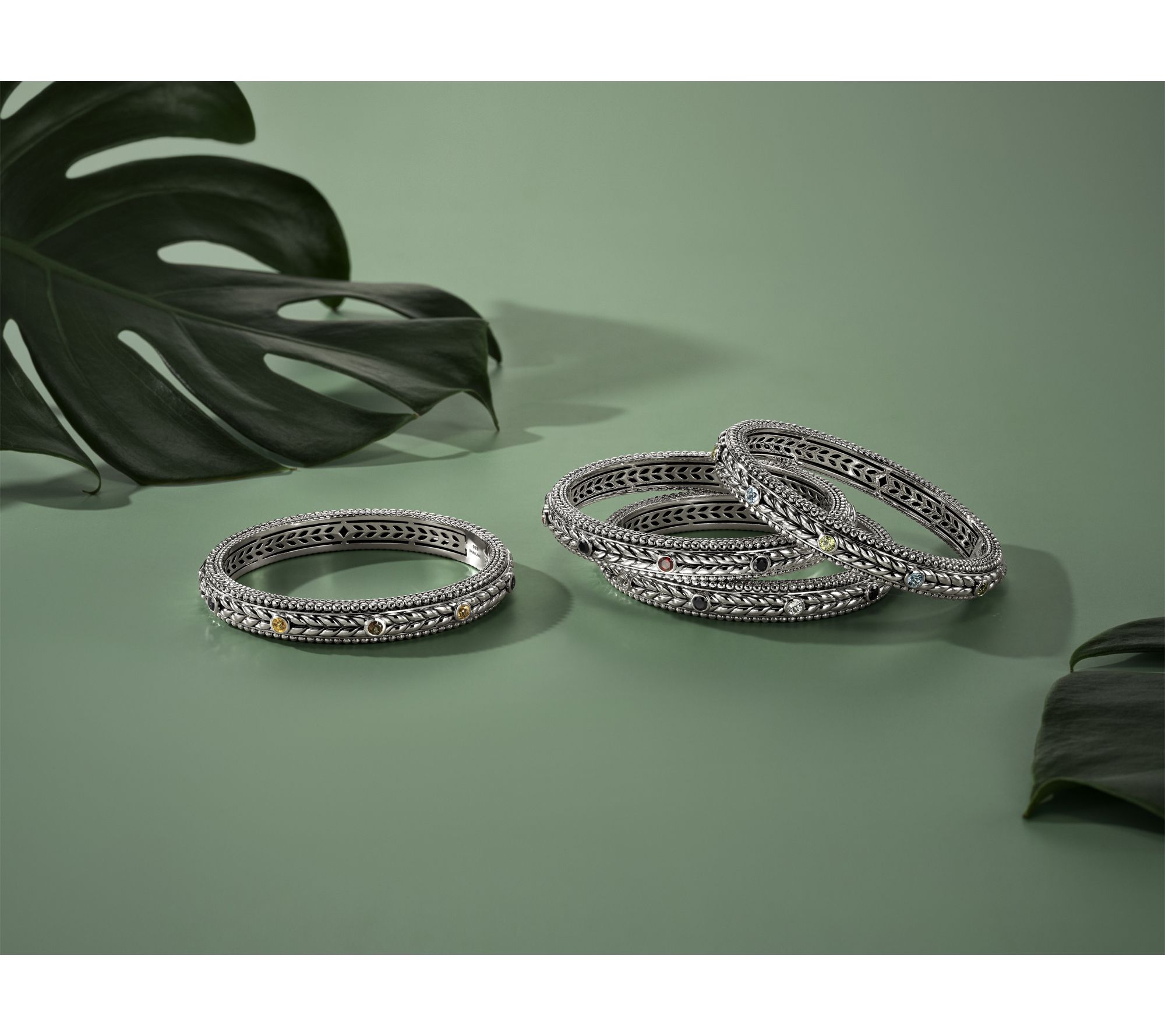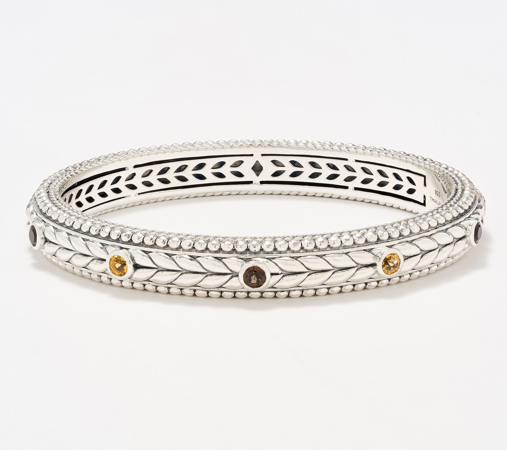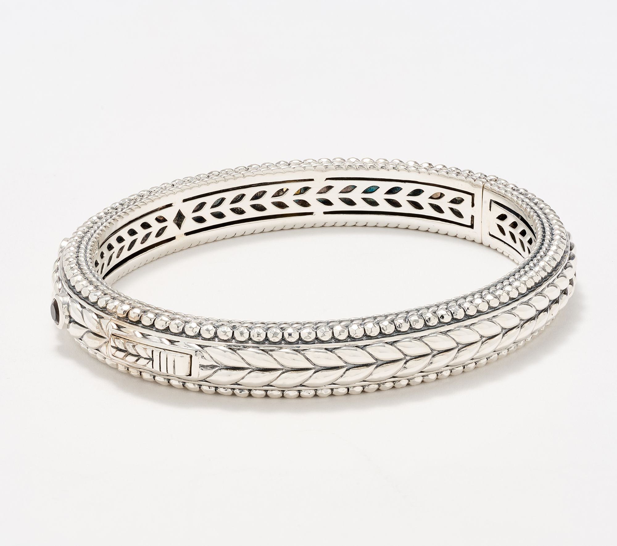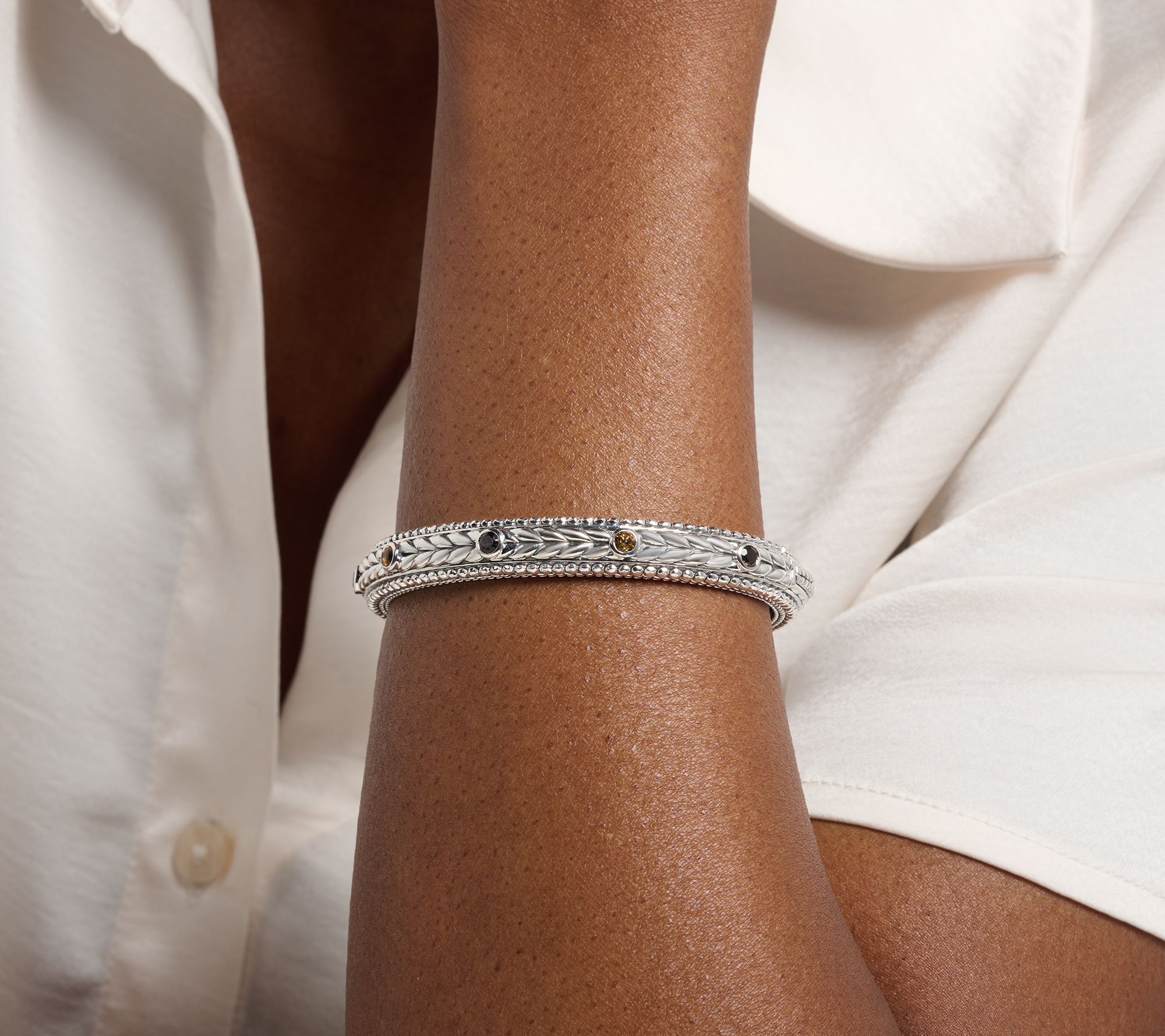 Polished basketweave texture and glimmering hammered beads bring lively detail to this sterling silver bangle, while bezel-set gemstones offer up a splash of color for the wrist. Whether enhancing your office attire or pairing with weekend outfits, its hinged design and classic silhouette make it easy to wear and style for any occasion. From JAI.