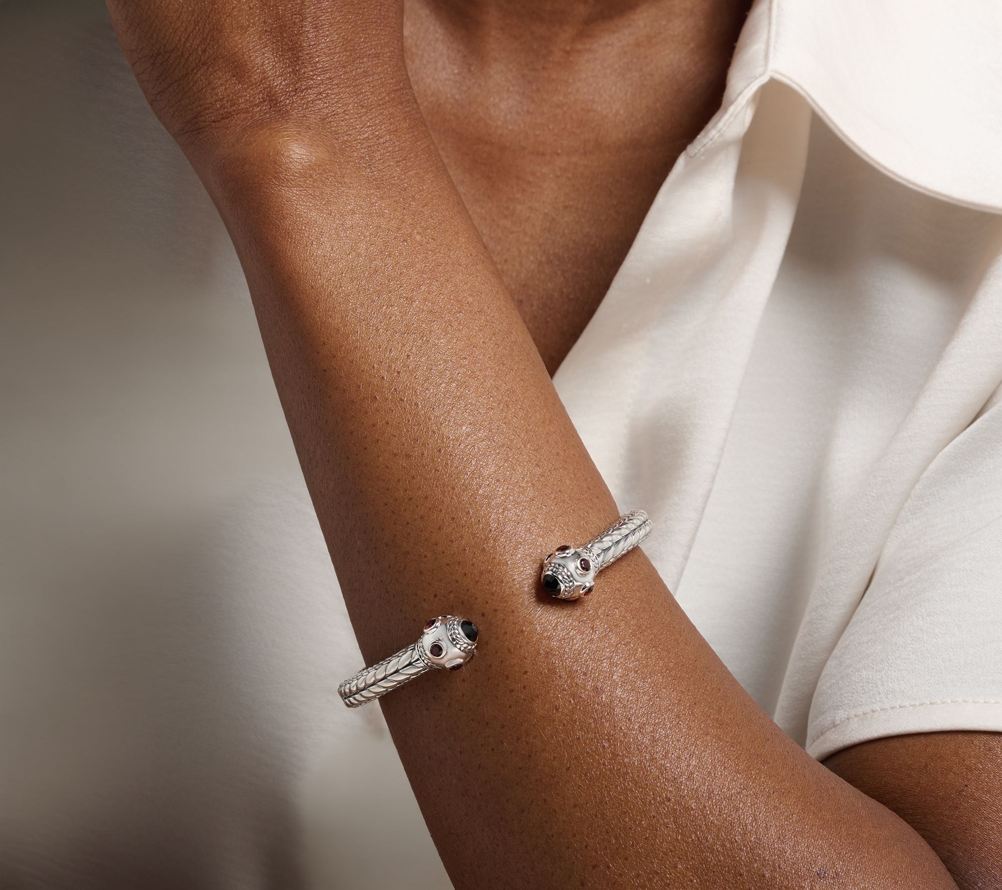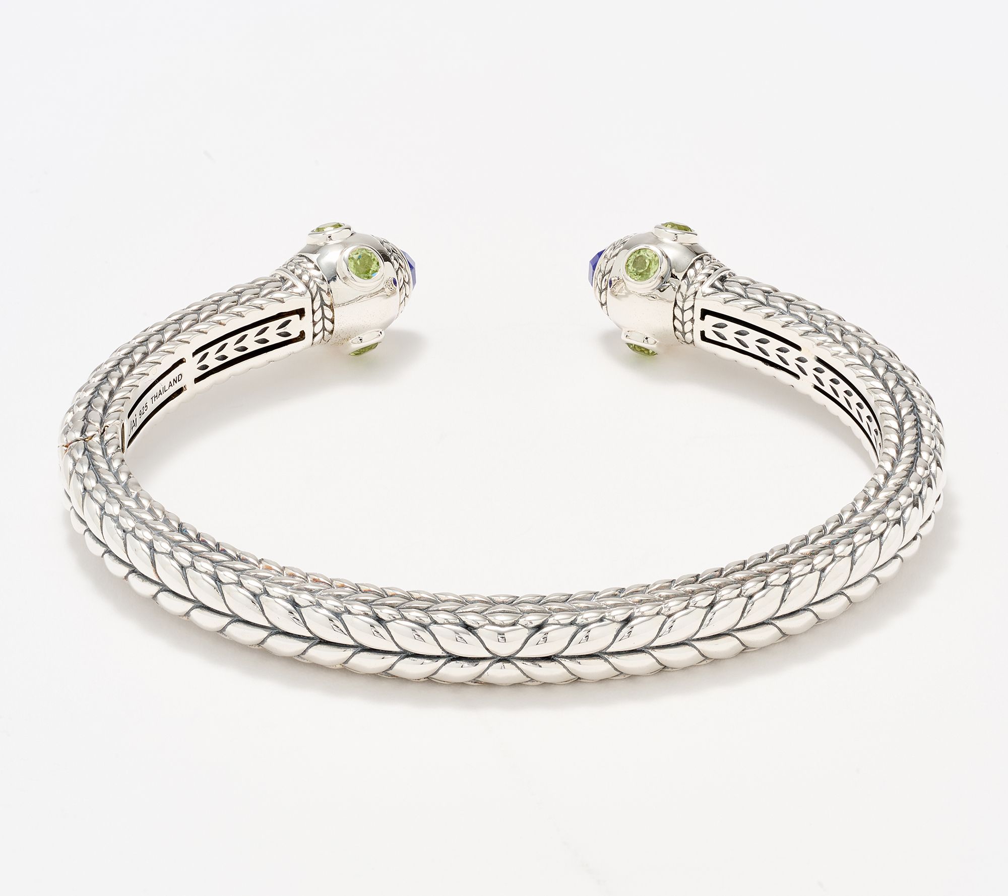 A fusion of color and texture, this sterling silver cuff bracelet features bezel-set gemstones accented by a classic basketweave design. Its oxidized finish shines whether you layer it or let it stand alone, and the hinged opening lets you slip it on with ease for any occasion. From JAI.