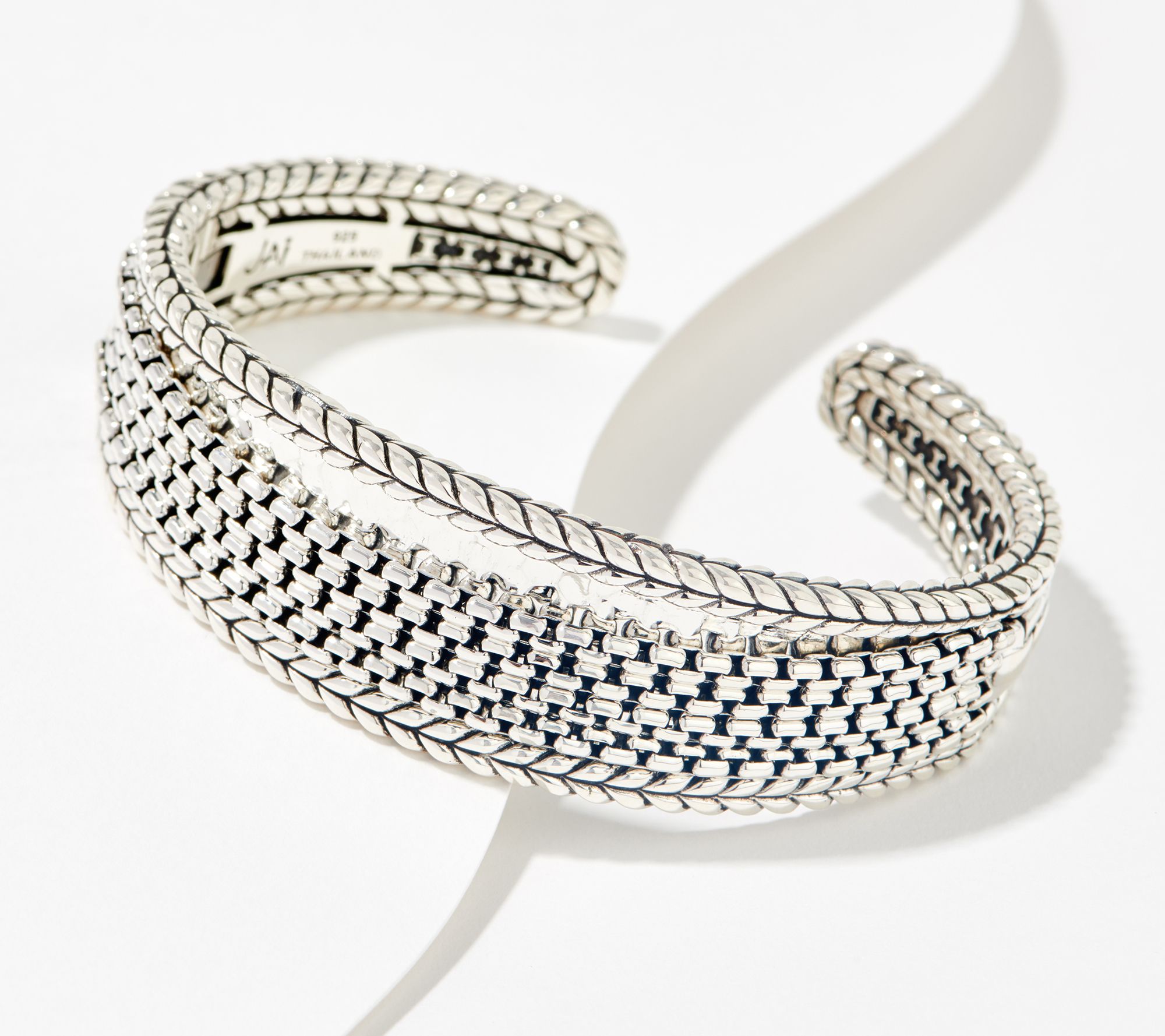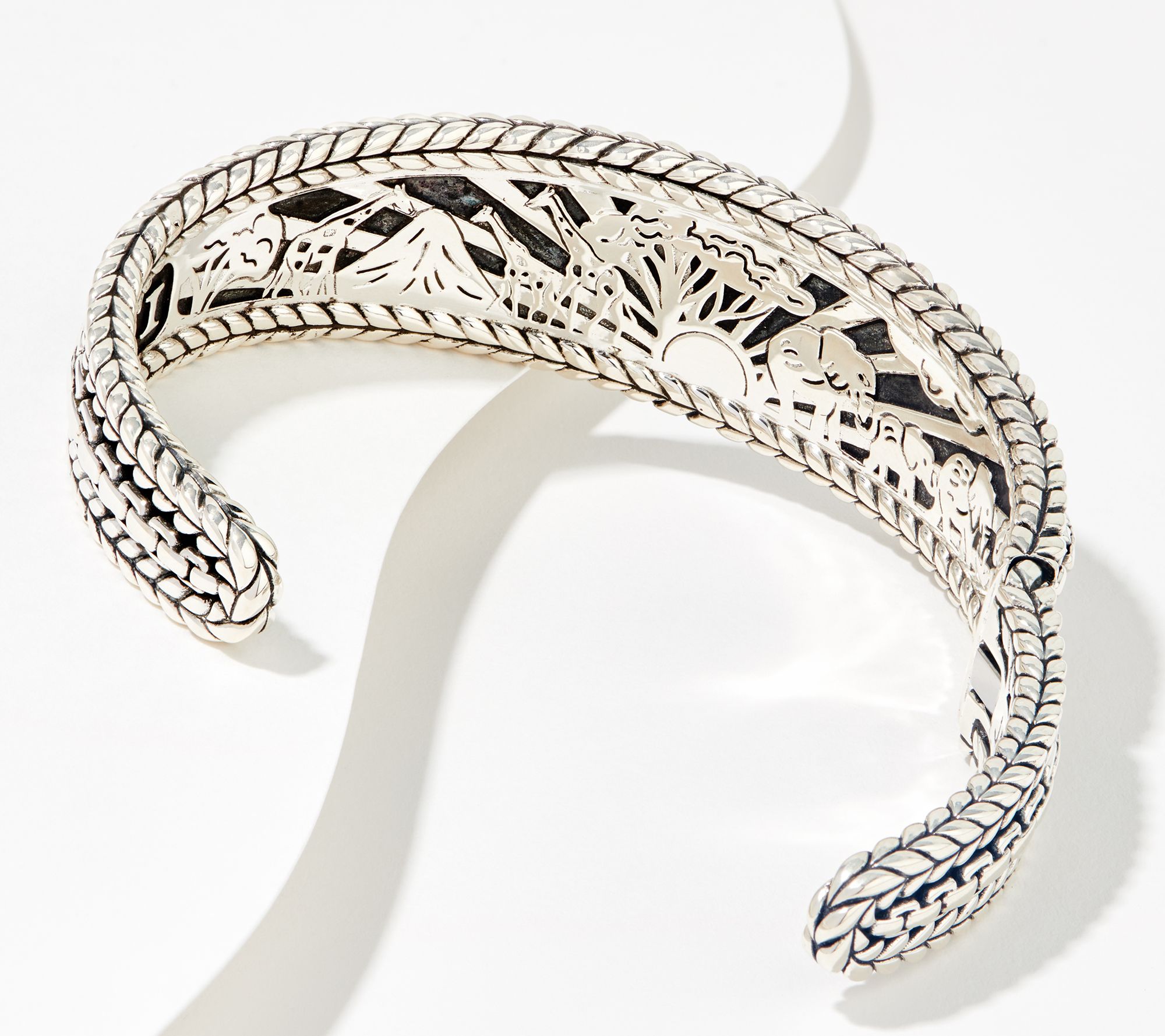 Cuff design; four strands of 2.7mm box chain; hammered and basketweave-texture edges; carved scene of African animals on back grill; slightly oxidized; polished finish