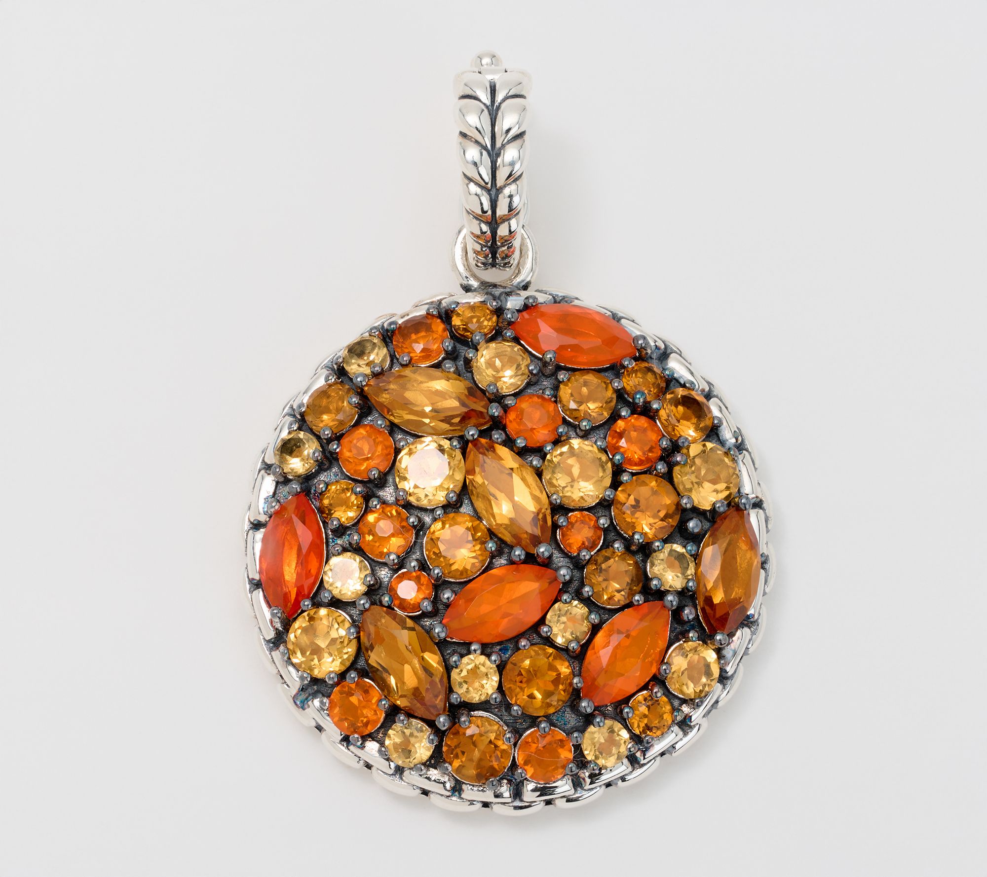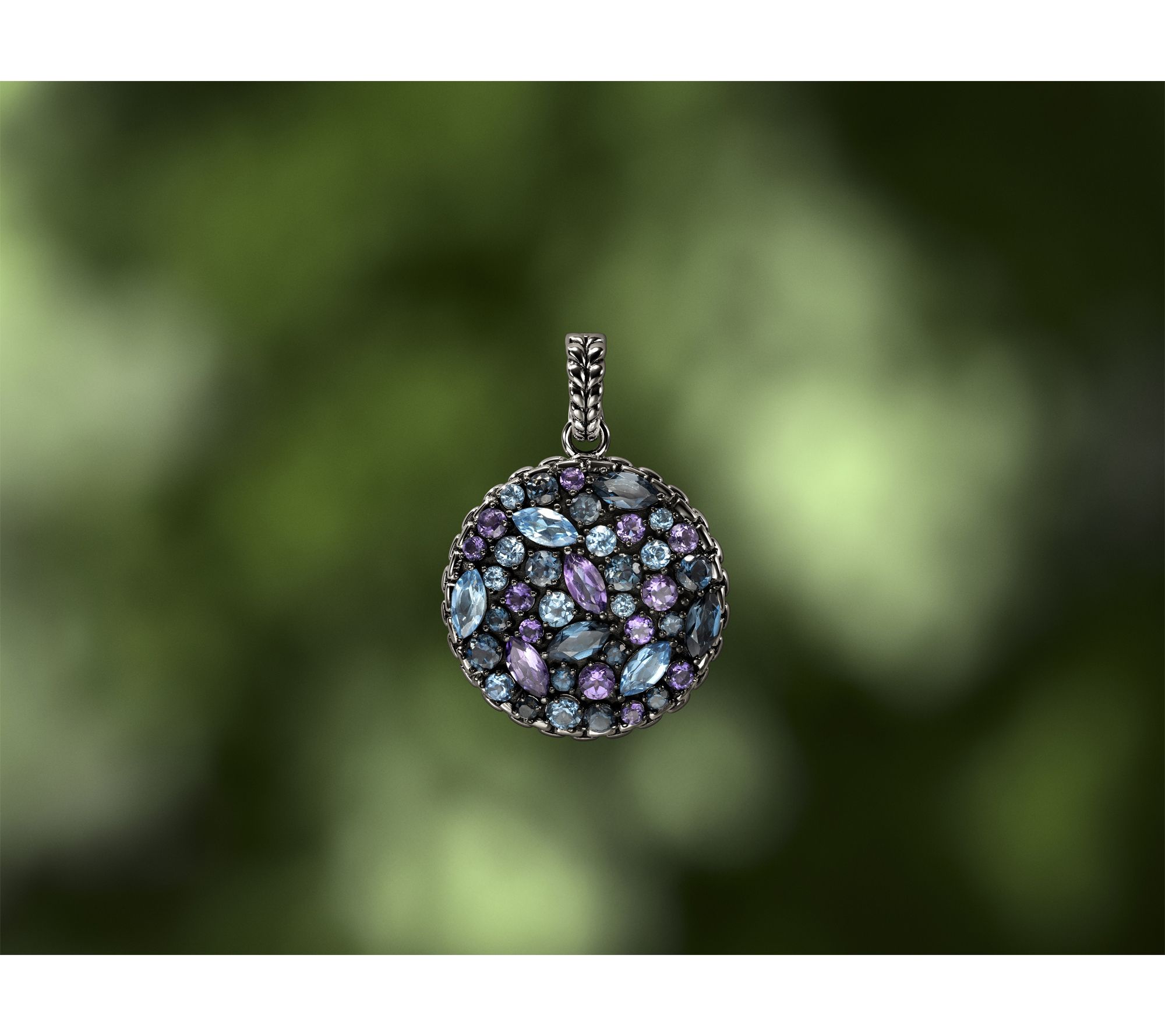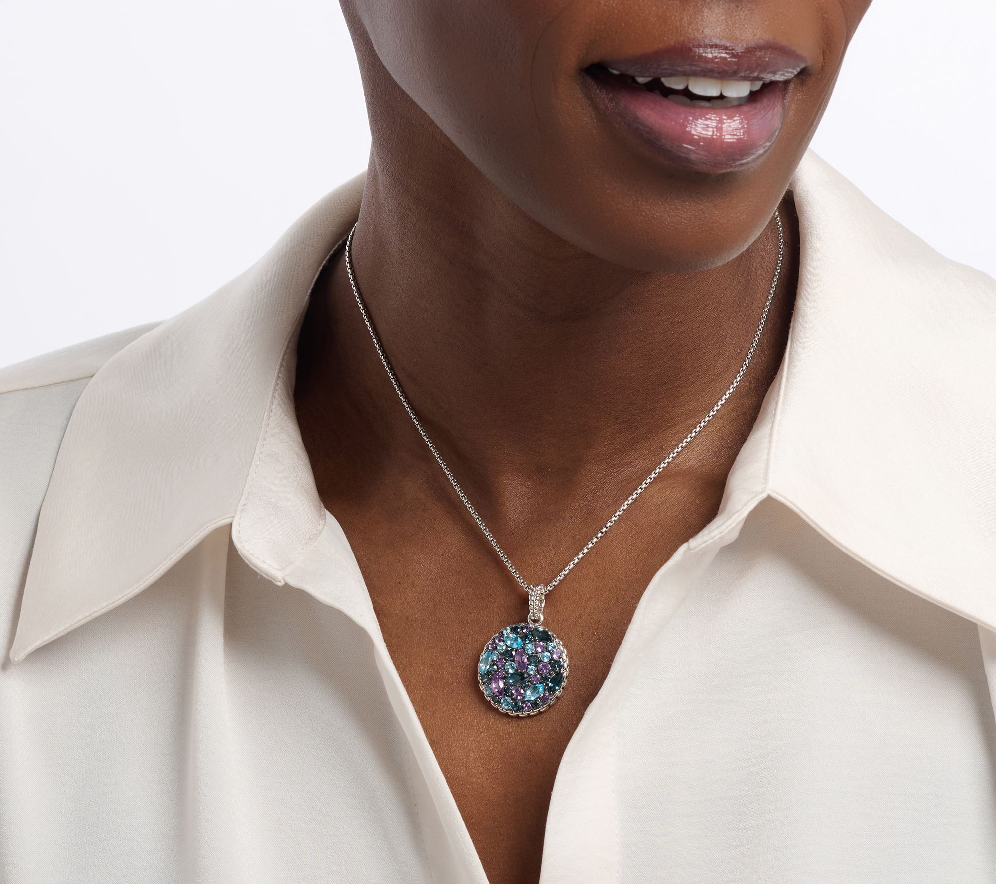Grace your favorite chain or bracelet with this sterling silver multi-gemstone enhancer, elegantly finished with a polished and oxidized look. The array of pave-set gemstones provides a colorful highlight for office days or special evenings, while the detailed basketweave bail and secure snap hinge make it easy to switch up your style. From JAI.