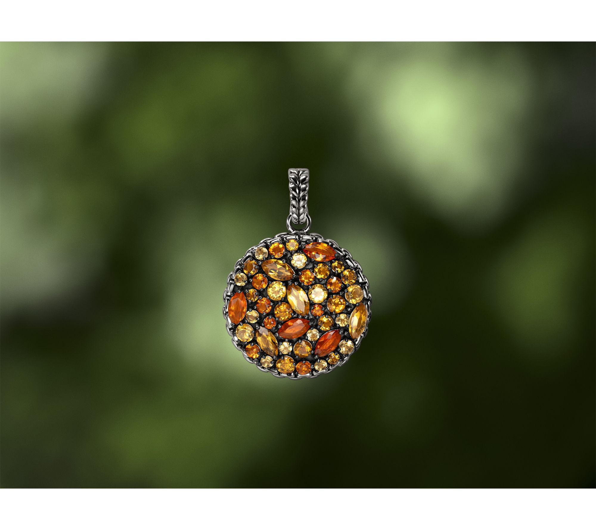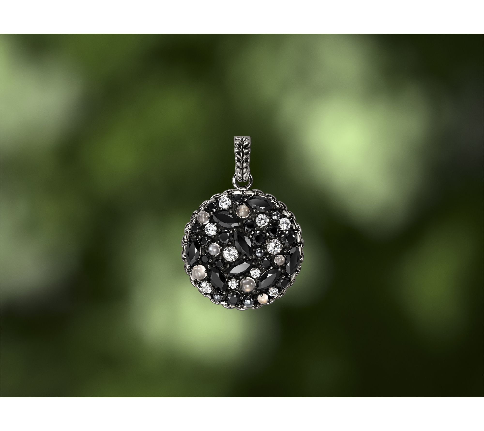 • Disc shape; box chain texture; pave-set gemstones; basketweave bail; oxidized; polished finish