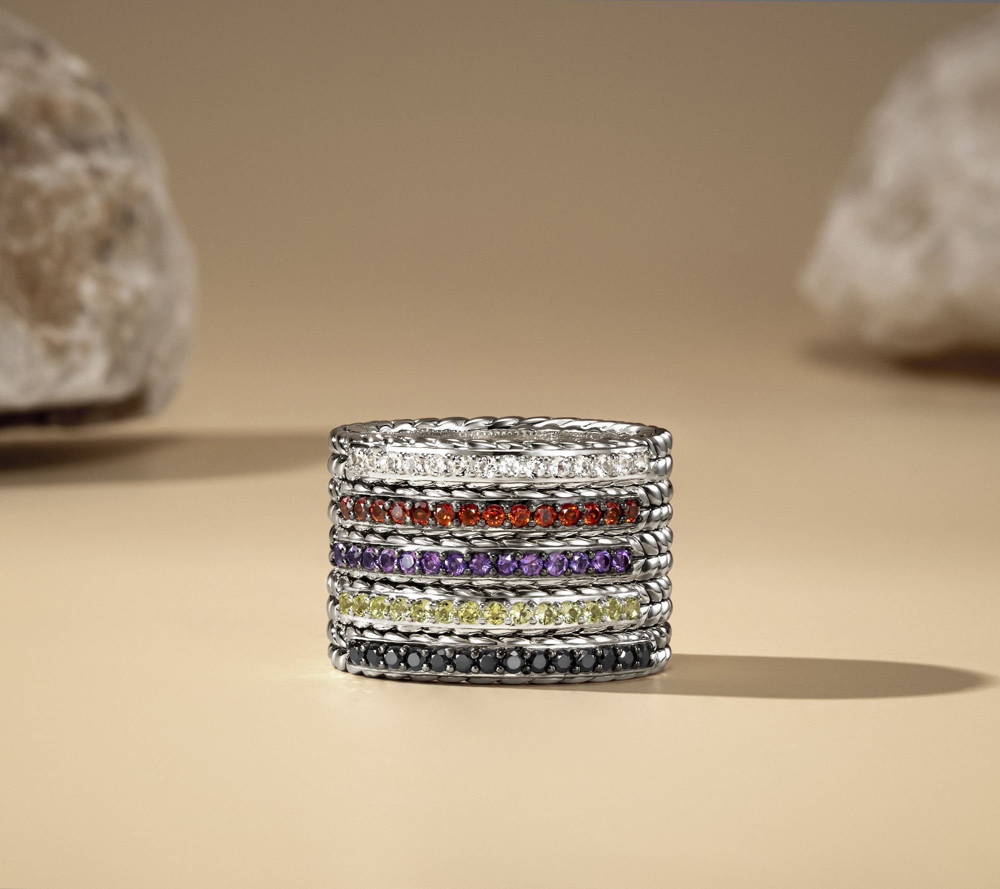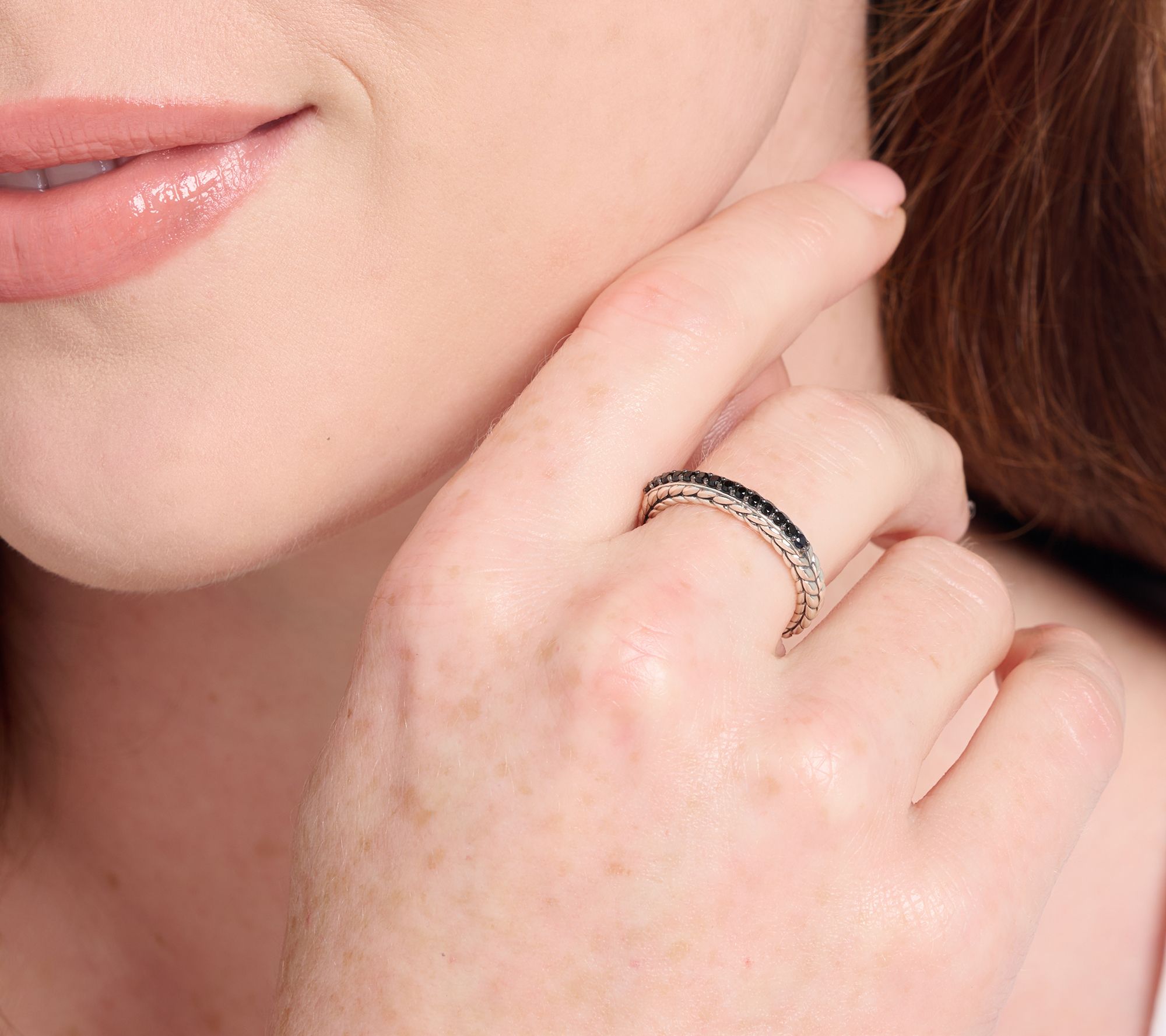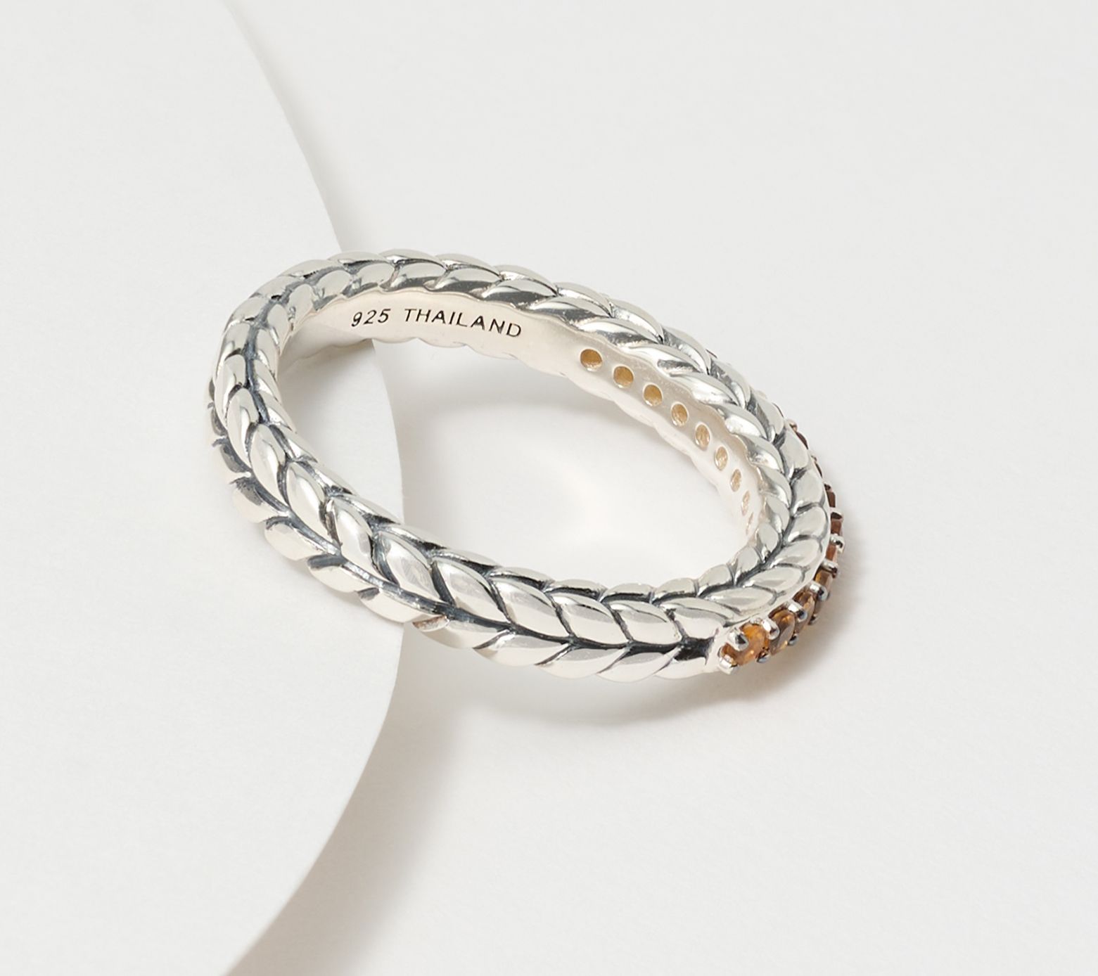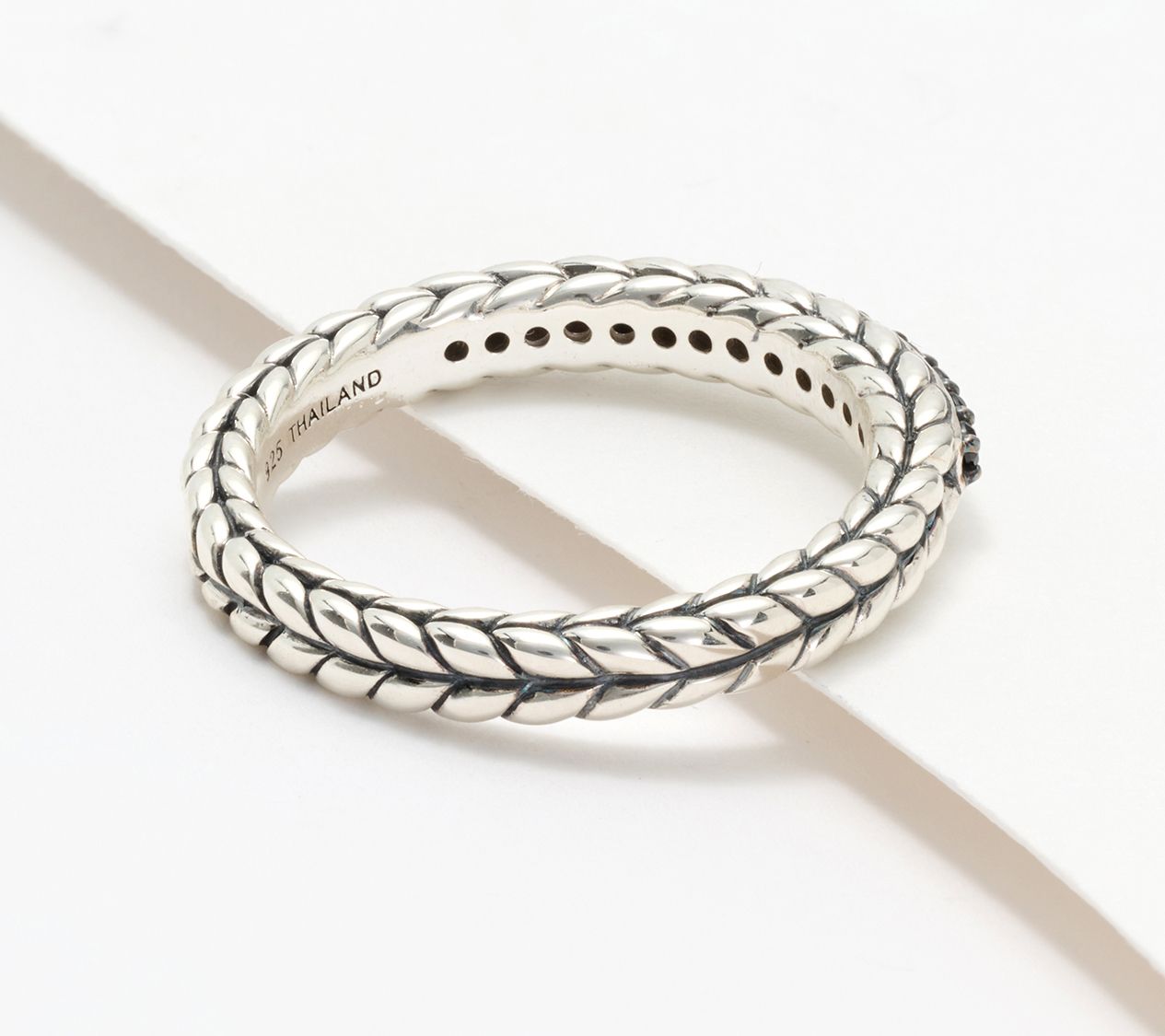 Brandishing a basket-weave design, this textured band adds a sophisticated touch to your everyday style. Gemstone accents give just the right hint of shimmer, while the polished and oxidized sterling silver finish adds a rich, dimensional look. Effortless to stack, lovely solo. From JAI.