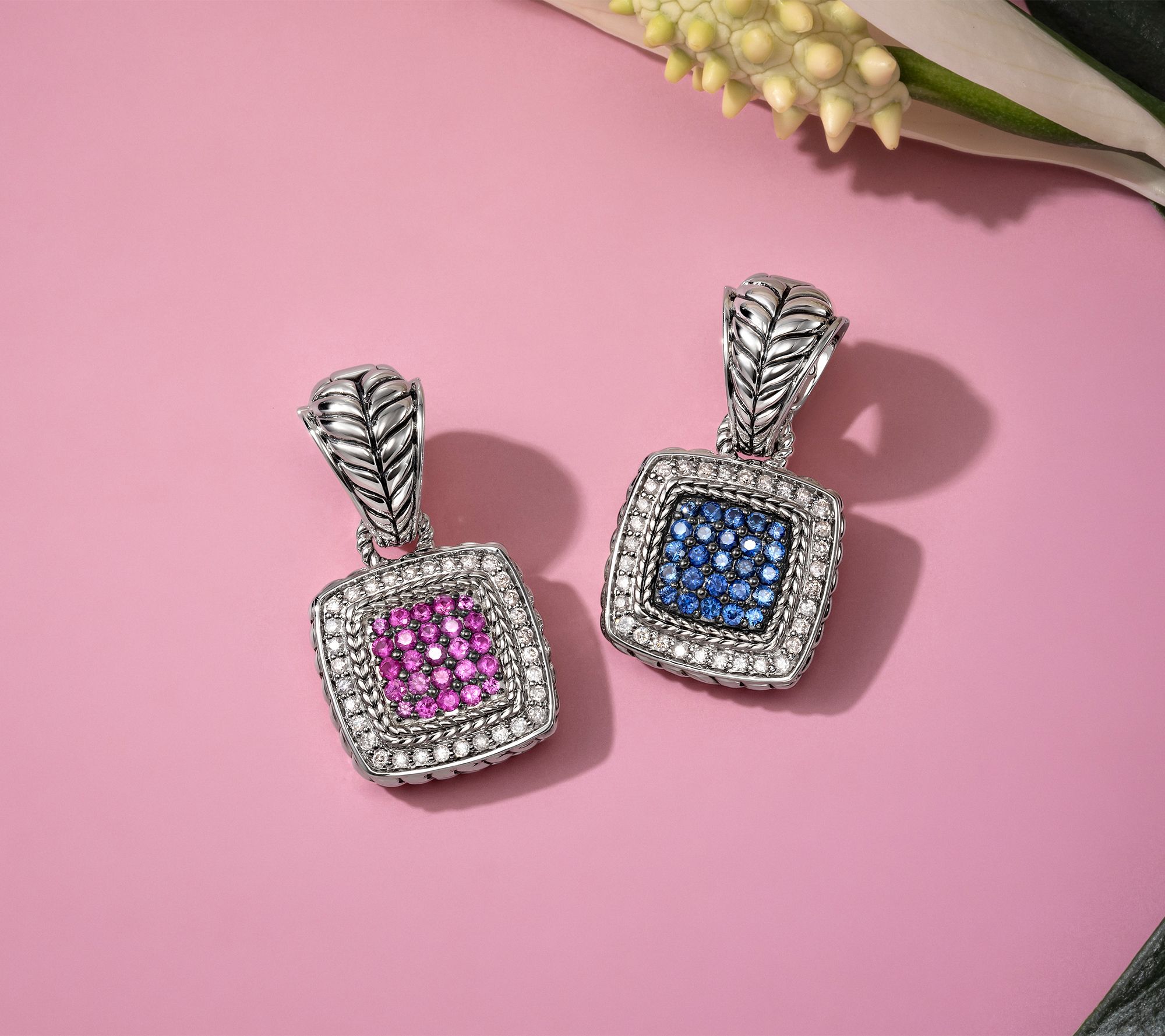 Cushion shape with pave-set center sapphires surrounded by halo of pave-set diamonds; basketweave texture on side and bail; polished finish; oxidized