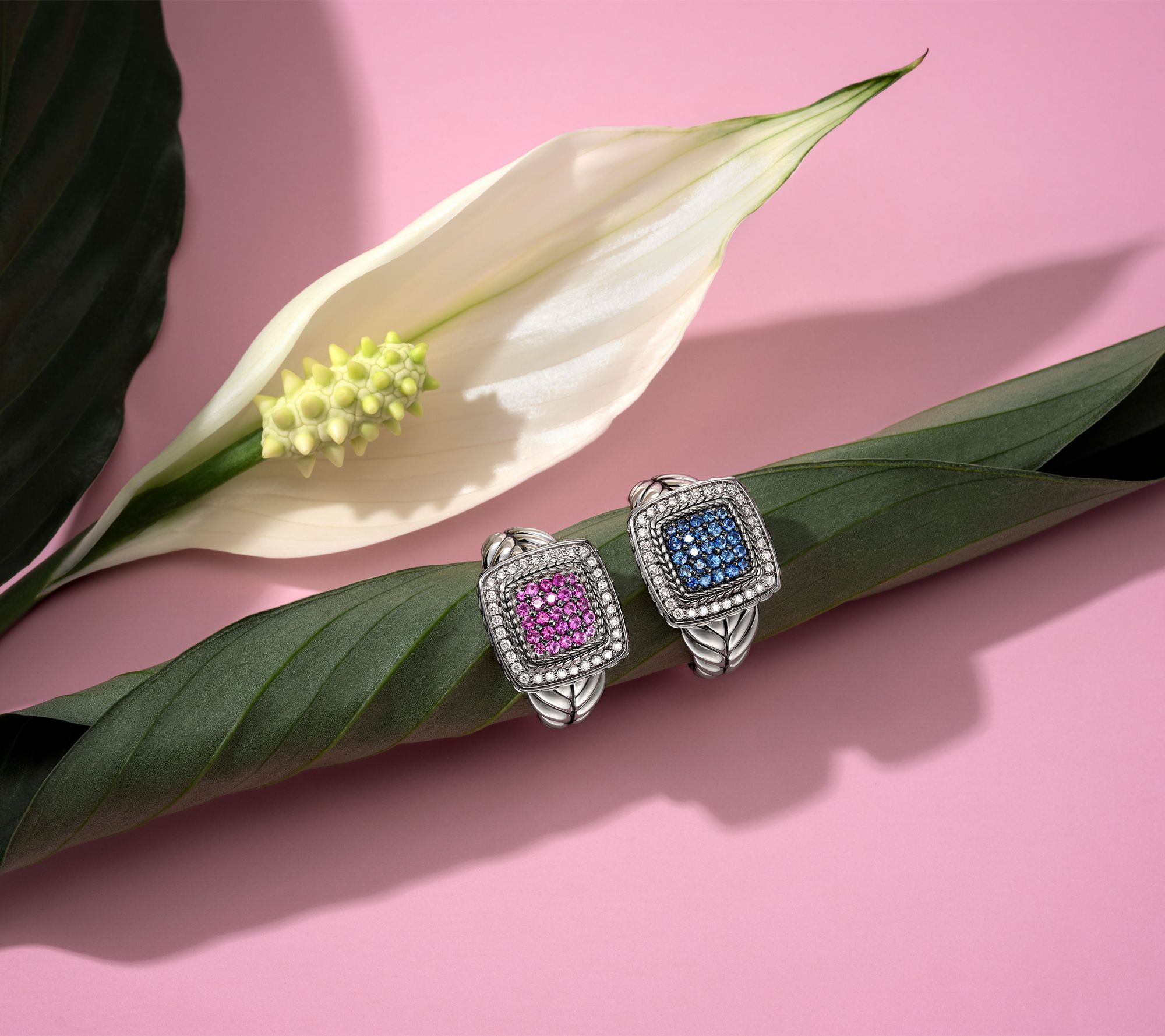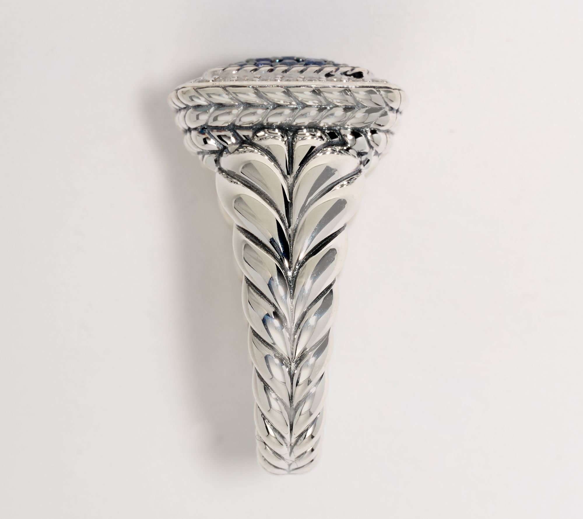 A sparkling treasure for your finger, this sterling silver sapphire and diamond ring by JAI is a stunning addition to any jewelry collection. With its cushion shape and intricate basket-weave texture, it offers a polished and oxidized finish that beautifully encapsulates the pave-set diamonds and gemstones. From JAI.