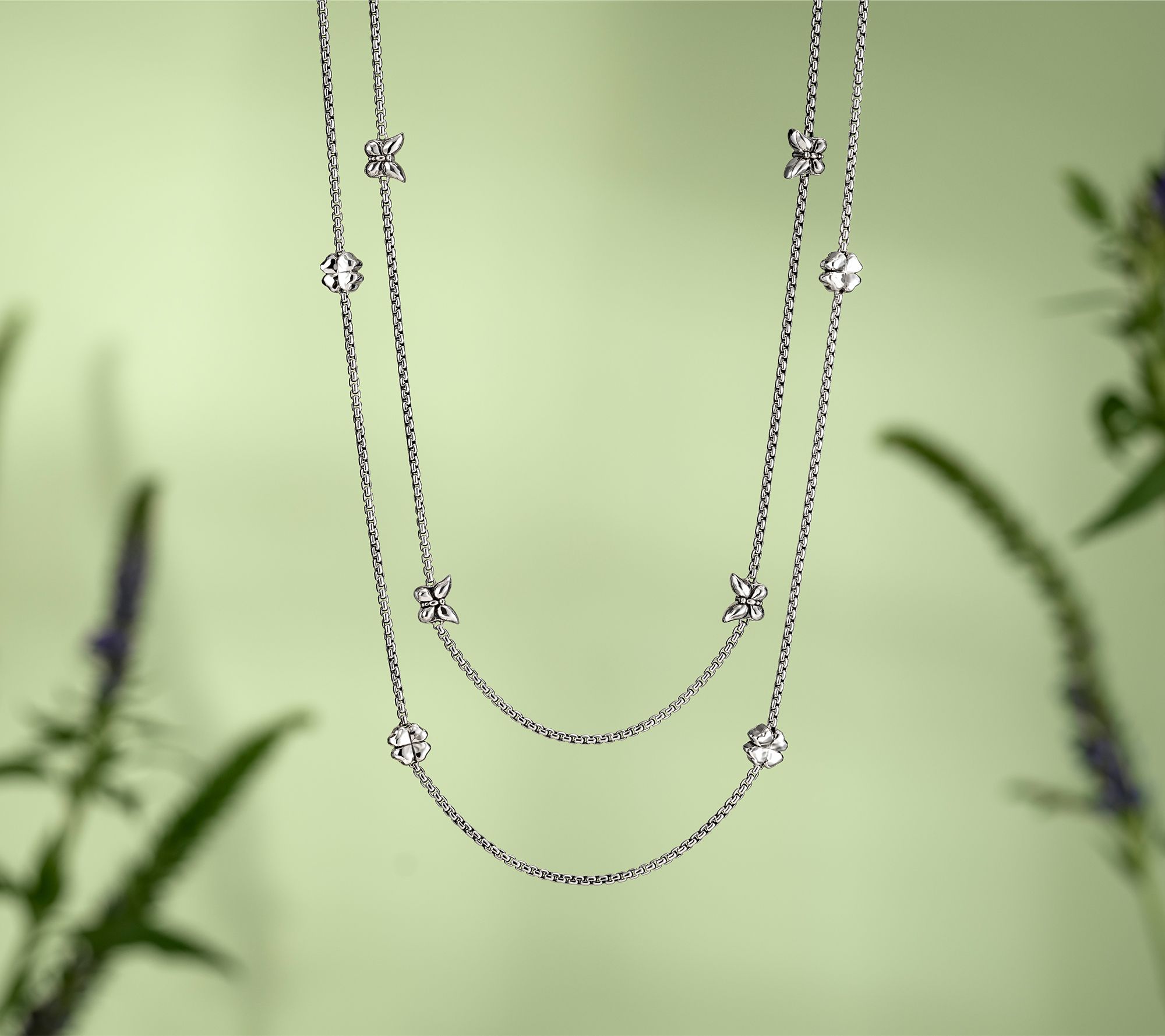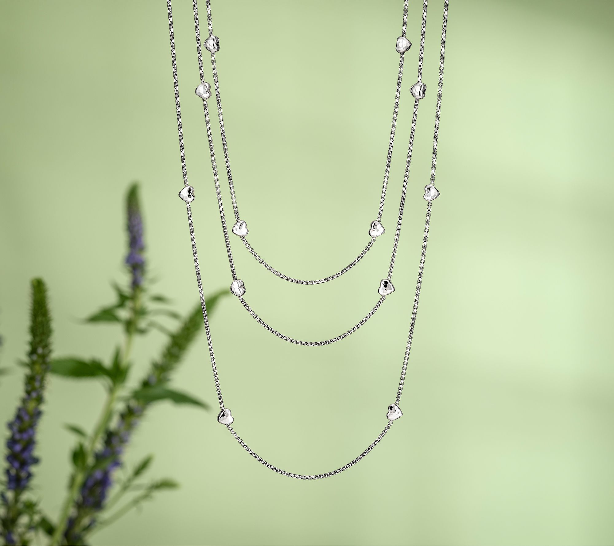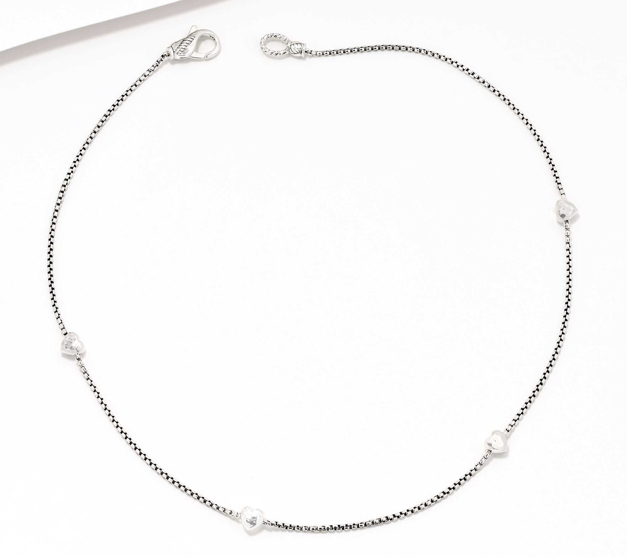 • Baby box chain; four Symbols of Love stations; oxidized; polished finish