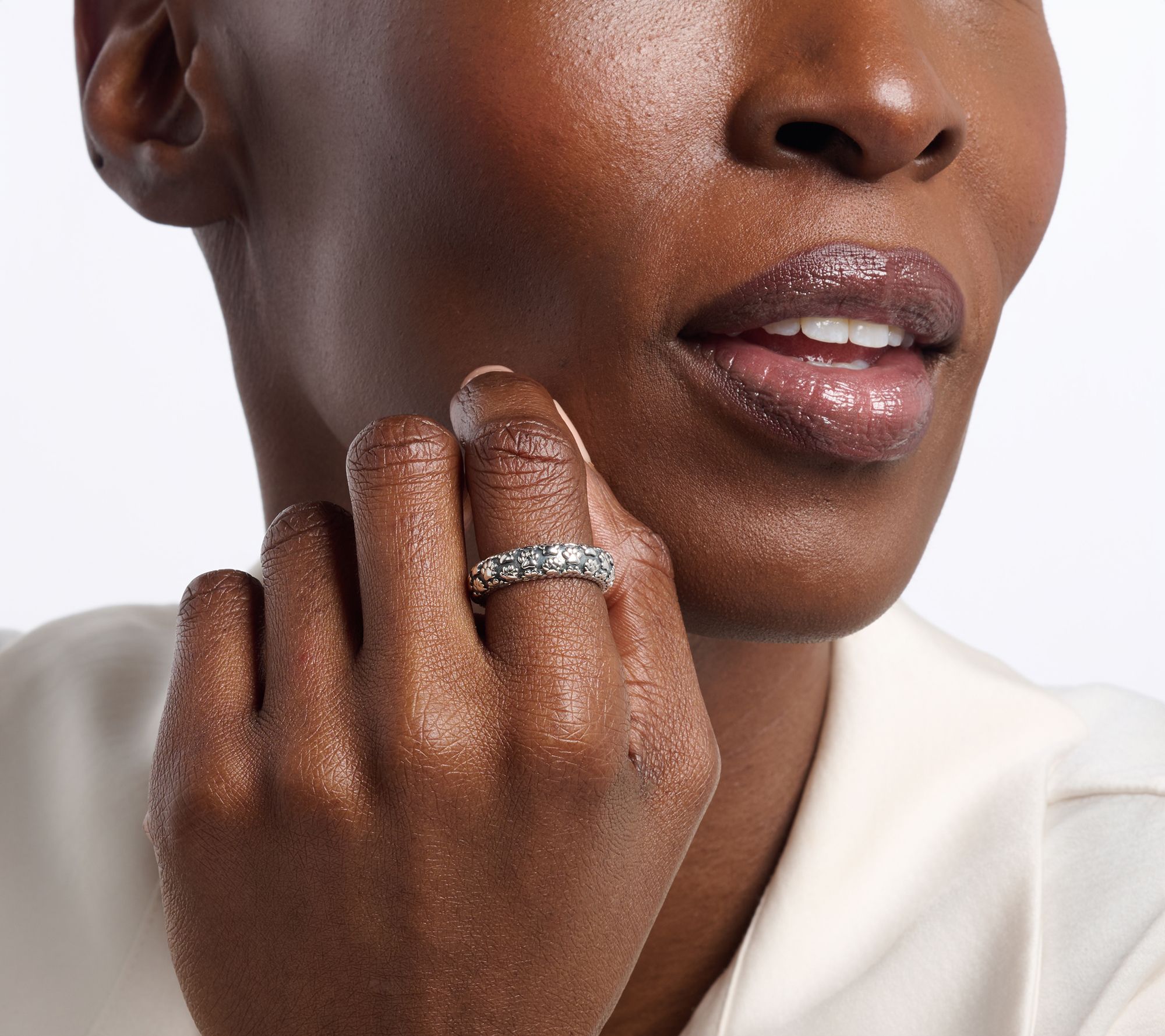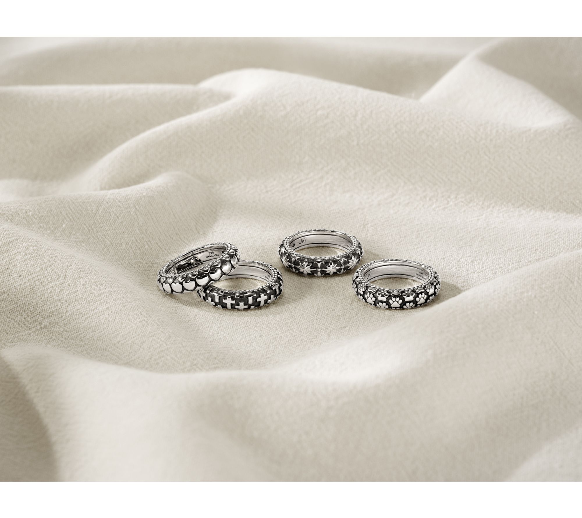Let this sterling silver symbols of love band ring by JAI add meaning to everyday moments, whether shared with someone special or kept as a personal reminder. Dimensional carvings and a polished, oxidized finish enhance the basketweave edges, while your choice of motif lets you wear your story -- your way. From JAI.