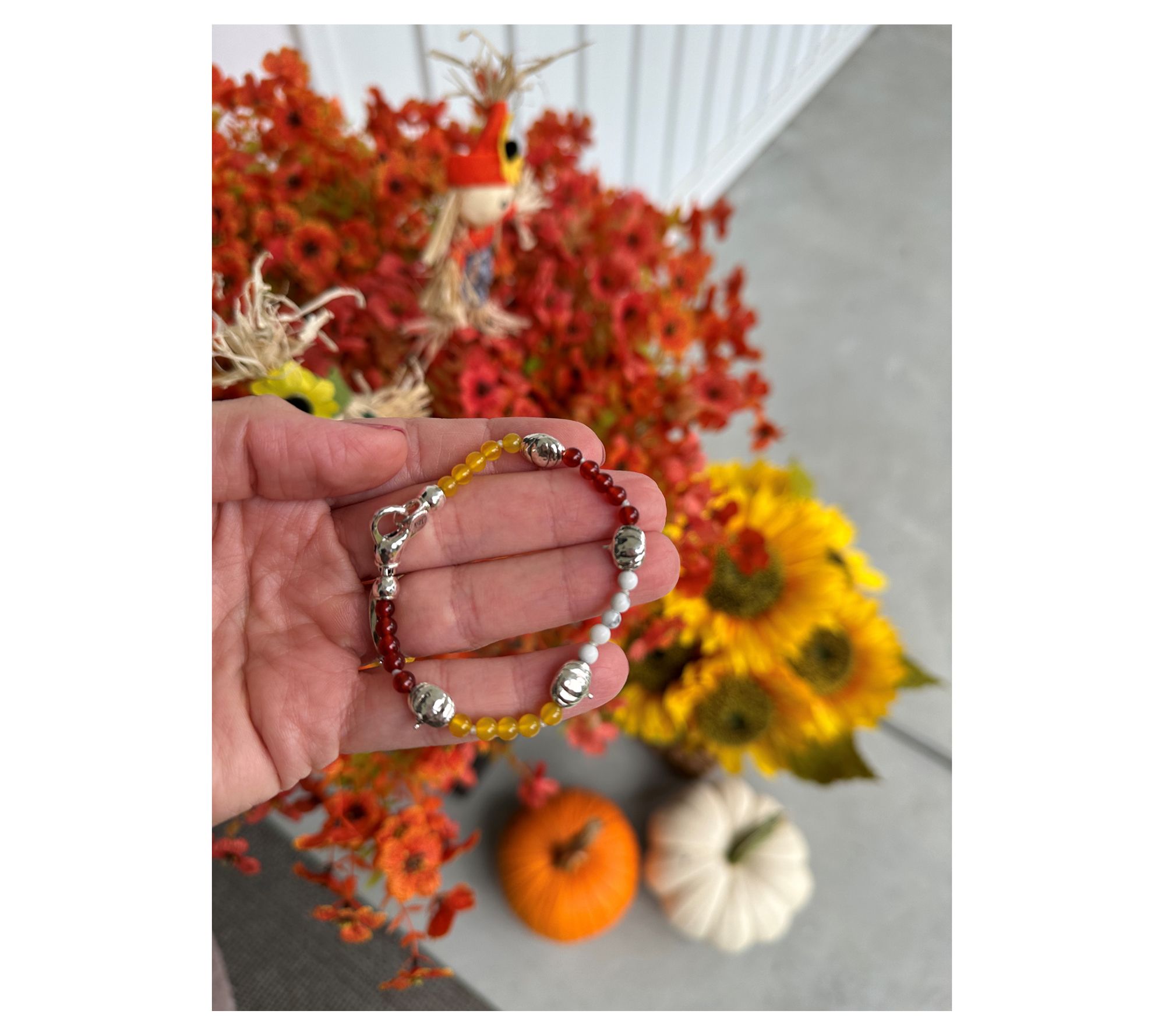 - Sterling silver pumpkin stations; yellow agate, white howlite, and carnelian bead stations; slightly oxidized; polished