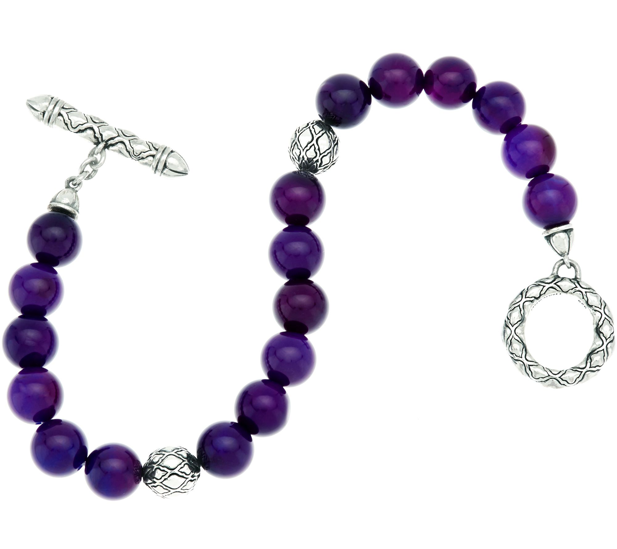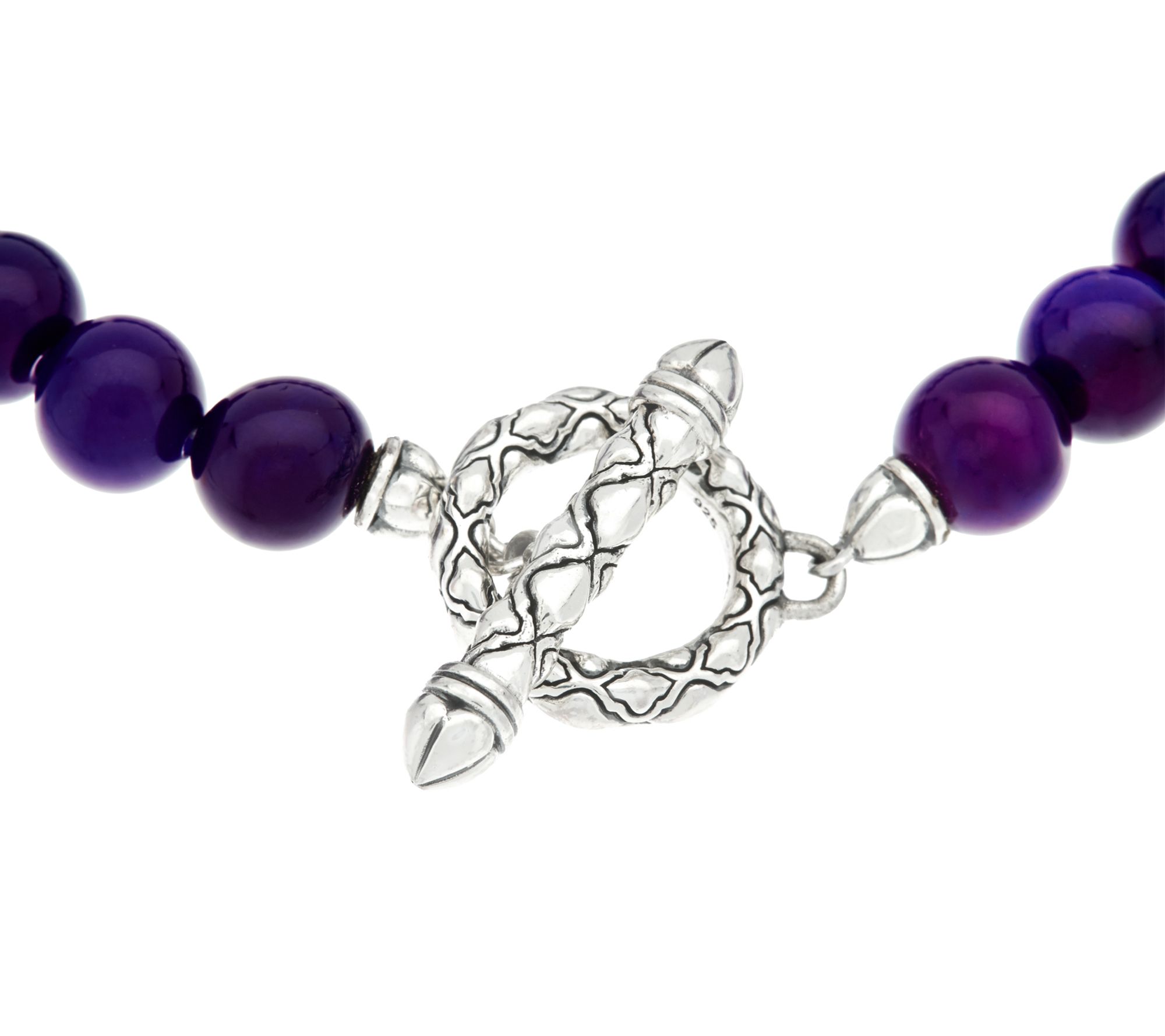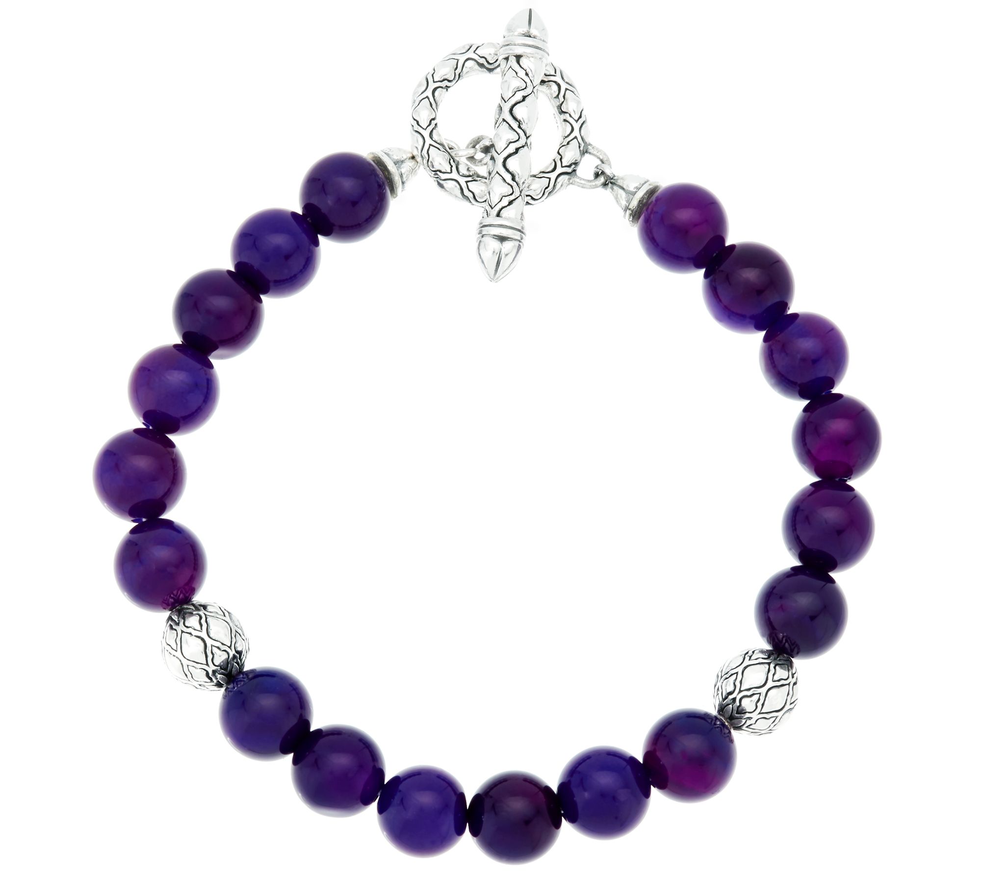 Beautiful from every angle. Gorgeous gemstone beads are punctuated by textured sterling silver stations along this sensational JAI bracelet. The Taj texture on the stations is continued on the loop-and-toggle closure for a phenomenal look from end to end. From JAI.