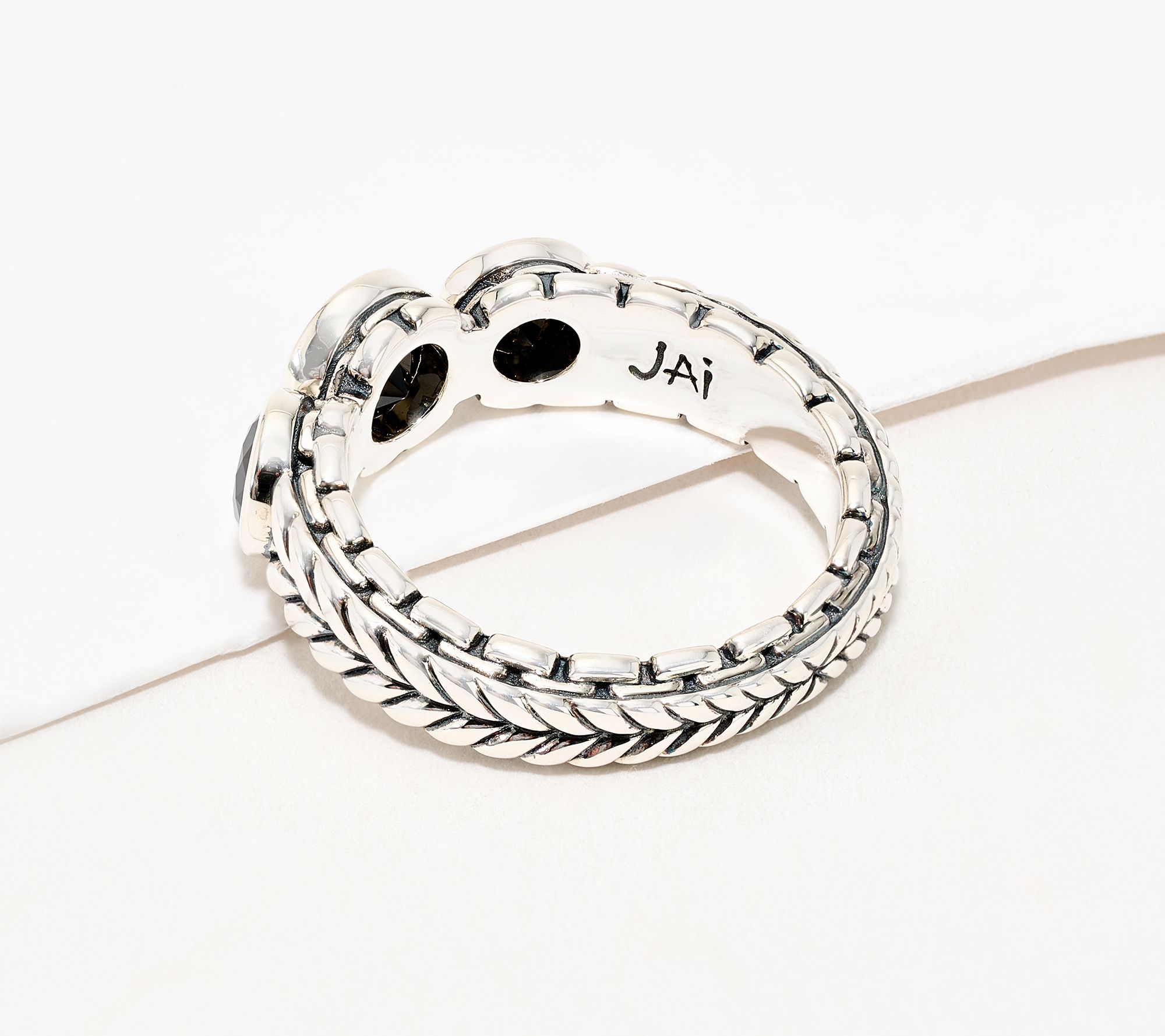 Whether you're refreshing your jewelry box or highlighting a favorite outfit, this sterling silver triple gemstone band ring stands out with its rich textures and colorful gemstones. The intricate basketweave and box chain details wrap around three bezel-set, round stones, creating a versatile accent for everyday wear or special occasions. From JAI.