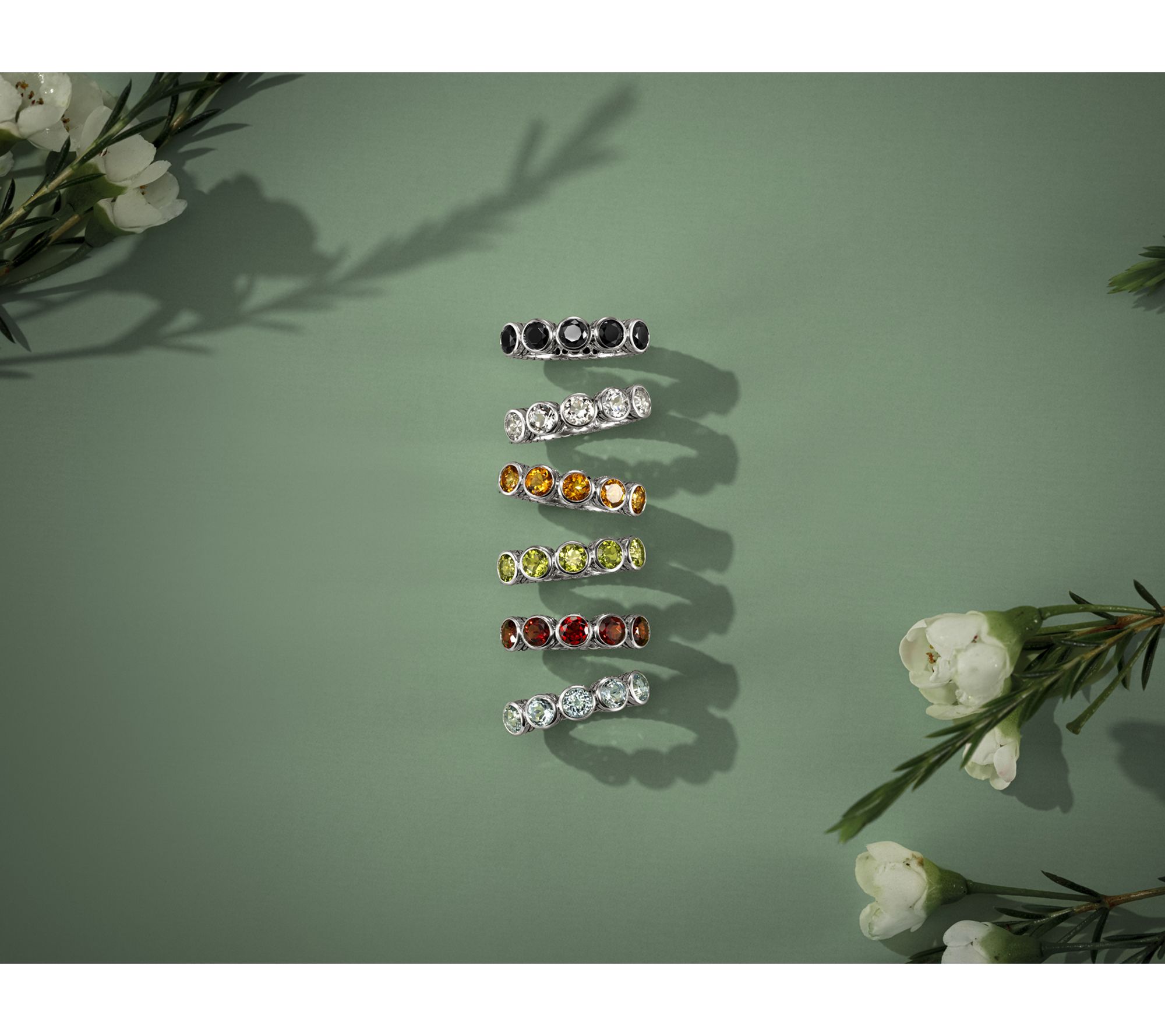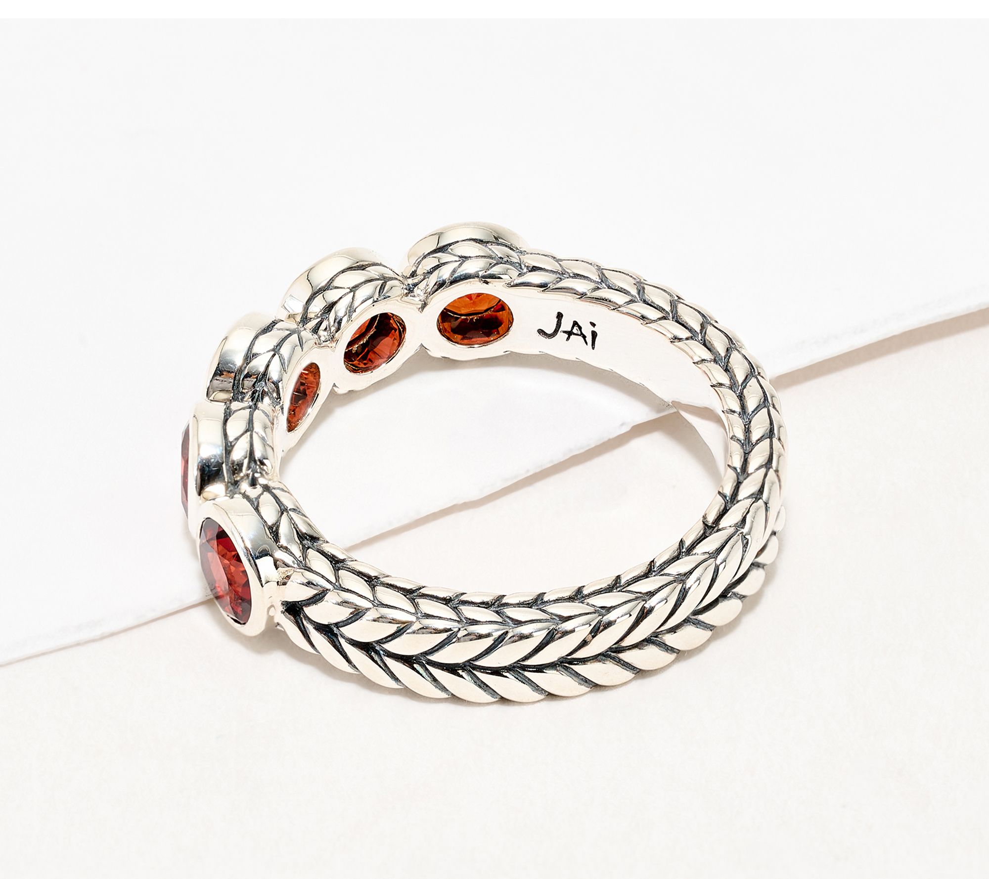 Stacked solo or layered with your favorite styles, this sterling silver gemstone ring brings a pop of color and textural intrigue to your everyday look. Five bezel-set, round gemstones catch the light against an intricate basketweave band, creating a chic statement whether you're in jeans or dressed up for an evening out. From JAI.